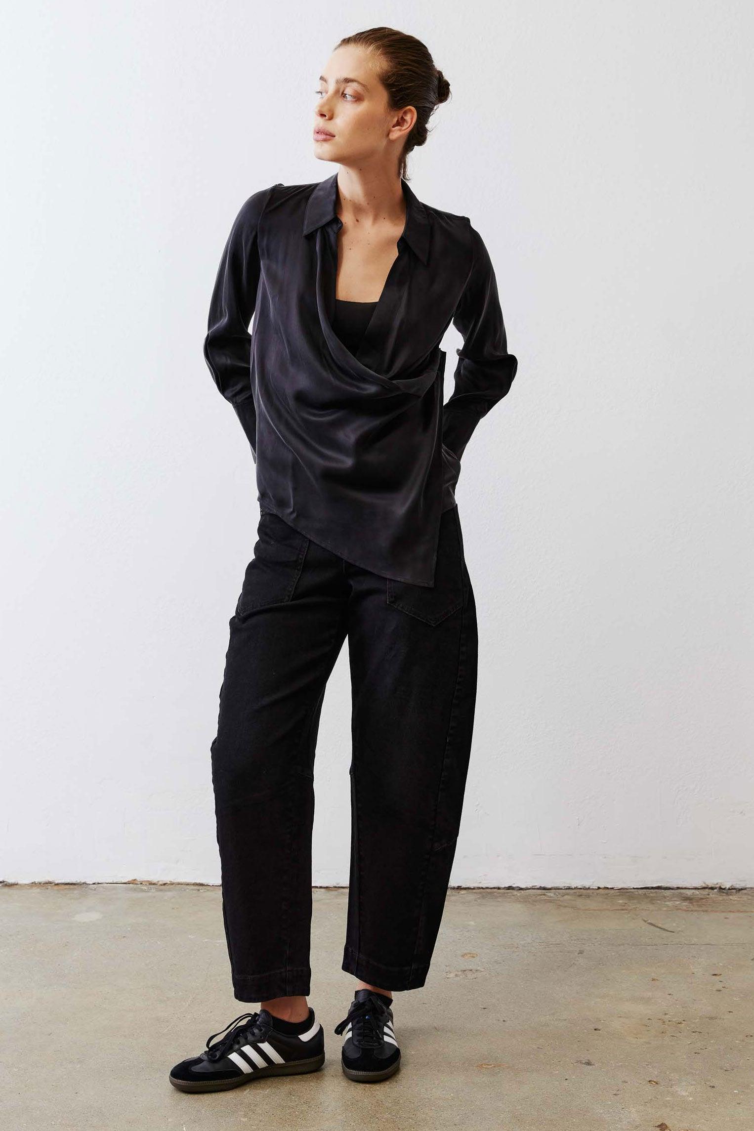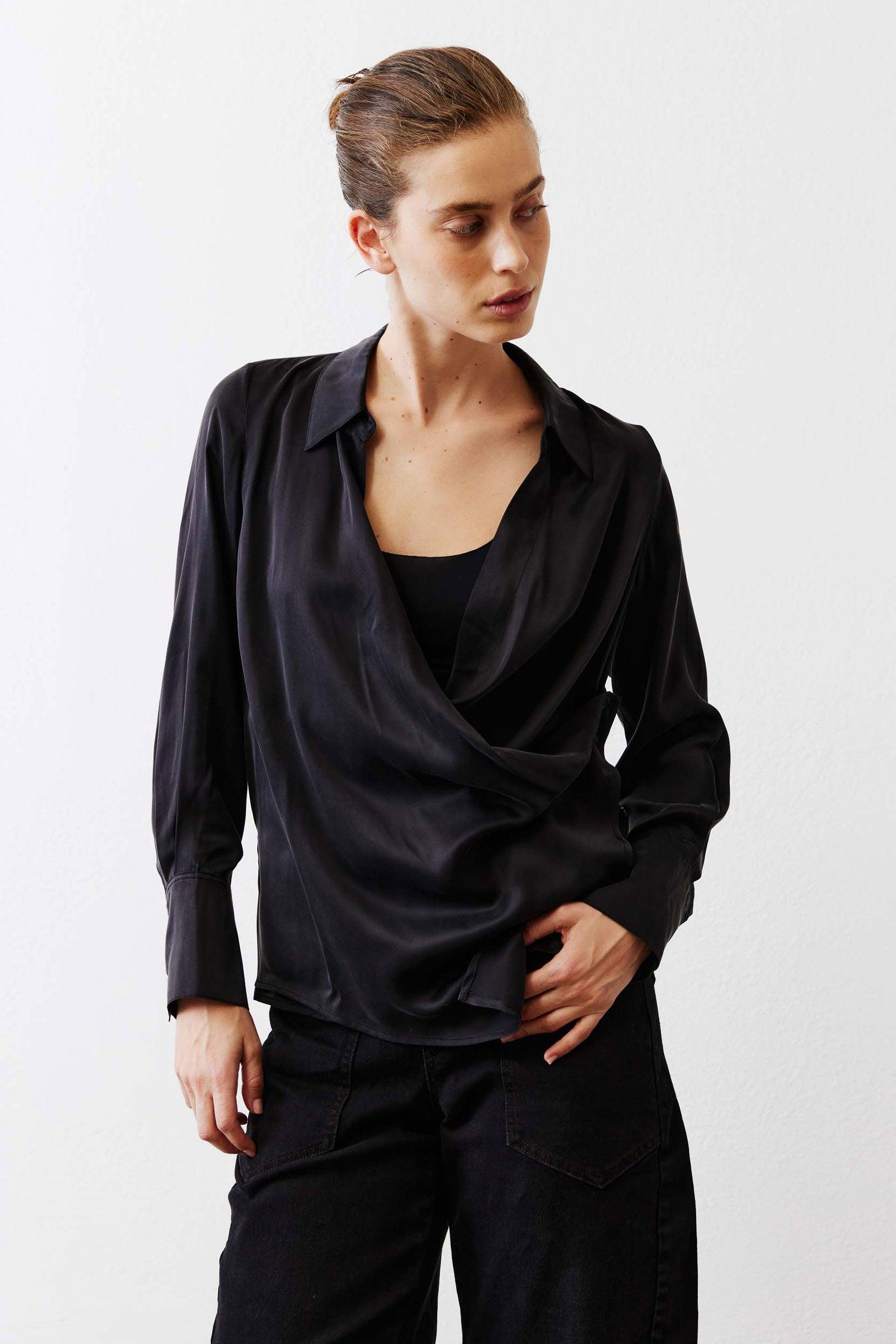 A sophisticated wrap blouse in fluid washable silk, designed with a softly structured collar for timeless elegance. Perfect for desk-to-dinner dressing with a polished yet effortless feel.