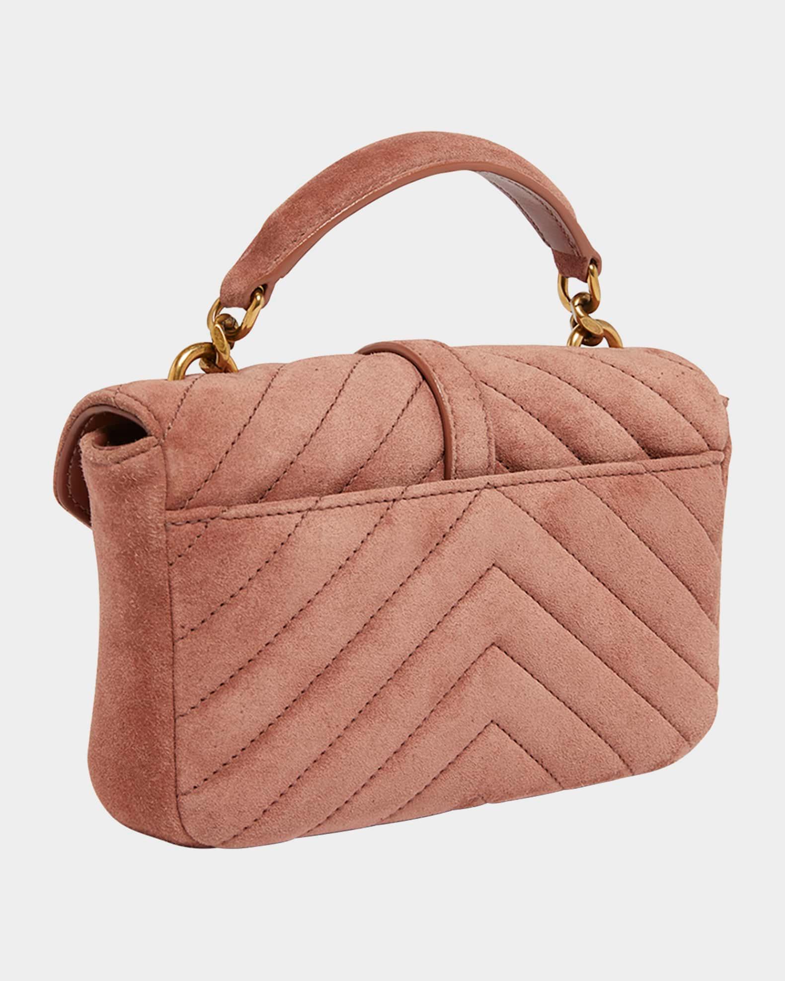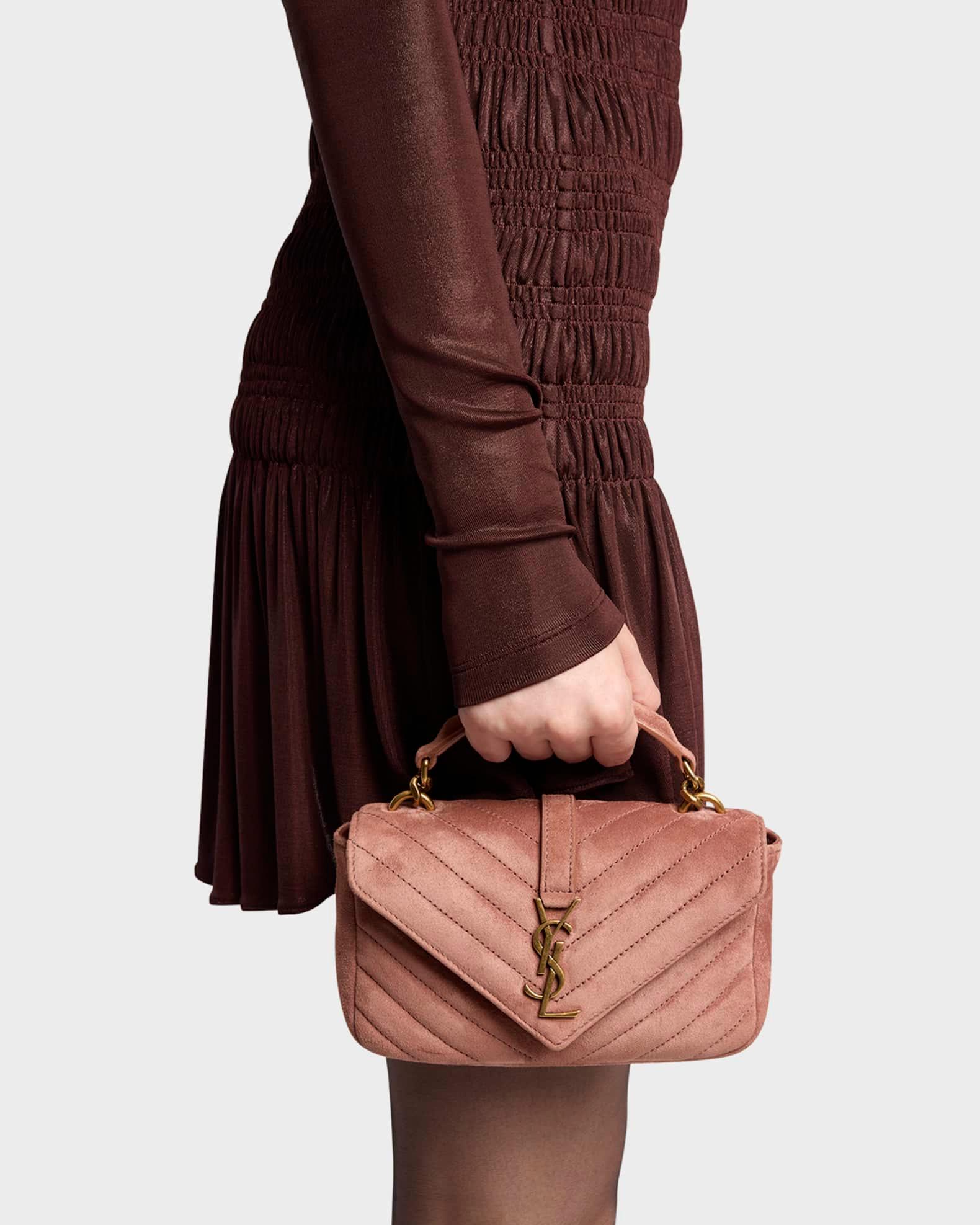 Saint Laurent "College" shoulder bag in chevron pattern suede Features signature YSL logo lettering Top handle Detachable, adjustable chain/suede crossbody strap Can be worn as a top handle or shoulder/crossbody bag Envelope flap top with magnetic closure Exterior, back slip pocket Interior, one slip pocket Golden hardware Approx. 5.1"H x 7.8"W x 2.6"D Made in Italy