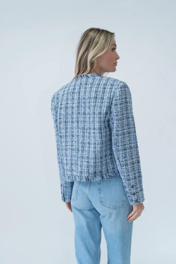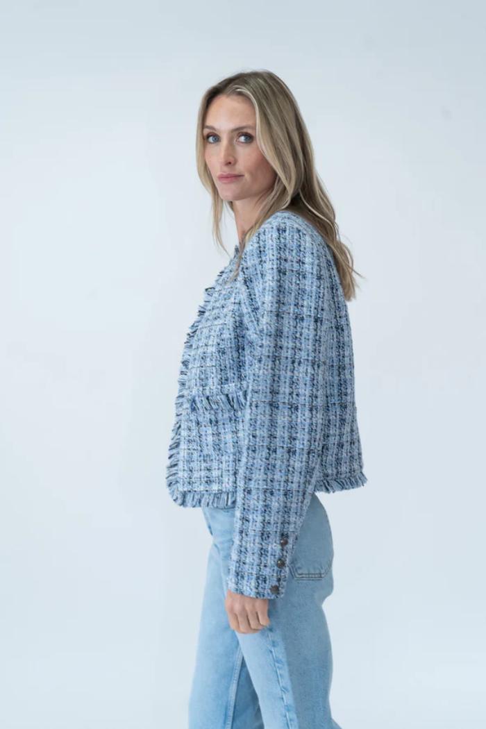 Stylish, fun, and flirty--Collins is here! In a classic blue color, this blazer has fringed trim throughout. Straight-fitting, tailored to the body--wear this with jeans and sneakers--or elevate it with a camisole, skirt, and kitten heels!