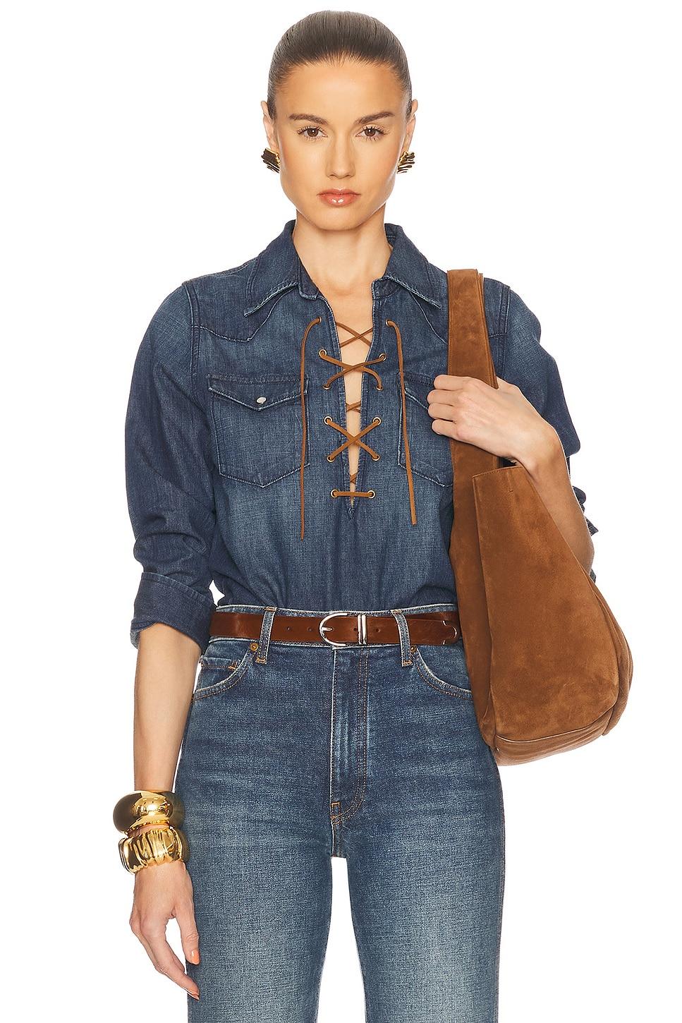 shirt100% cotton / Made in USA / Machine wash / Front partial tie-up closure / Breast flap pockets with button closures / Buttoned cuffs / Denim fabric / Our Style No. NILF-WS532 / Manufacturer Style No. 12945-W46 / Model is wearing size S.