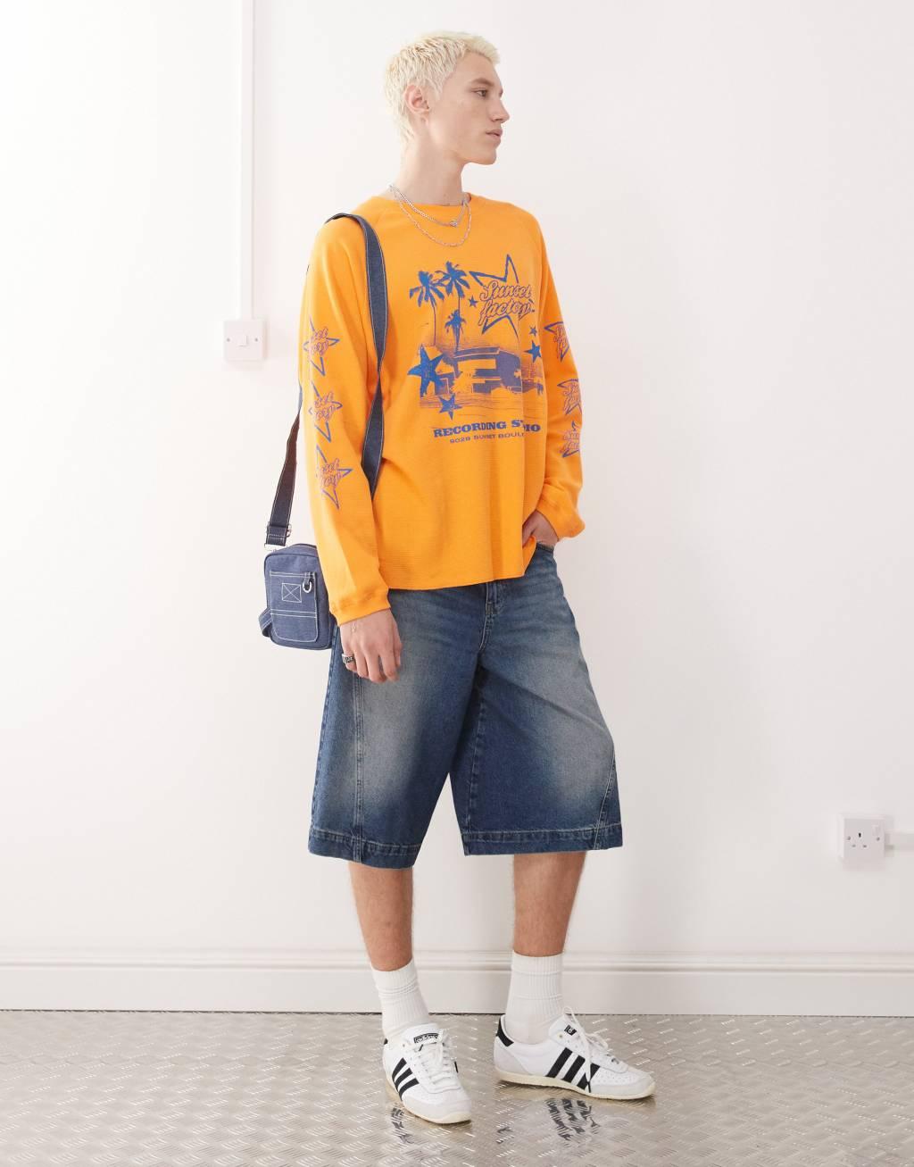 COLLUSION Long sleeve skater fit T-shirt in orange with blue print
