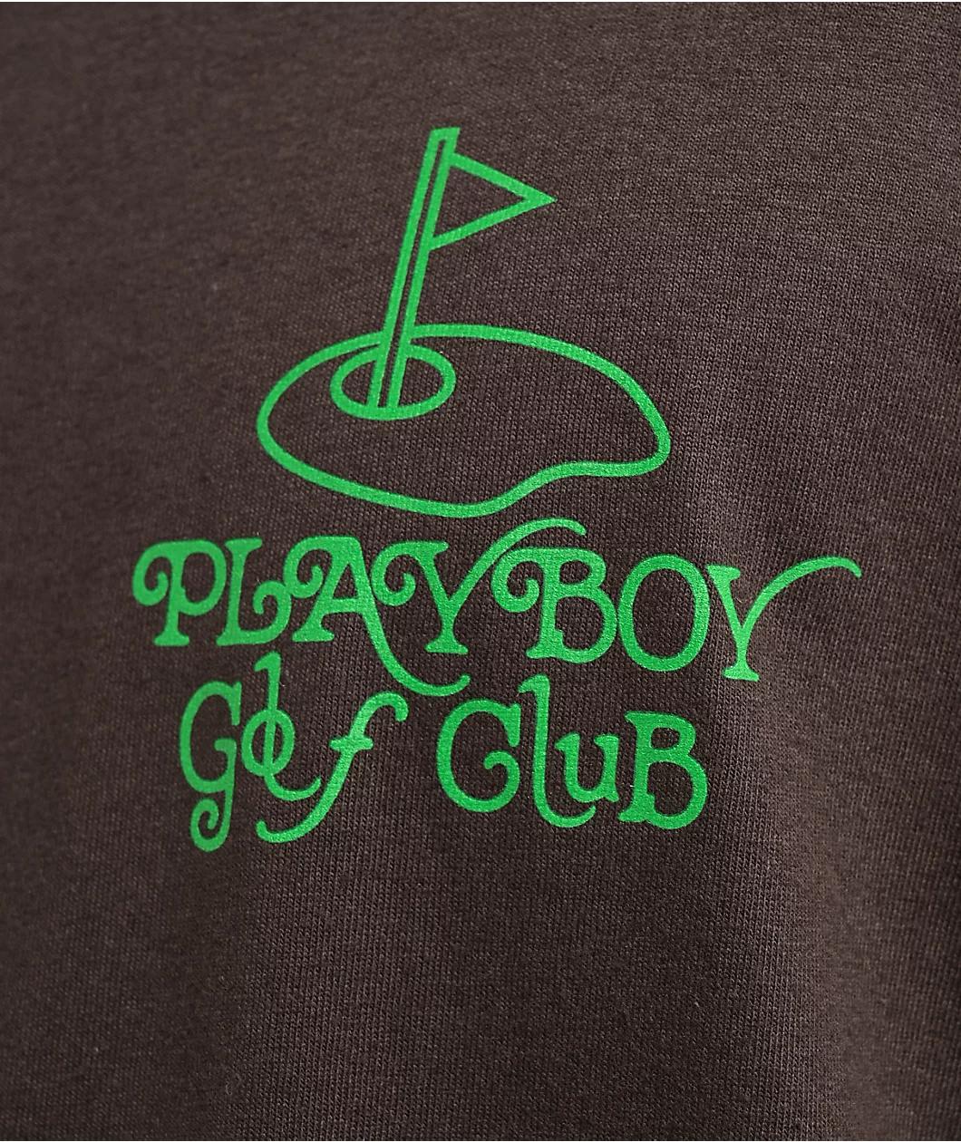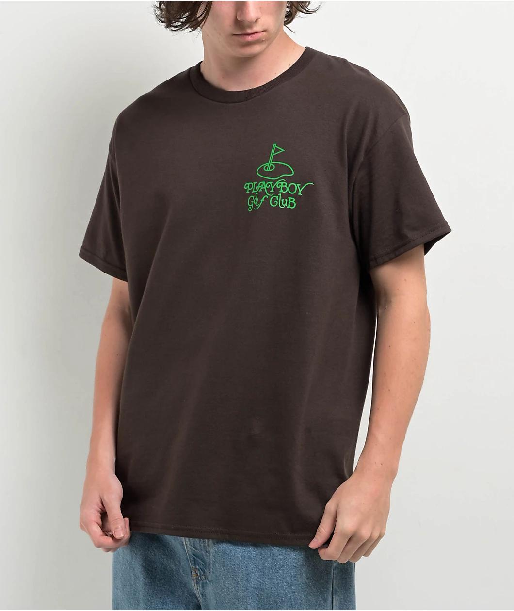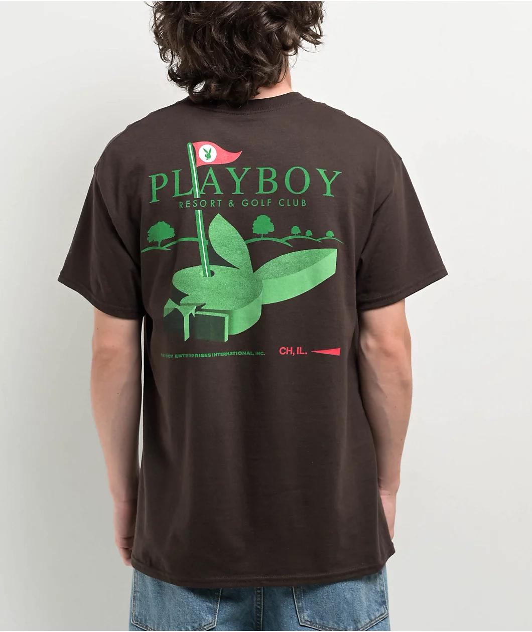 Color Bars and Playboy team up to welcome the Bunny Hills t-shirt in a brown colorway with screen-printed graphics. A putting green is shown on the left side of the tee reading "Playboy Golf Club" underneath whereas the back displays a 3D Bunny logo