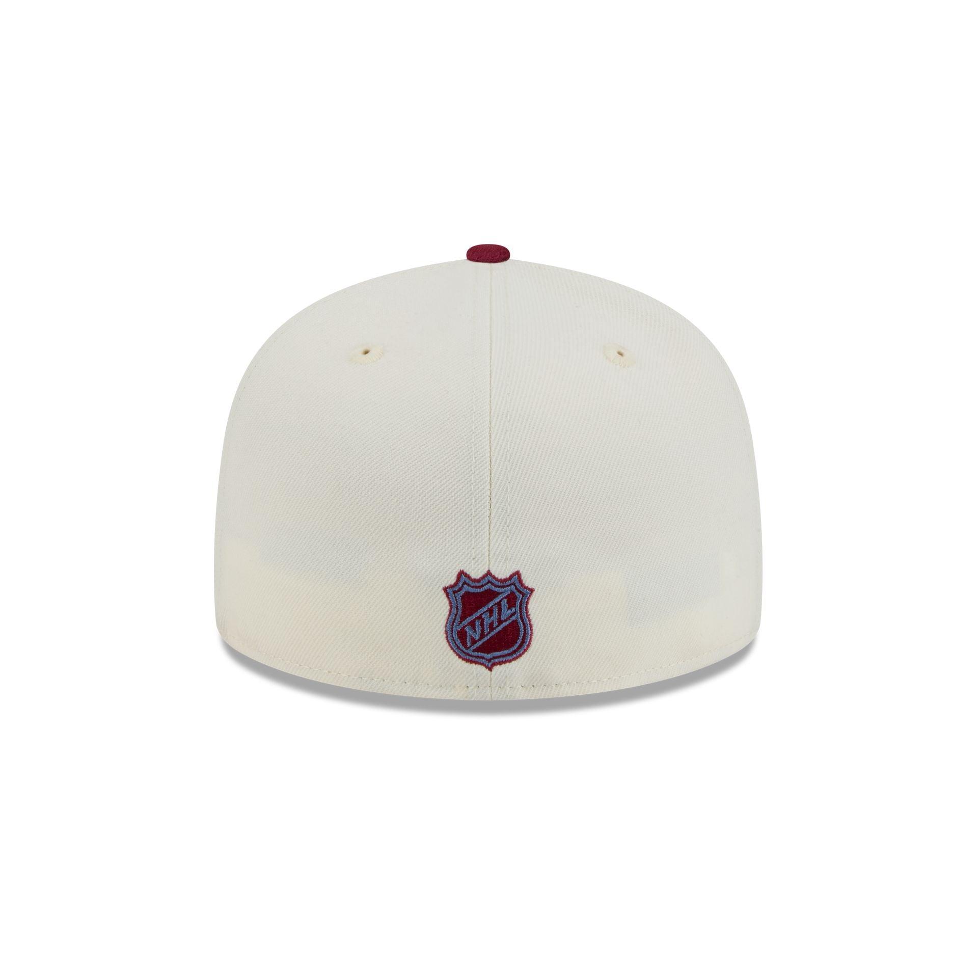 The Colorado Avalanche Chrome White 59FIFTY Fitted Cap features an embroidered Avalanche logo at the front panels with a matching NHL Shield at the rear and a gray undervisor.