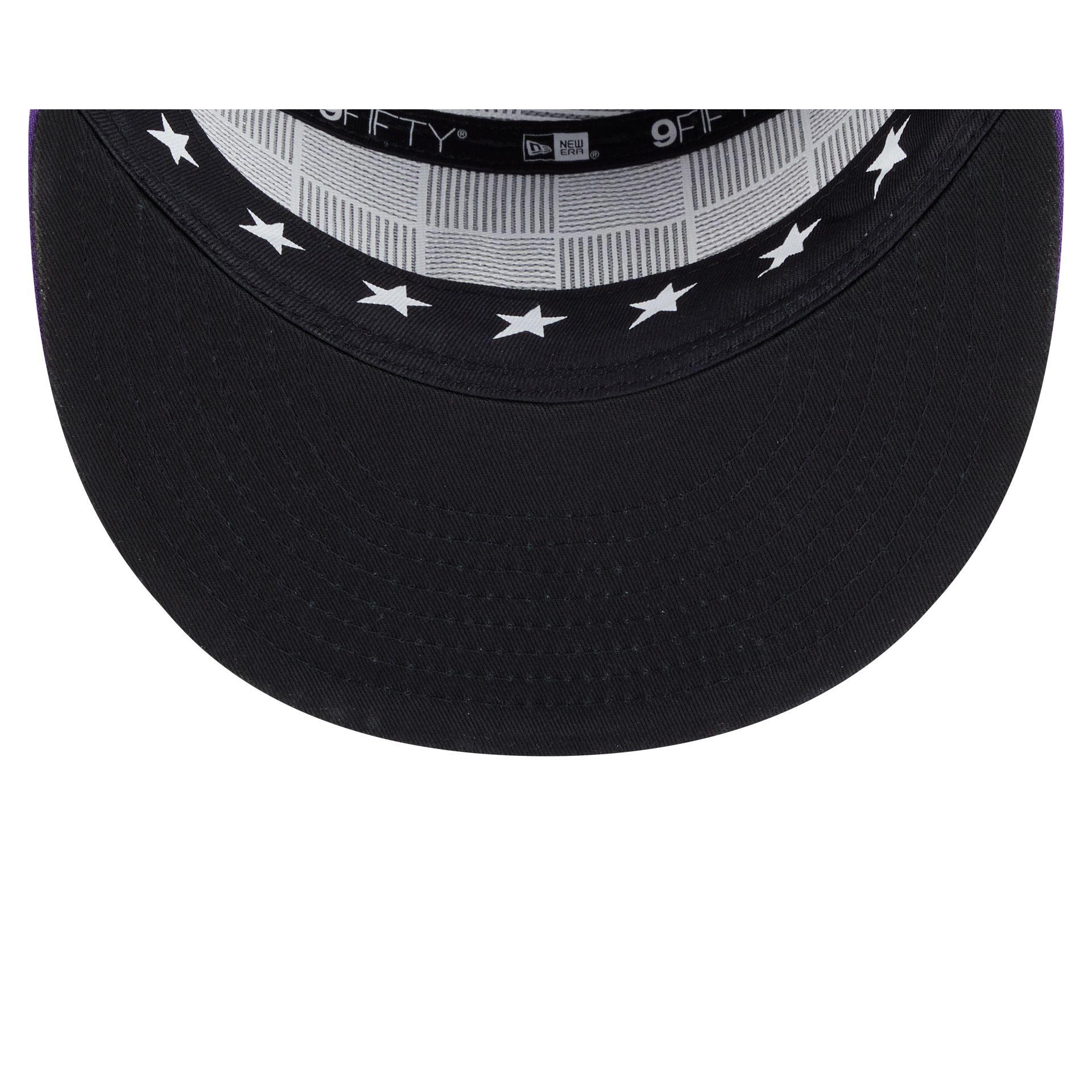 The Colorado Rockies 2025 All-Star Game Split Panel 9FIFTY Snapback features an embroidered Rockies logo at the front panels against a split-crown construction with breathable mesh fabric at the side and rear panels. Additional details include stars at the top panel, a 2025 All-Star Game patch at the right-wear side, the MLB Batterman logo above a snapback closure at the rear, and a black undervisor. The cap also features screen-printed stars on the sweatband.
