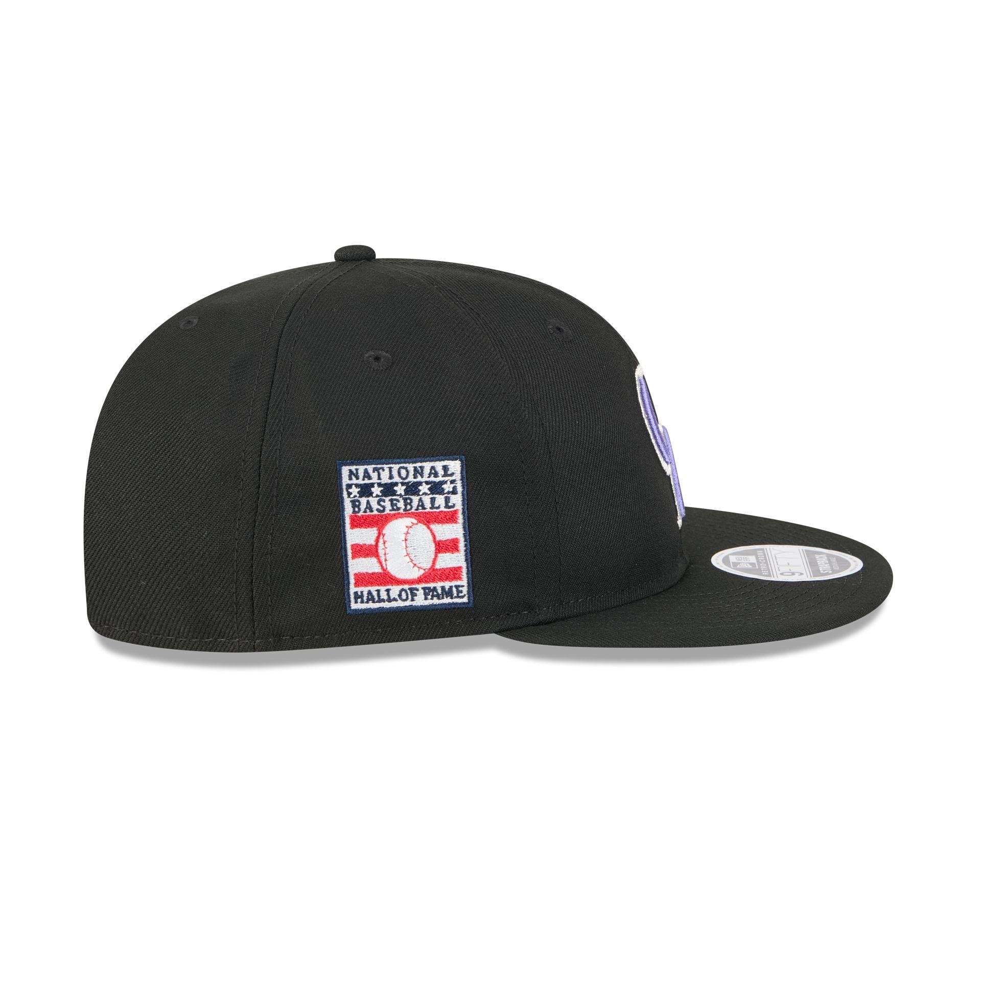 The Colorado Rockies Hall of Fame 2025 Retro Crown 9FIFTY Snapback features an embroidered Rockies Cooperstown logo at the front panels with a matching MLB Batterman logo above a snapback closure at the rear, a National Baseball Hall of Fame patch at the right-wear side, and a green undervisor.