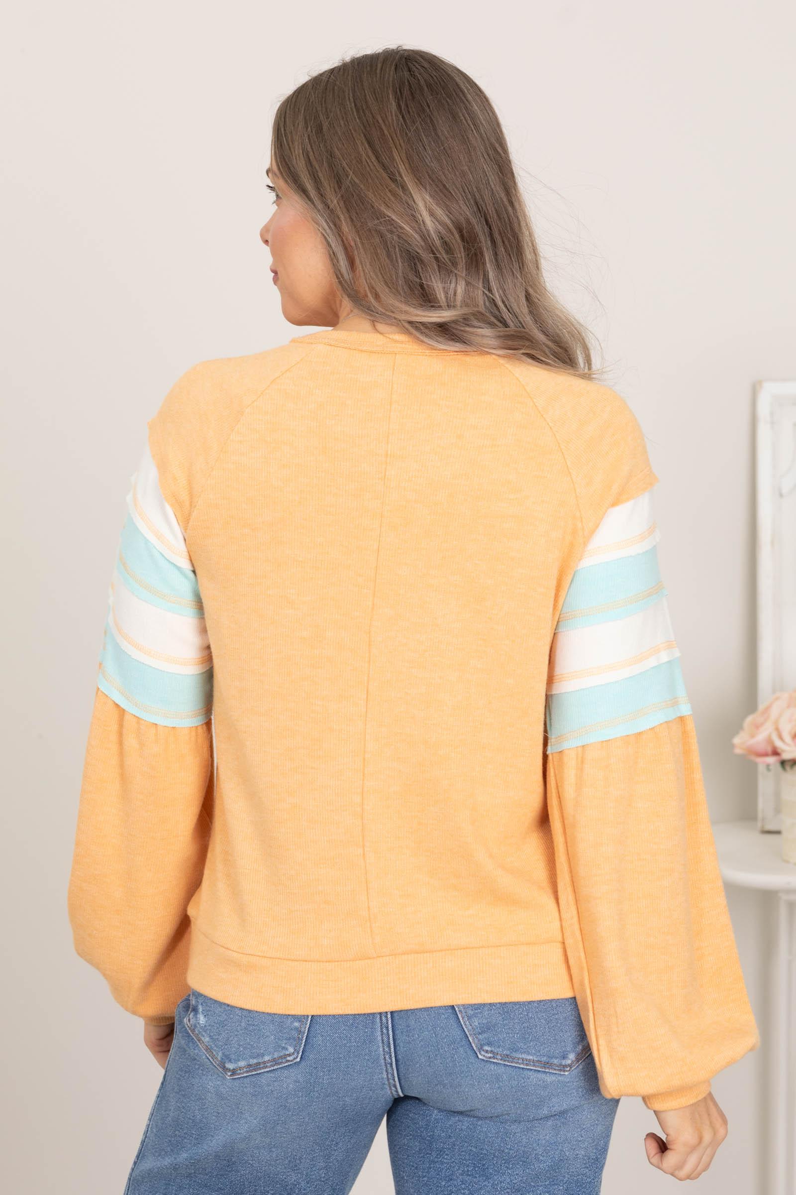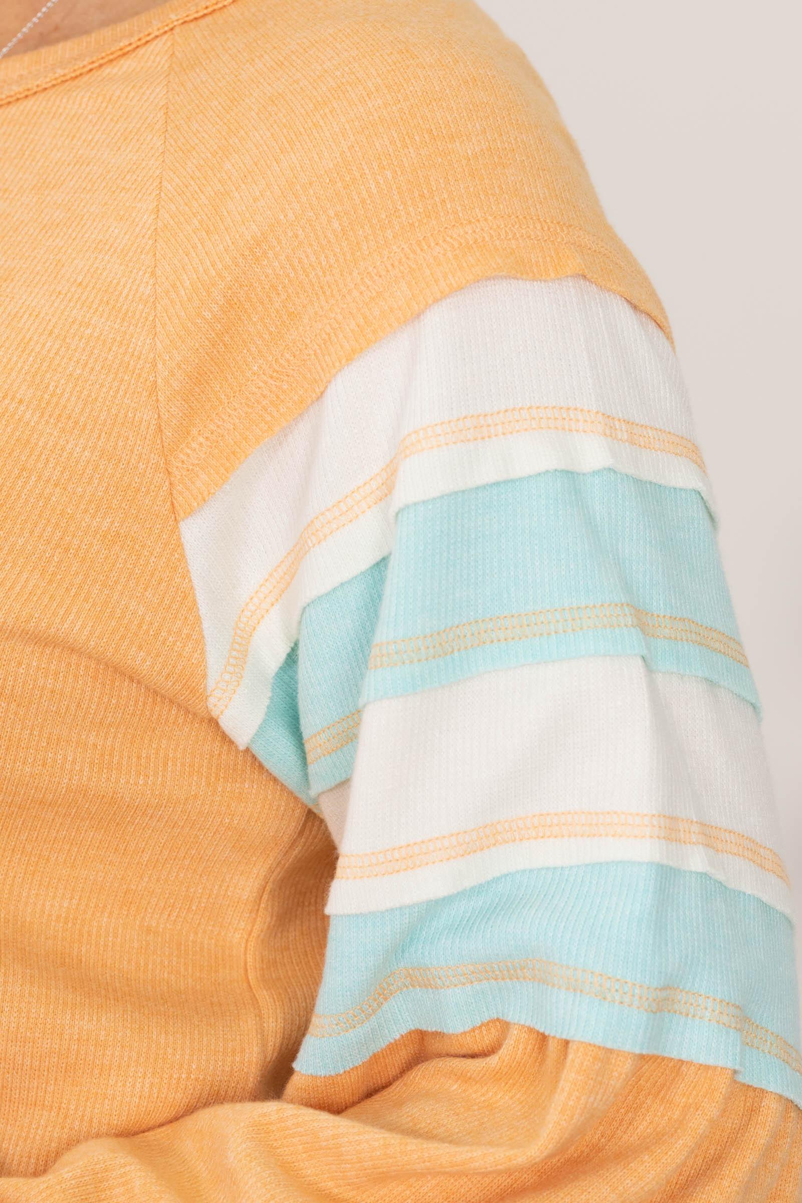 Product Details Colors: Peach, Aqua, Ivory Print: Colorblock Neckline: Round Sleeve: Long Sleeve Hemline: Straight Brand: New In Material and Care Self: 43% Rayon 33% Tencel 19% Nylon 5% Spandex Hand Wash Cold Hang/Line Dry Size and Fit Small: Bust 40" Waist 39" Length 23" Medium: Bust 42" Waist 40" Length 23.5" Large: Bust 43" Waist 41" Length 24" Erica is 5’7” and wearing her true size small