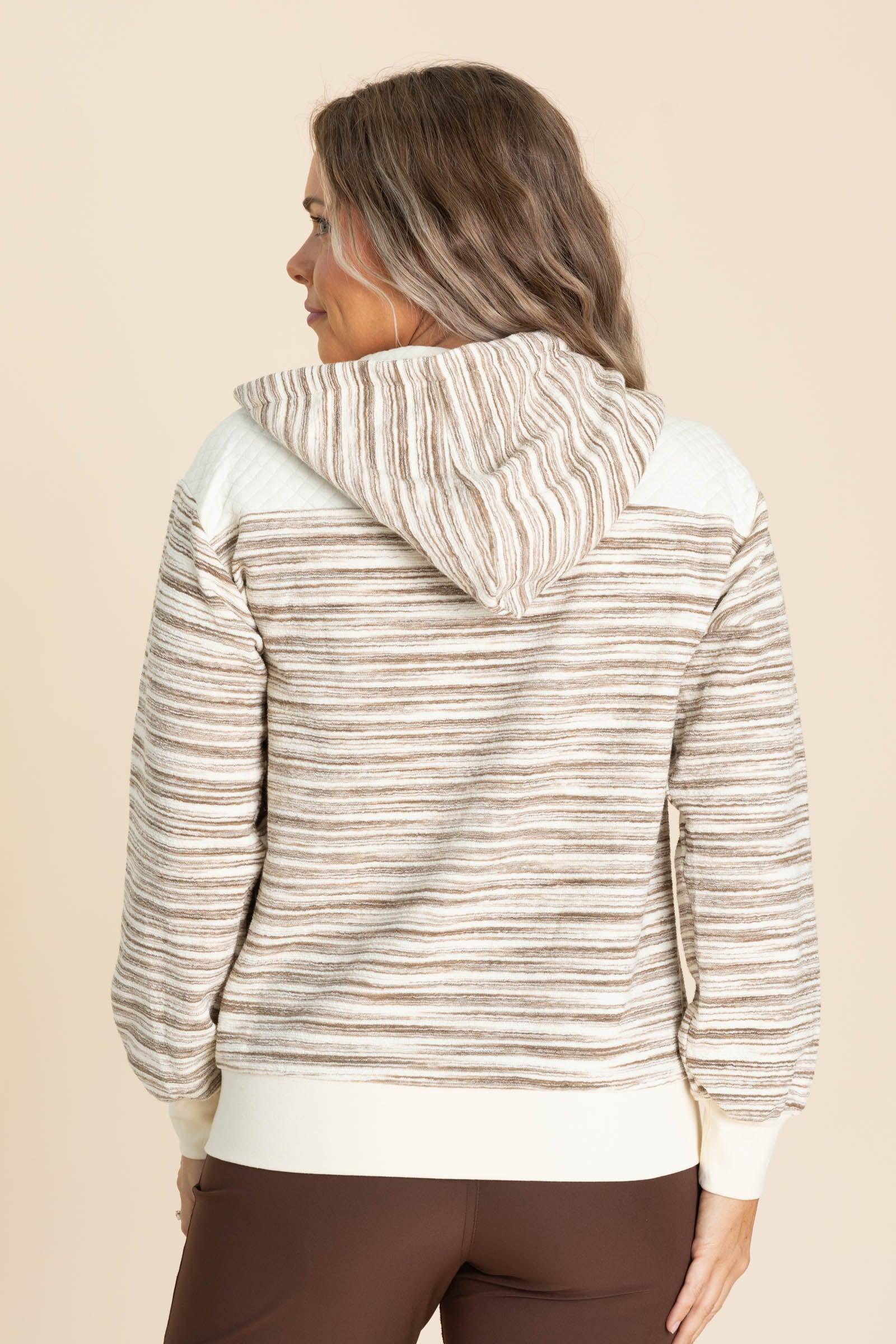 Product Details Colors: Taupe, Cream/ Navy, Grey, Off White Print: Stripe Neckline: Zip Up Sleeve: Long Sleeve Hemline: Straight Brand: Staccato Material and Care Self: 60% Cotton 40% Polyester Contrast: 92% Cotton 7% Spandex Hand Wash Cold Hang/ Line Dry Size and Fit Small: Bust 40" Waist 38" Length 25" Medium: Bust 42" Waist 40" Length 25.5" Large: Bust 44" Waist 42" Length 26" X Large: Bust 46" Waist 44" Length 26.5" Erica is 5’7” and wearing her true size small
