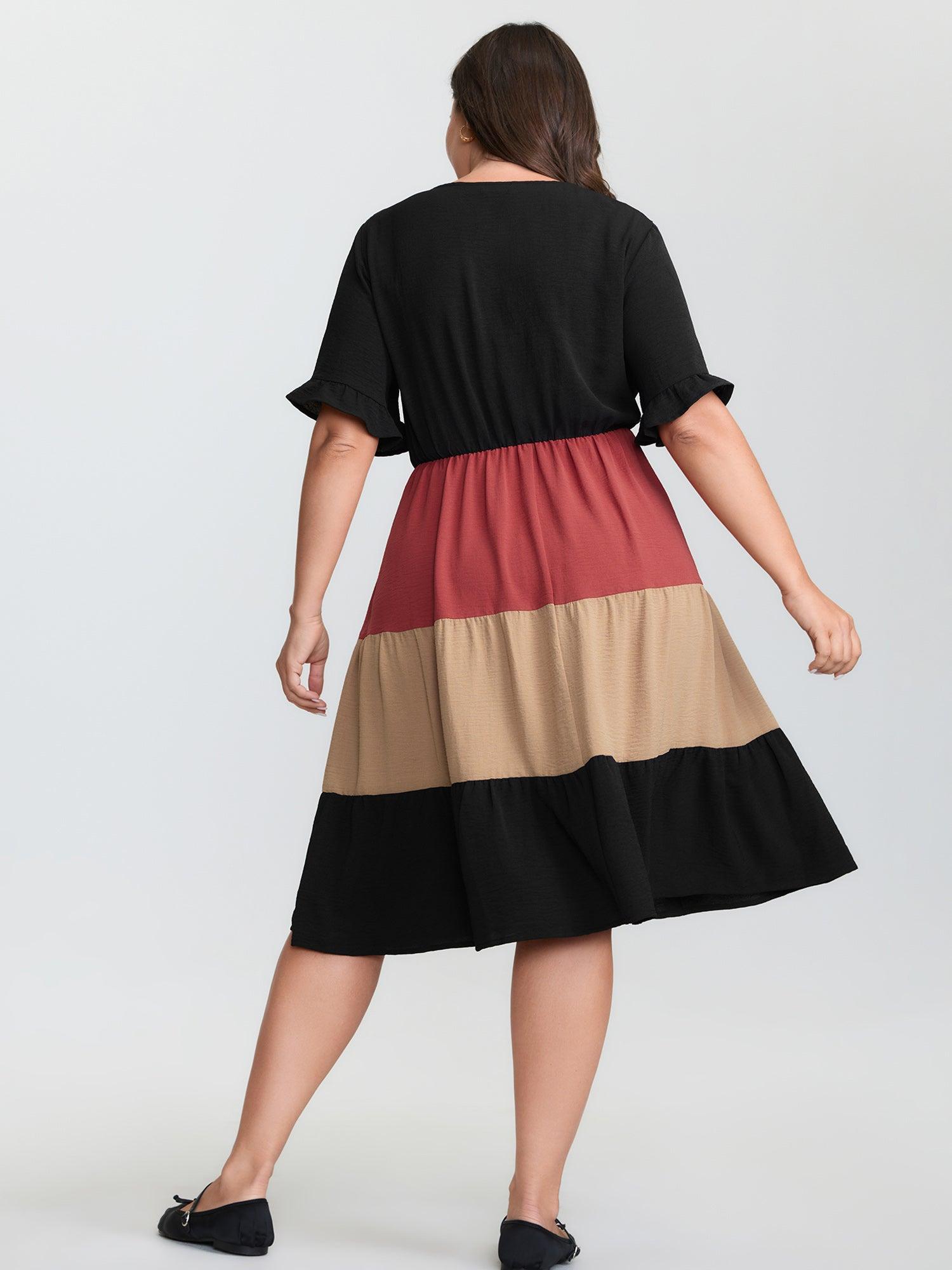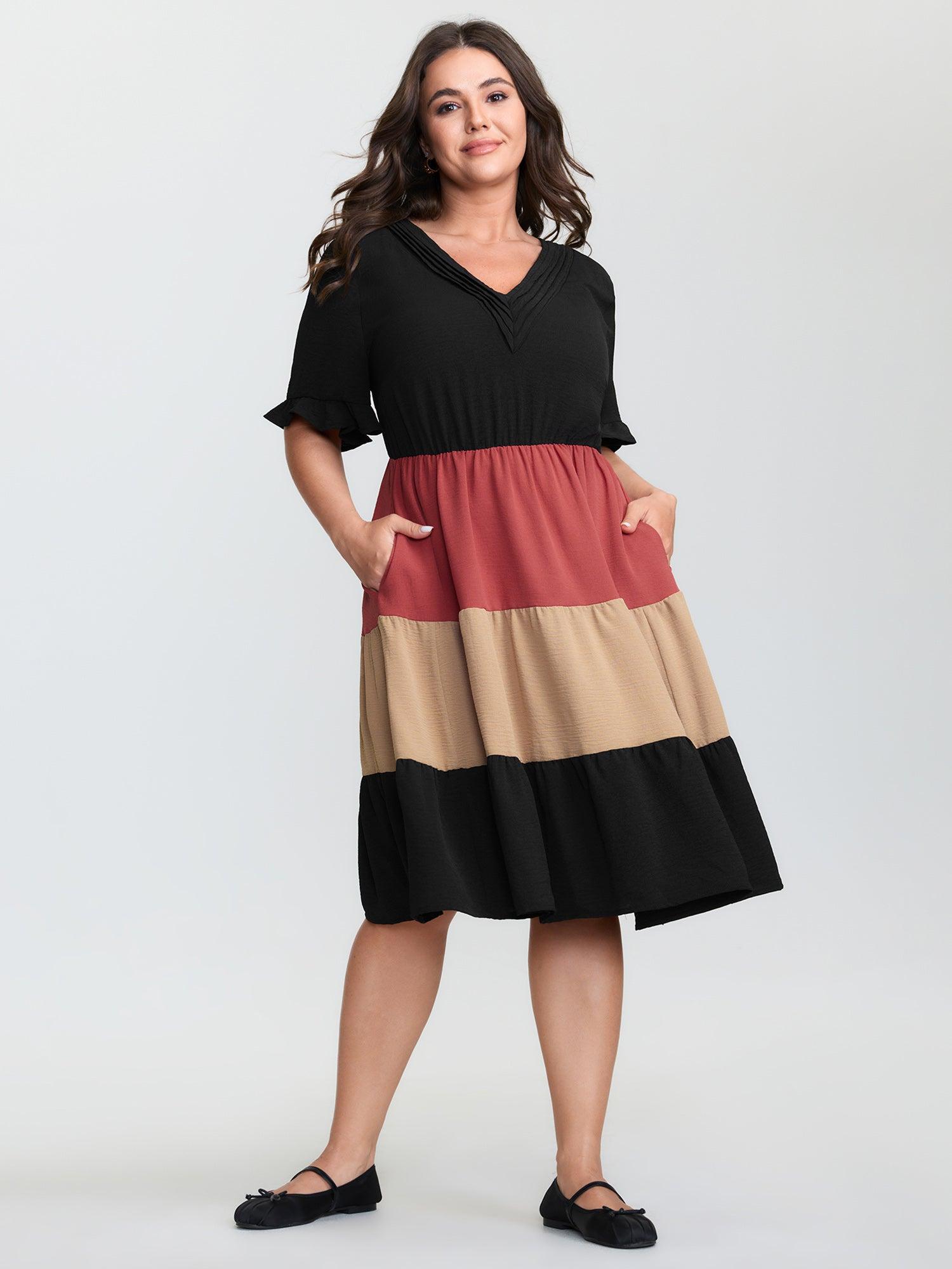 Shop Colorblock Tiered Pockets Midi Dress now and redefine your style with confidence at BloomChic. Tailored for mid and plus-size women. This trendy Dress, sizes 10-30. You can never go wrong with BloomChic Dresses. Color:Black;Style:Leisure;Neckline:V-neck;Sleeve Type:Regular Sleeve;Prints:Non;Details:Gathered, Contrast;Pocket:Side seam pocket;Belt:No-belt;Closure Type:Non