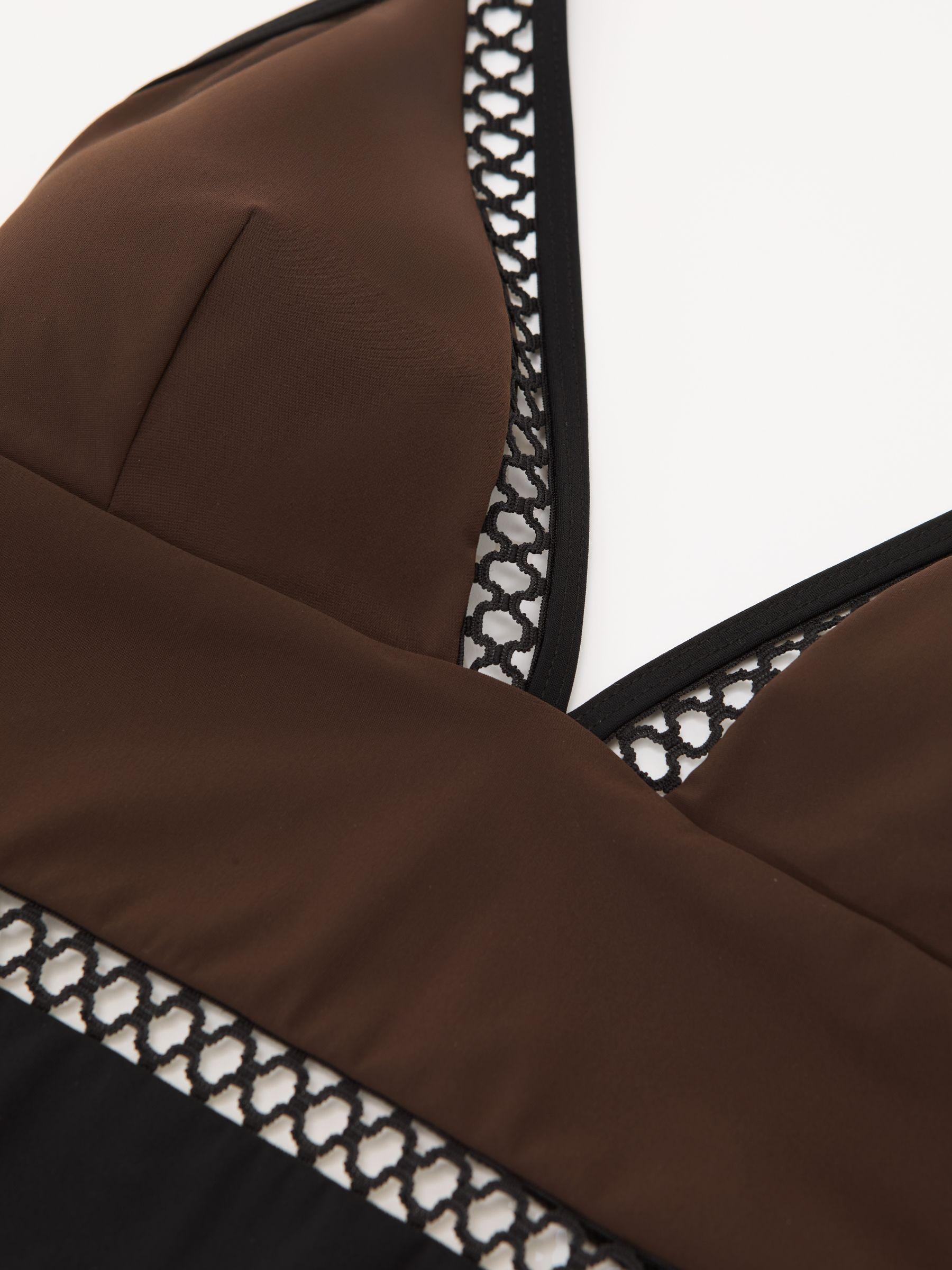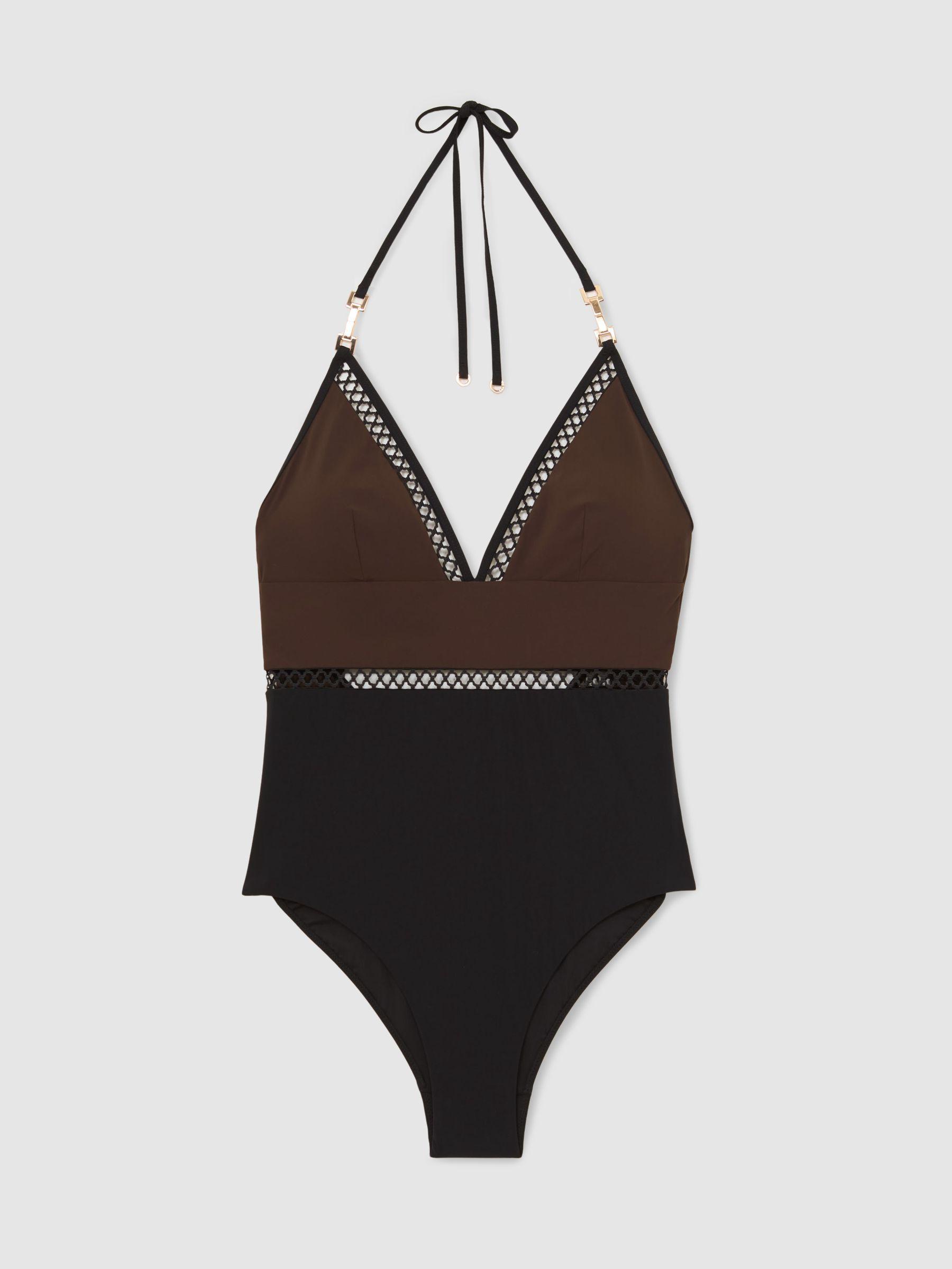 Colour-Block Lattice-Trim Swimsuit in Chocolate Brown/Black