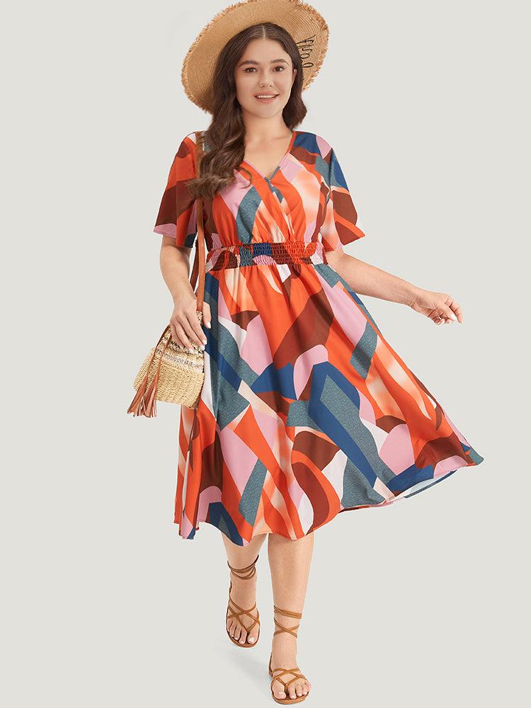 Shop Colour Geometric Contrast Shirred Ruffles Elastic Waist Dress now and redefine your style with confidence at BloomChic. Tailored for mid and plus-size women. This trendy Dress, sizes 10-30. You can never go wrong with BloomChic Dresses. Season:Summer;Color:Multicolor;Style:Vacation;Neckline:V-neck;Sleeve Type:Regular Sleeve;Pattern Type:Geometric;Details:Shirred, Elastic Waist;Pocket:It is perfectly sized to carry a phone.;Belt:No-belt;Closure Type:Elastic Waist