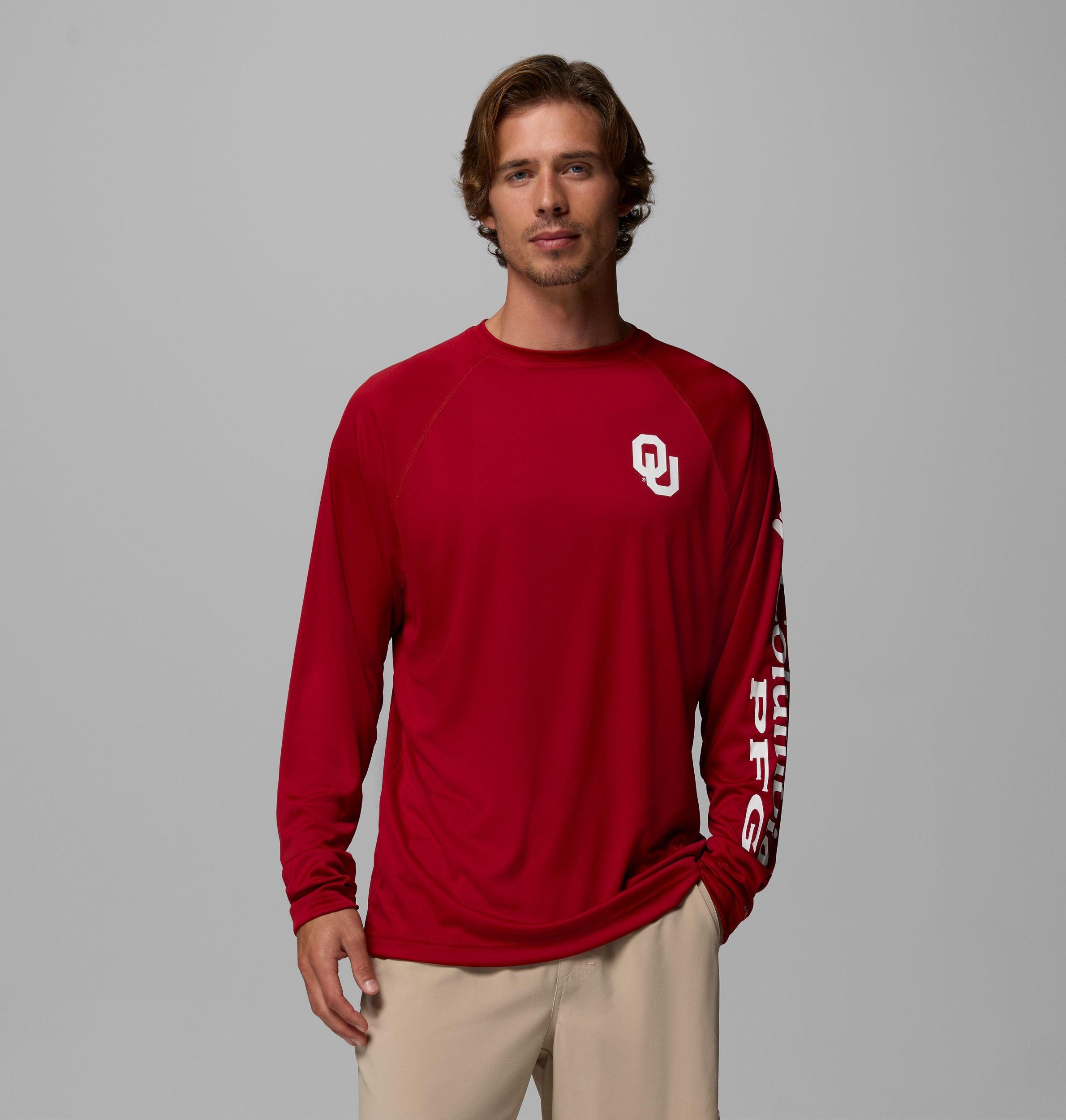 Made from lightweight and breathable material, the Oklahoma Sooners mens Terminal Tackle Long-Sleeve T-Shirt is the perfect accessory for an avid fan. While it may not make you tackle like your favorite defensive players, it does scream fandom. Each of these long-sleeve Columbia shirts features the color combination of your favorite team and their team logo on the front.