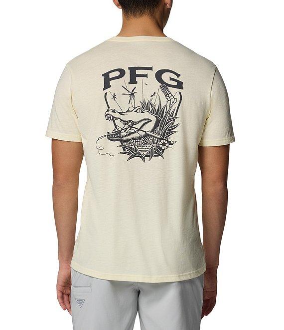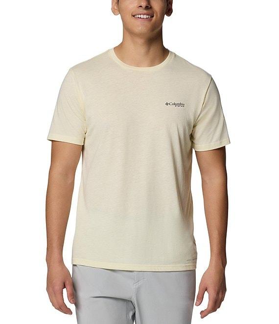 From Columbia, this T-shirt features: Crew neckline Short sleeves Small logo on the left side of the chest Large graphic on the back Omni-Shade™ guards against skin damage using tight fabric construction and modified fibers to block UVA/UVB rays so you stay protected in the sun Omni-Wick™ keeps you dry and cool by pulling moisture to the fabric’s surface to evaporate, delivering fast-drying, next-to-skin comfort in the heat Polyester/cotton/rayon Machine wash/tumble dry Imported.