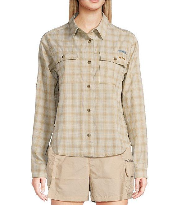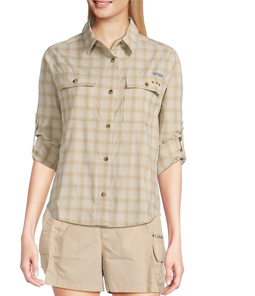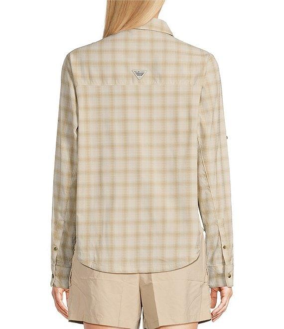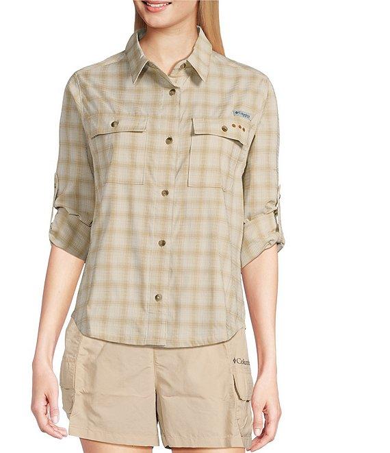From Columbia, this top features: Woven fabrication Plaid print Point collar neckline Roll-tab sleeves Two chest pockets Omni-Shade UPF 50 Omni-Wick Interior security pocket Sunglass cleaning patch Sunglasses pocket Shirttail hemline Button front closure Approx. 28" length Polyester Machine wash/tumble dry Imported.