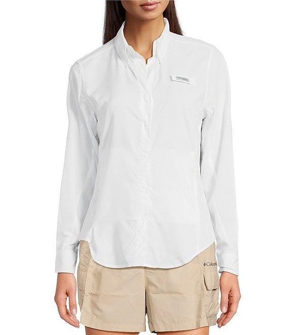 From Columbia, this top features: Woven fabrication Point collar neckline Roll-up sleeves Zippered pocket Breathable vents Omni shade UPF 40 Omni-wick Shirttail hemline Button front closure Approx. 26" length Polyester Machine wash/line dry Imported.