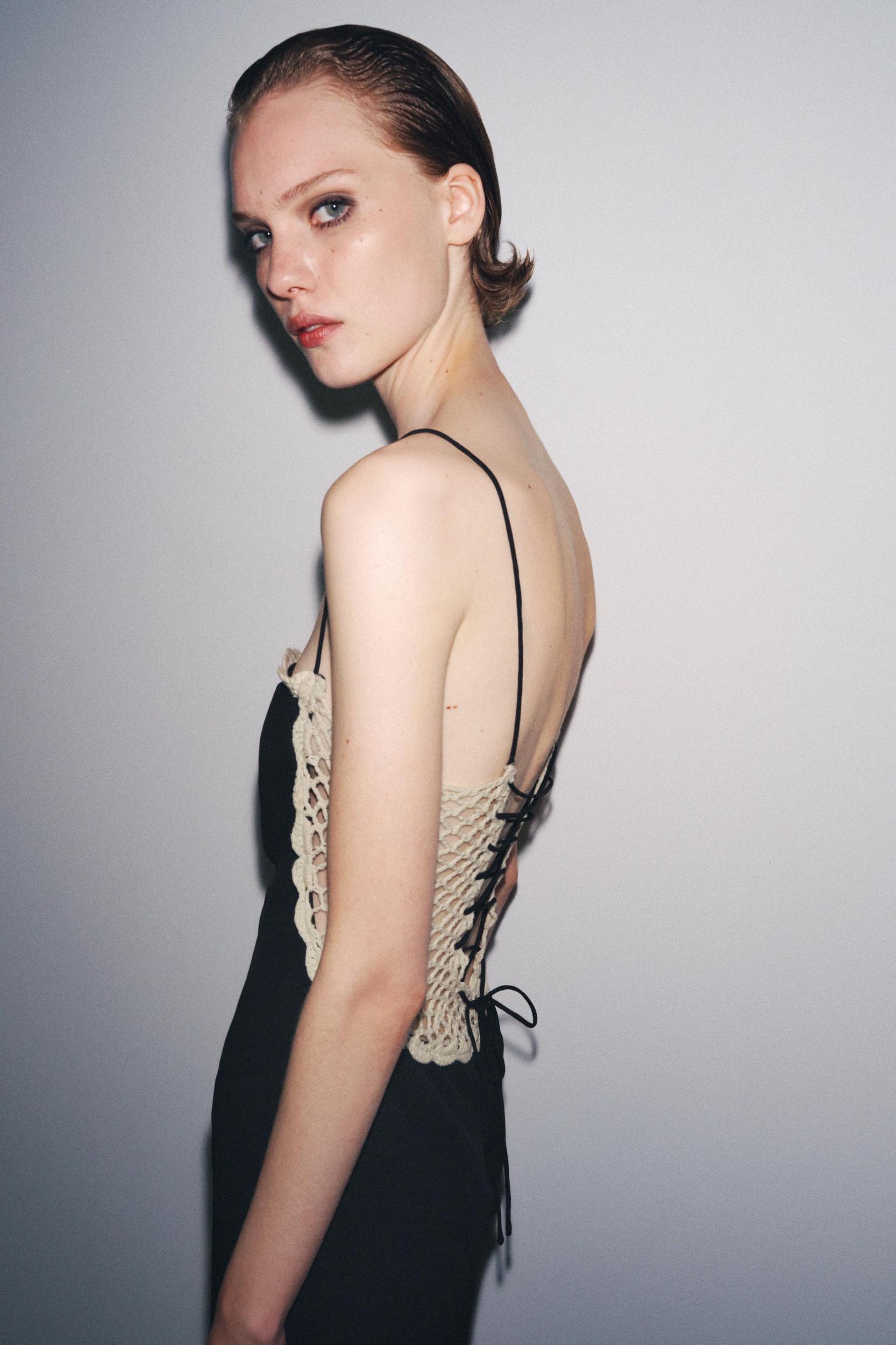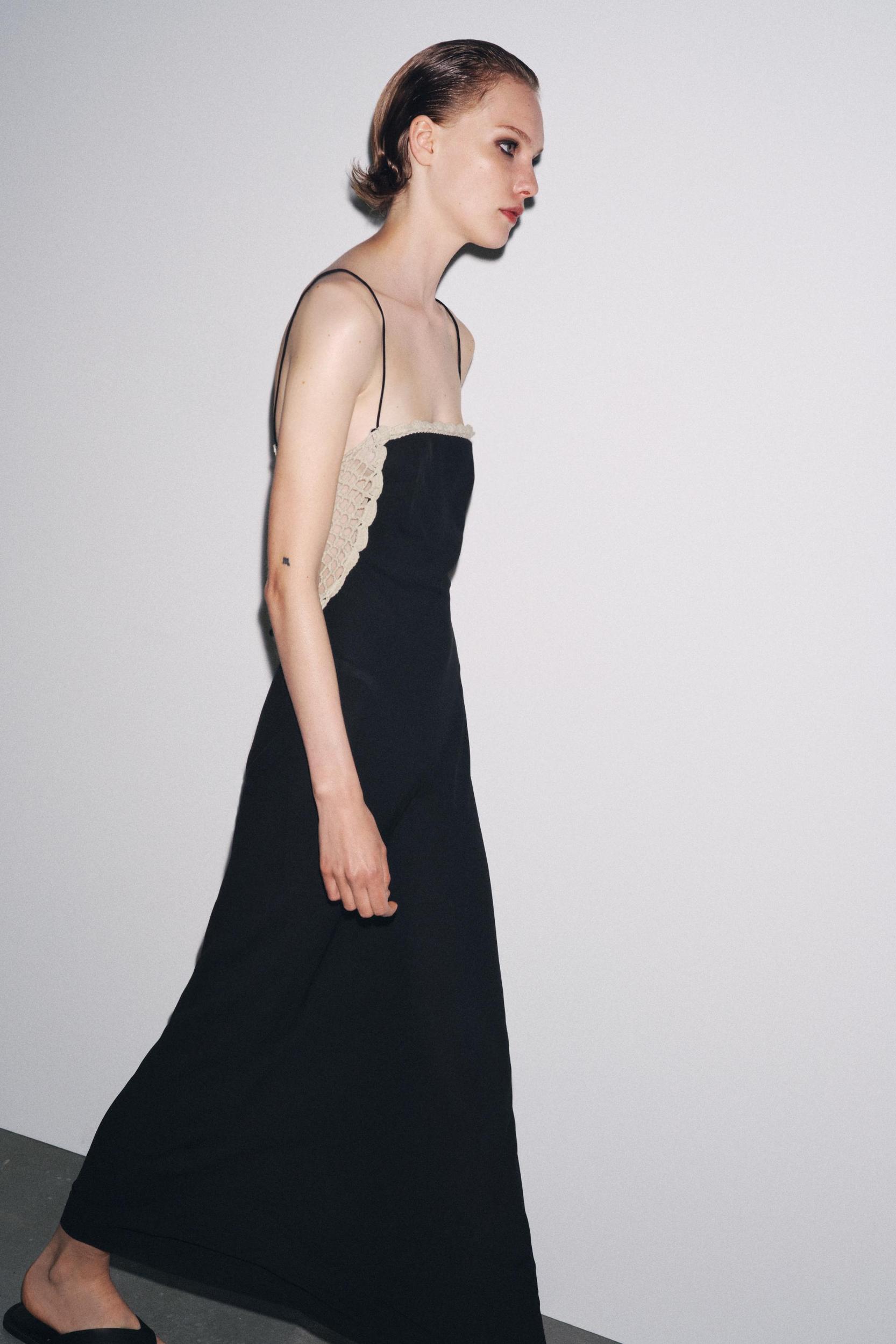 Long combination dress with a round neckline and thin straps. Features contrasting crochet appliqué detail on the back. Back tie closure.