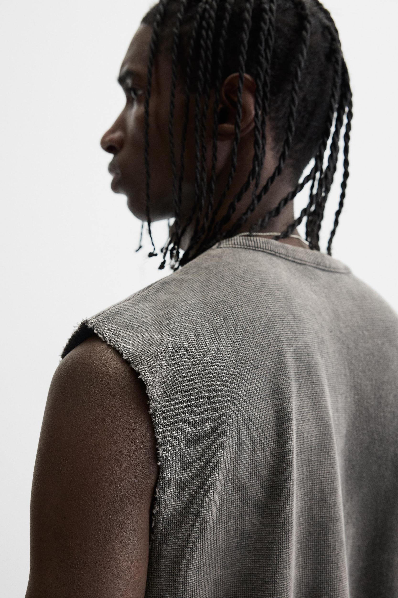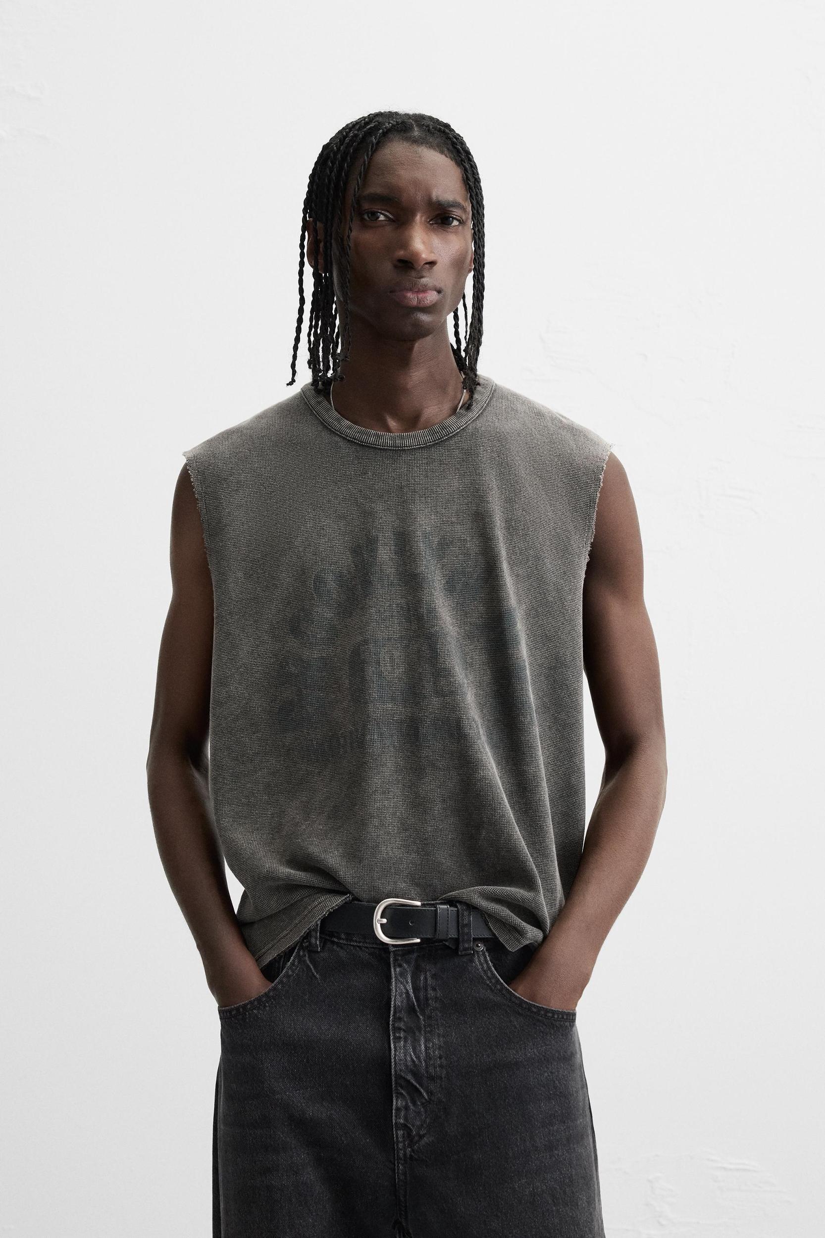 Boxy fit knit T-shirt made of cotton yarn. Crew neck and sleeveless. Contrasting combined print on the front. Washed effect. Irregular finishes.