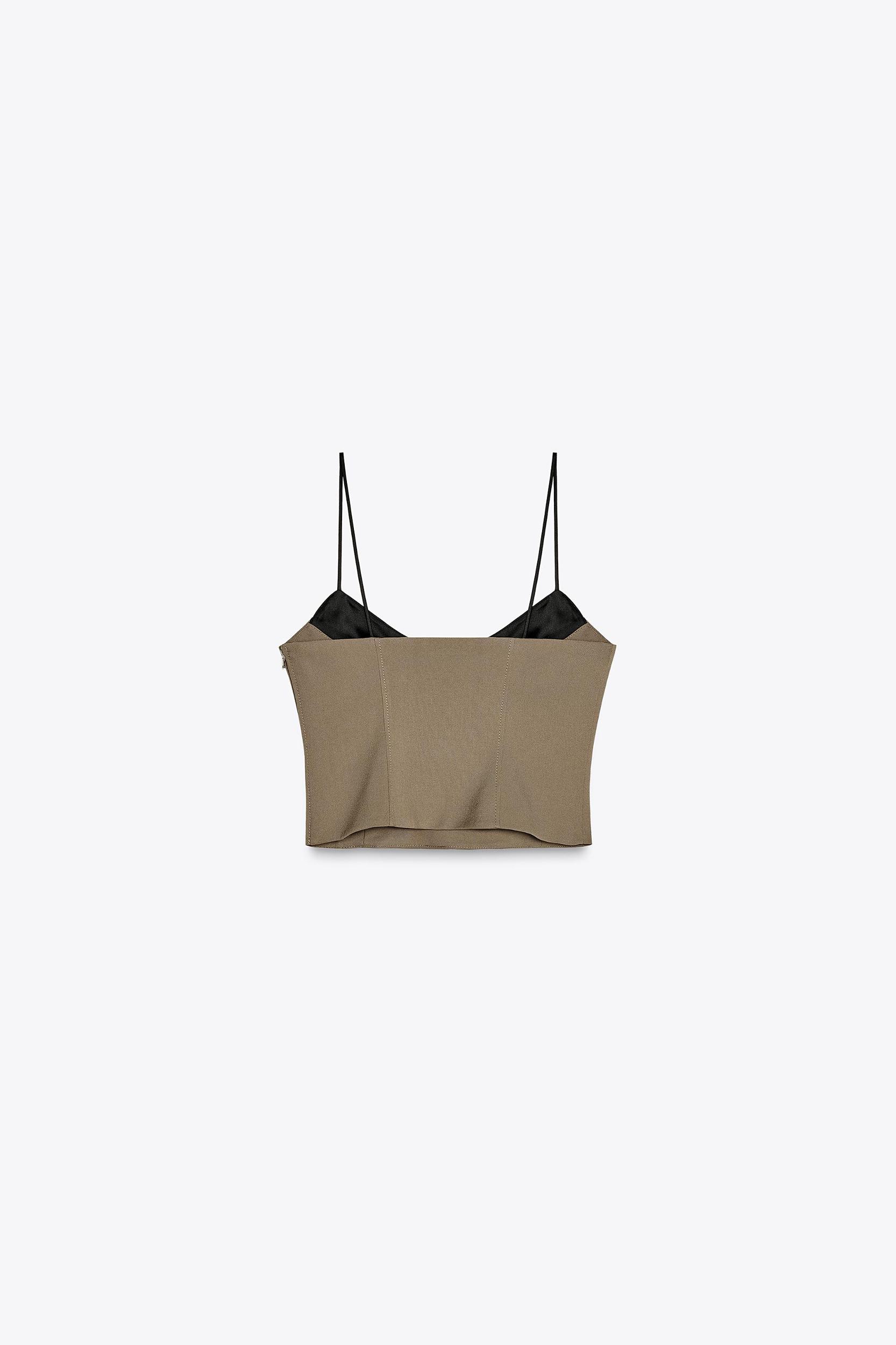 Satin-trimmed V-neck crop top with spaghetti straps. Hidden side zip closure.