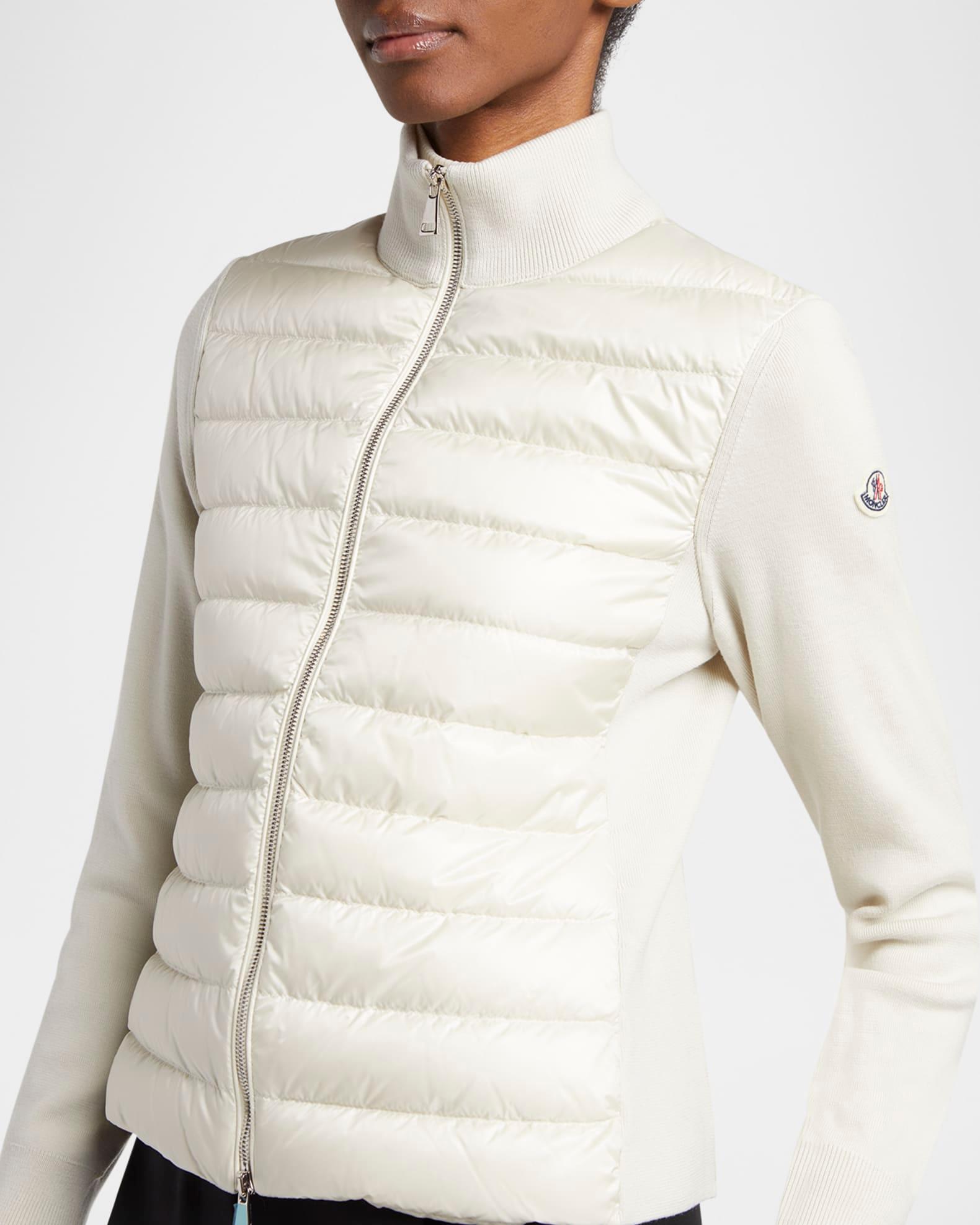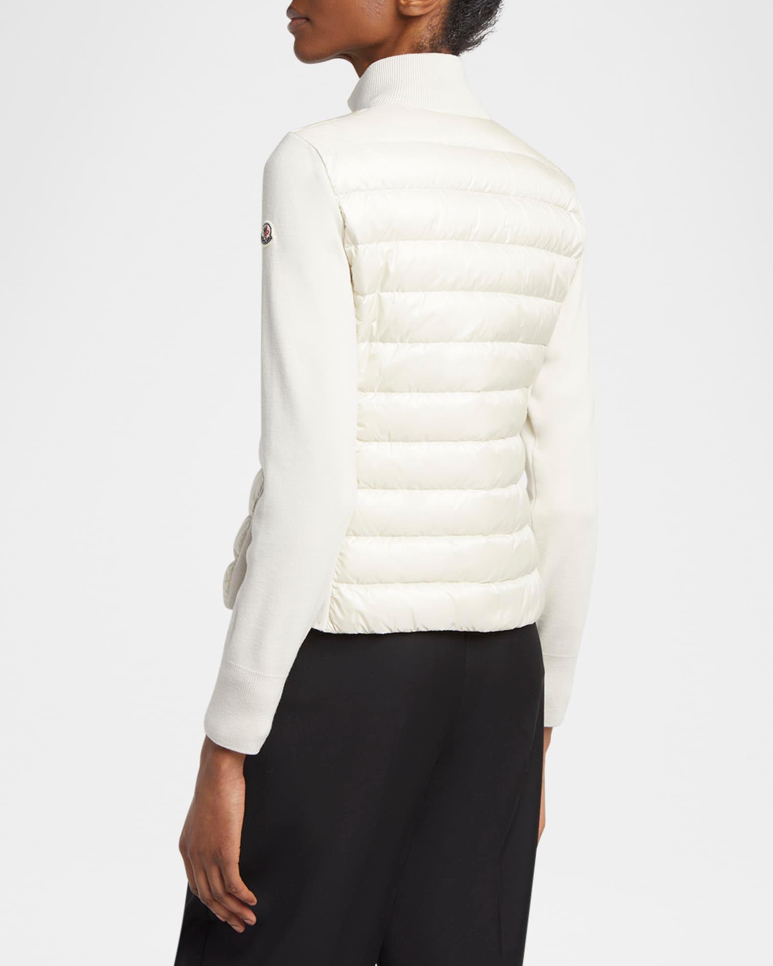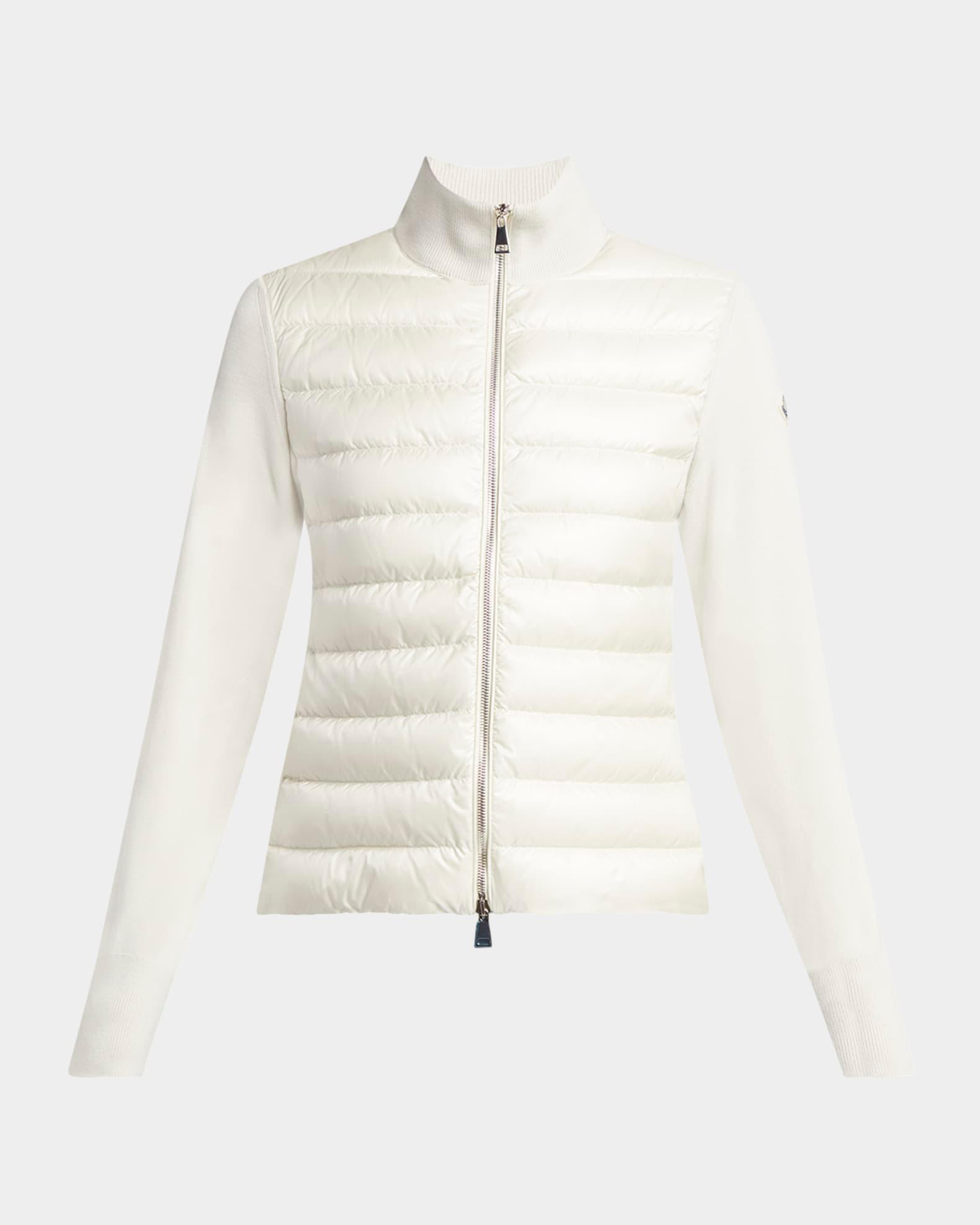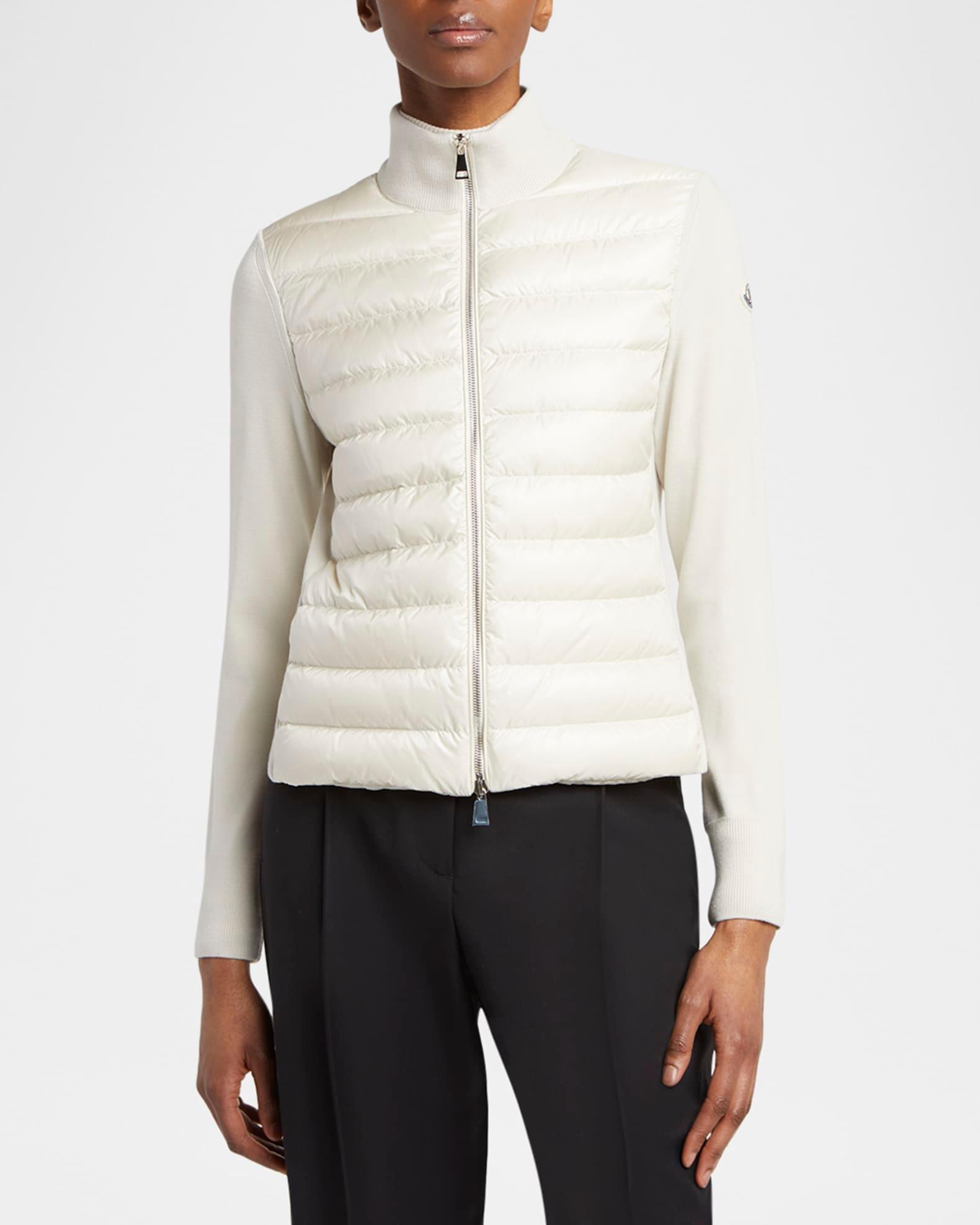 Moncler quilted combo cardigan jacket with wool-knit paneling Stand collar Long sleeves Embroidered logo patch at left sleeve Classic fit Hem sits at the hip Two-way zip-front Virgin wool/nylon/polyamide Fill: Down/feather Lining: Nylon Professional cleaning recommended Imported