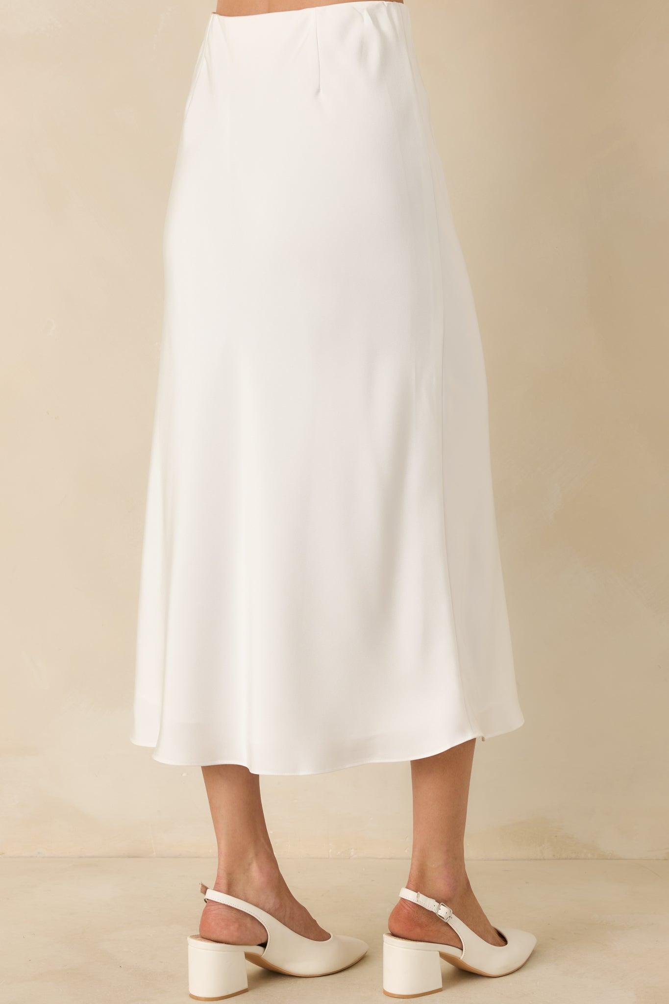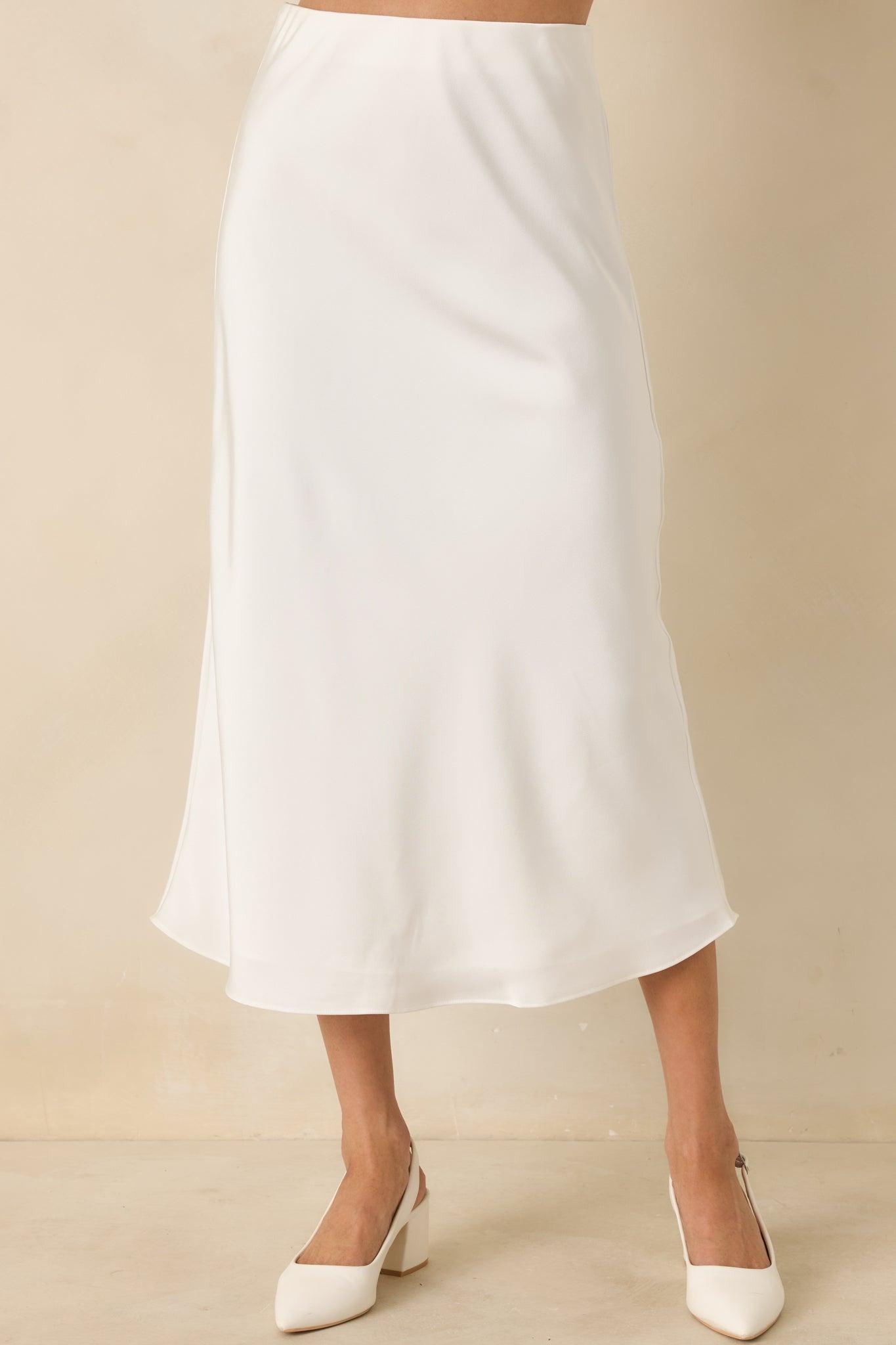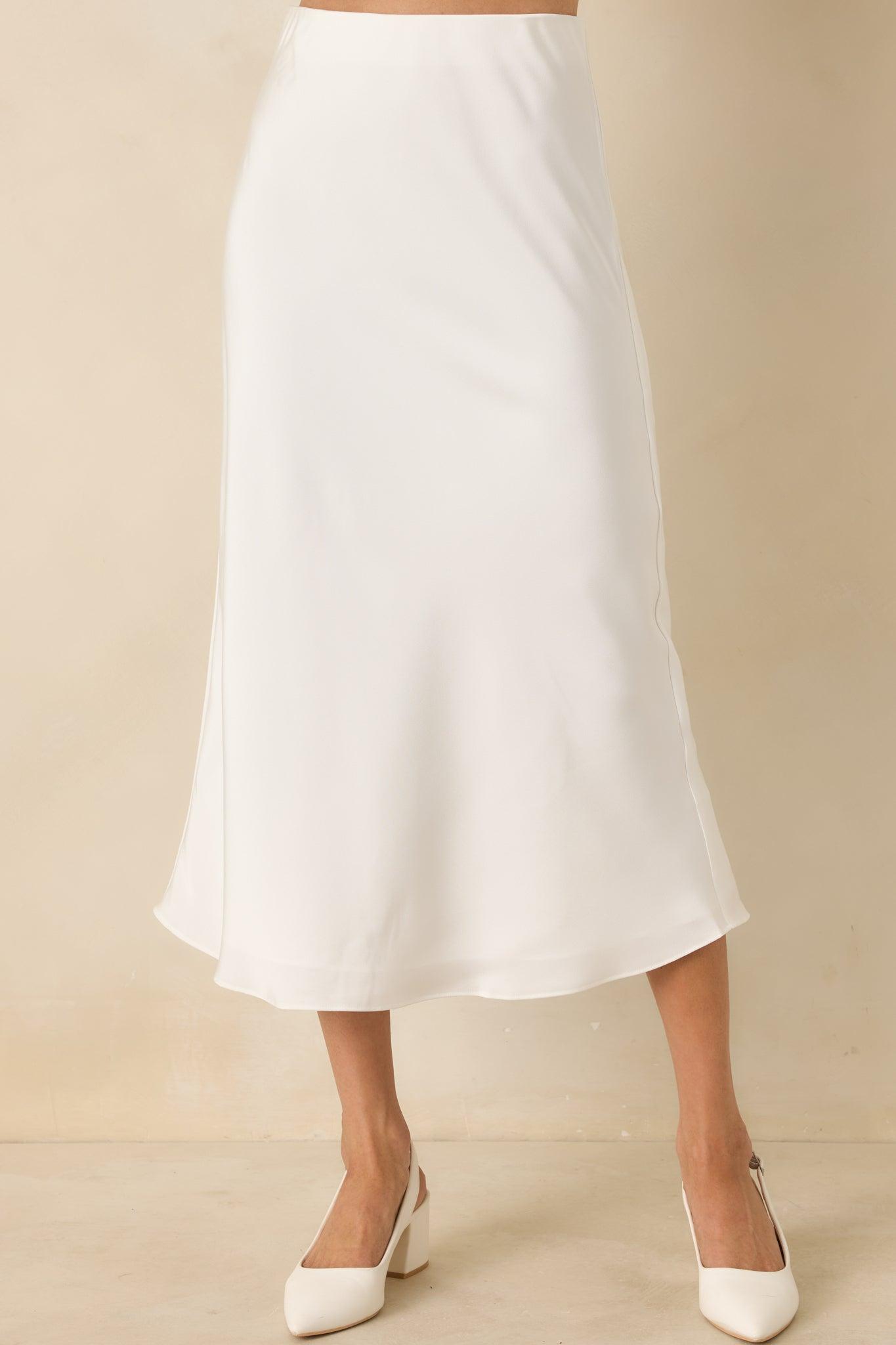The Come Closer White Satin-Finish Midi Skirt is one of those pieces that instantly softens a look. With its subtle sheen and fluid movement, it feels romantic, refined, and endlessly wearable. The gentle flare gives it beautiful drape as you walk, making it just as perfect for dressing up with a blouse as it is keeping things simple with a knit or tee. This white midi skirt is crafted from a lightweight polyester fabric with a smooth, satin-like finish and subtle sheen. Designed with a softly flared silhouette, it offers easy movement and a graceful drape. Finished with a full lining for comfortable coverage and a clean, polished look throughout.