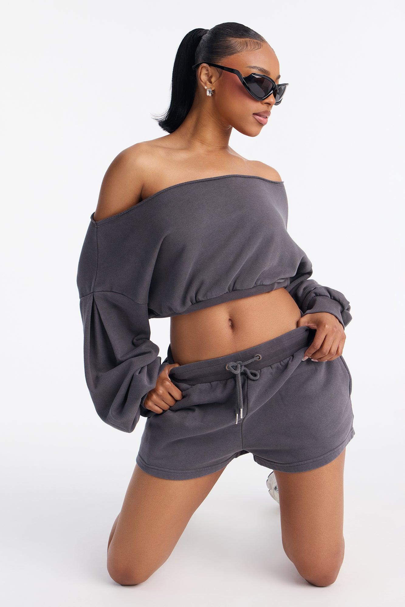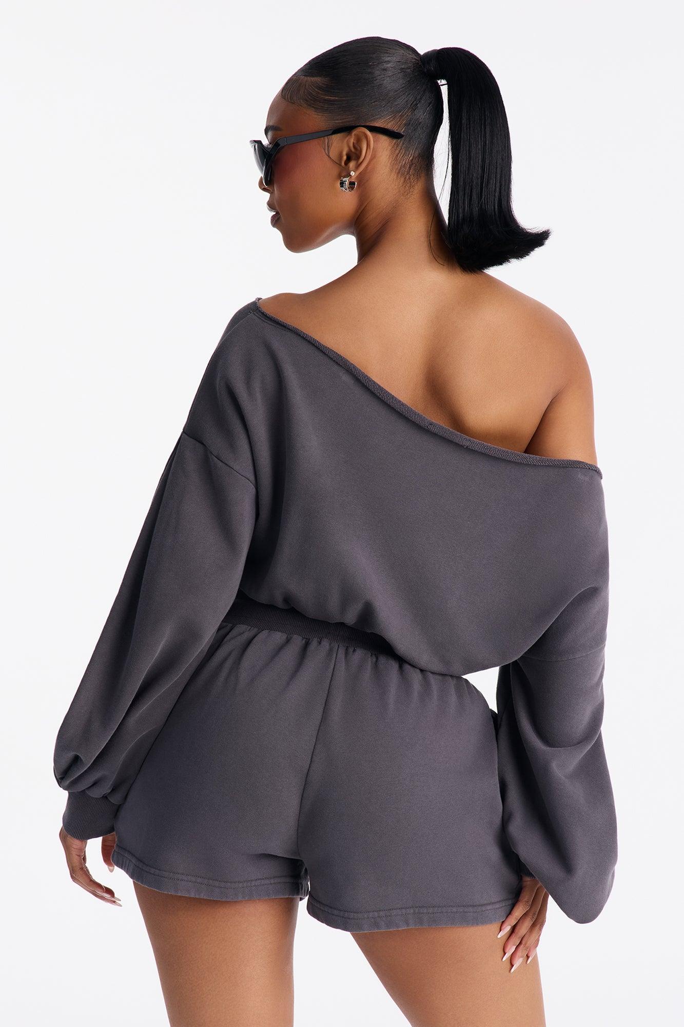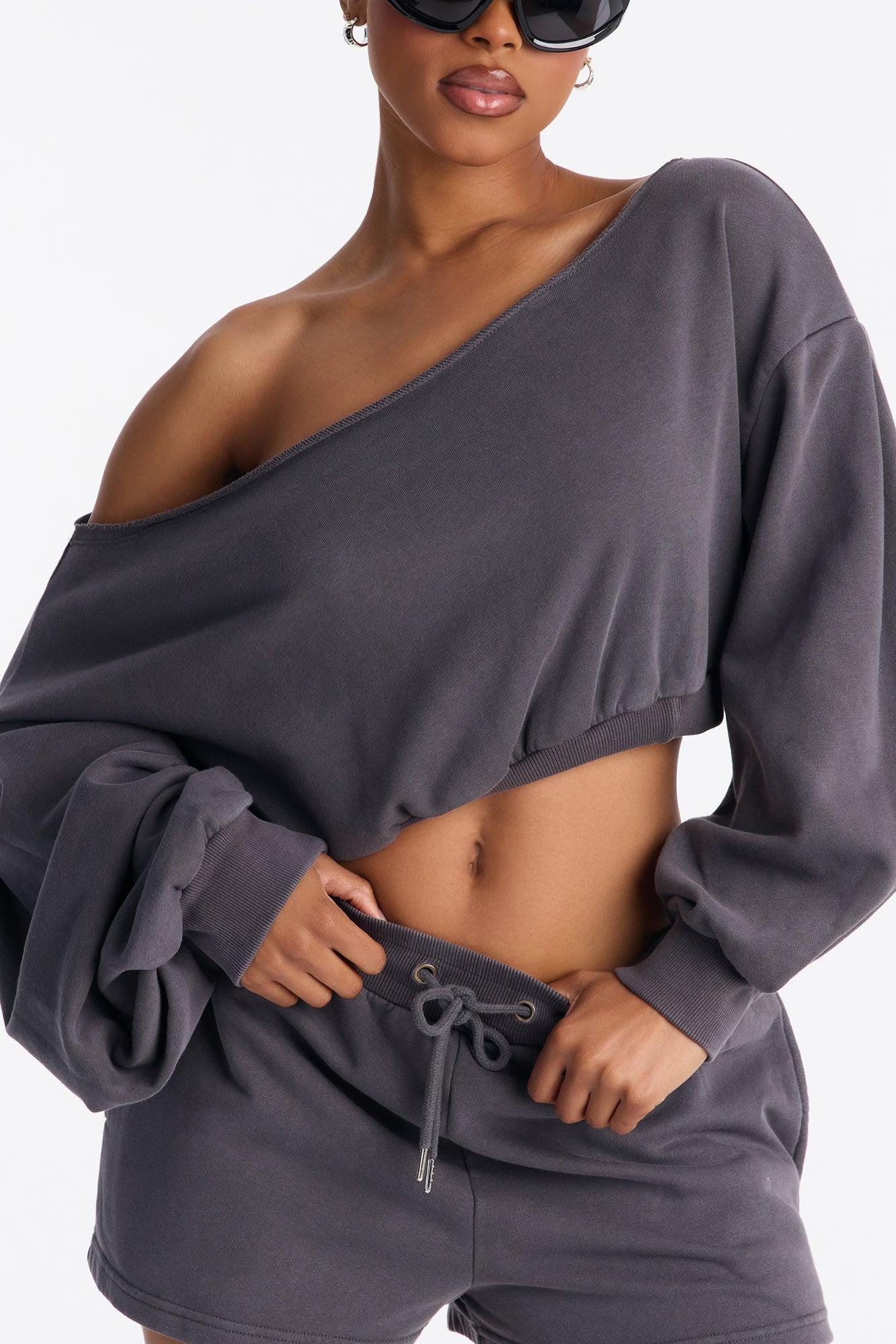Available In Charcoal, Periwinkle, Pink And Taupe. 2 Piece Ensemble Off Shoulder Sweater And Short Set Slight Stretch Elastic Drawstring Waistband Pockets Disclaimer: Due To The Specialized Wash Process, Each Garment Is Unique. Self: 85% Cotton 15% Polyester Contrast: 58% Cotton 37% Polyester 5% Spandex Imported