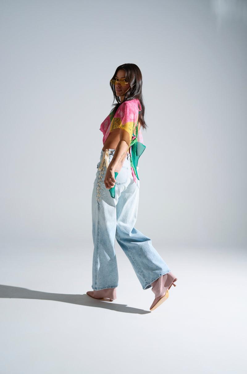 The AKIRA Label Come Hang With Me Wide-Leg Denim Pant With Ties is a flattering high-rise, wide-leg style crafted from soft, light-wash denim. It features four spacious pockets, functional belt-loops, a zip-button front closure, and adjustable, lace-up side seams with thick ivory laces and silver grommets. - 75% Cotton, 23% Polyester, 2% Spandex- Slight Stretch- Imported (all measurements approximate from size small)- 10” Rise- 29.5” Inseam- Model is 5’7” and wearing a size smallProduct ID: 1034235 (all measurements approximate from size 1X)- 12.5” Rise- 30.5” InseamProduct ID: 1034239