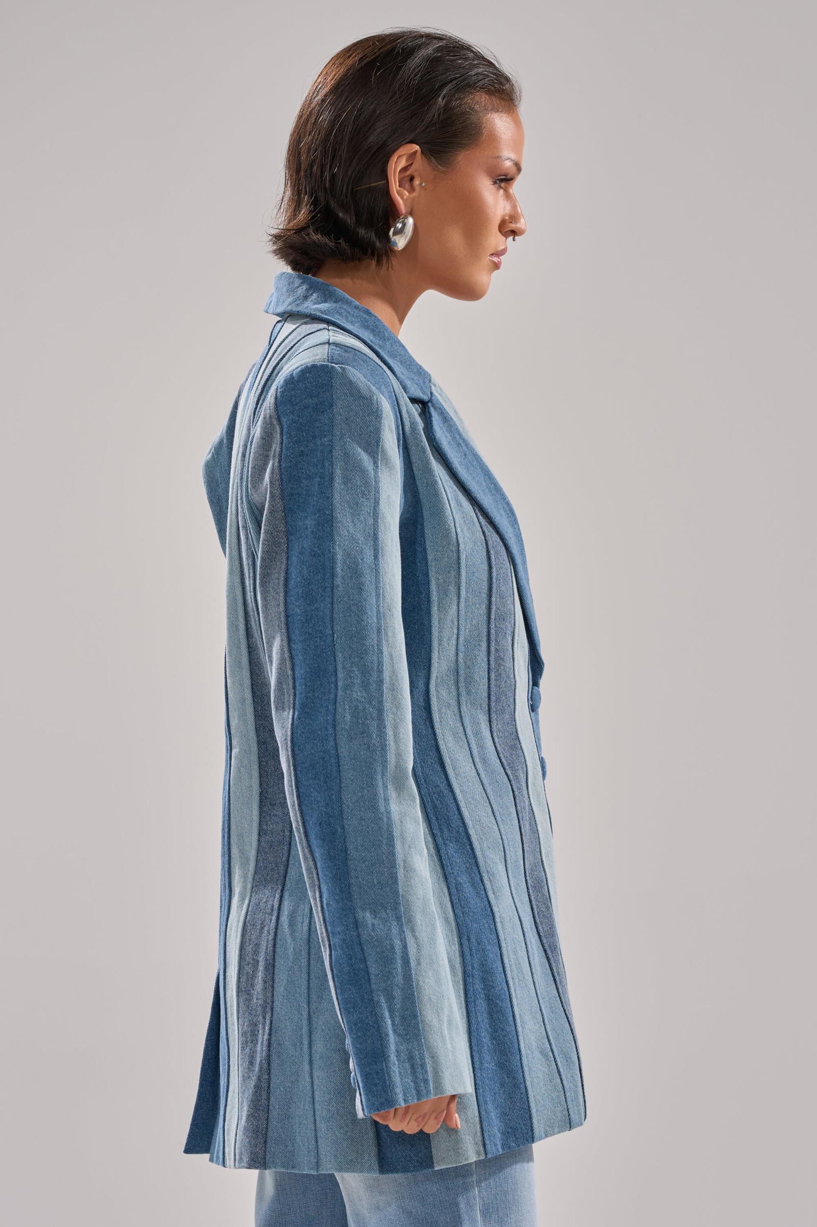 Chase the blues away in The AKIRA Label Come Slide Patchwork Denim Blazer. This stylish blazer is crafted from an assortment of denim and features a striped, paneled design with a classic notched lapel collar, a plunging neckline, lightly padded shoulders for natural shaping, long sleeves with button cuffs, button front closures, and a back vent slit. Complete with a cinched, longline fit. Try styling with a satin maxi skirt and stiletto booties for a trendy finish. - 100% Cotton- Hand Wash or Dry Clean- No Stretch- Imported (all measurements approximate from size small)- 30” Shoulder to Hem- 16” Shoulder to Shoulder- 25” Sleeves- Model is 5’7” and is wearing size smallProduct ID: 1053827 (all measurements approximate from size 1X)- 32” Shoulder to Hem- 18” Shoulder to Shoulder- 27” SleevesProduct ID: 1053831