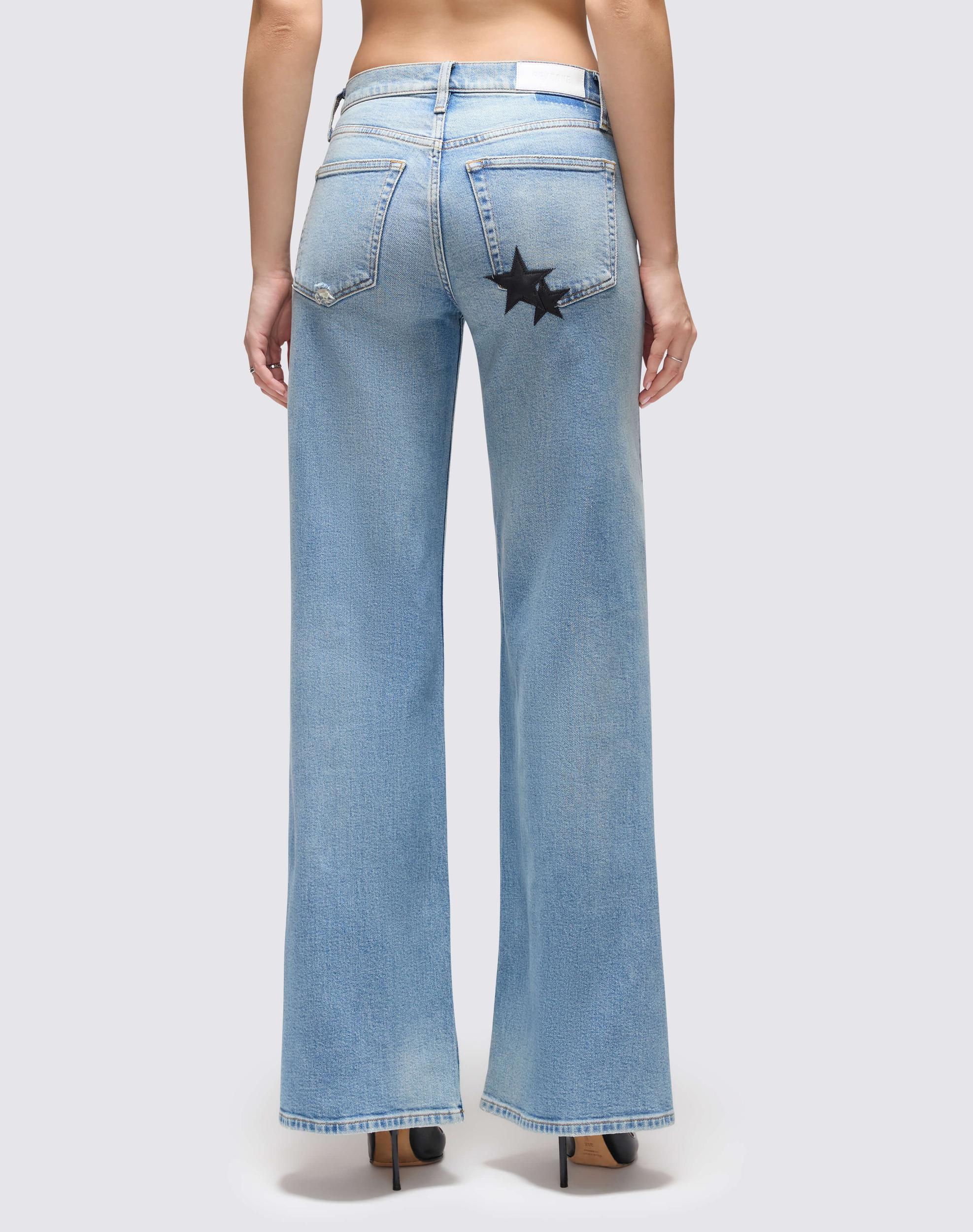 An update to our best selling 70s Ultra High Rise Wide leg with our new flattering mid-rise top block. Features whiskered vintage inspired with 100% leather star details on our icon comfort stretch denim, classic button fly and finished hem.