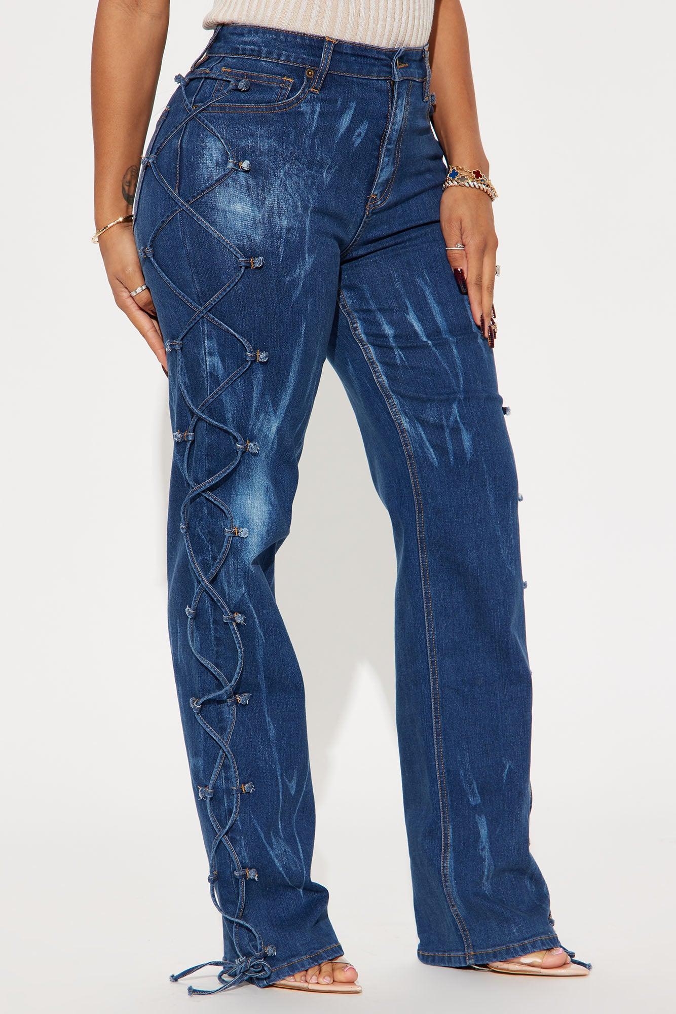 Available In Dark Wash. Straight Leg Jean 5 Pocket Adjustable Lace Up Detail 11" High Rise 34" Inseam High Stretch Disclaimer: Due To The Specialized Wash Process, Each Garment Is Unique. 72% Cotton 26% Polyester 2% Spandex Imported