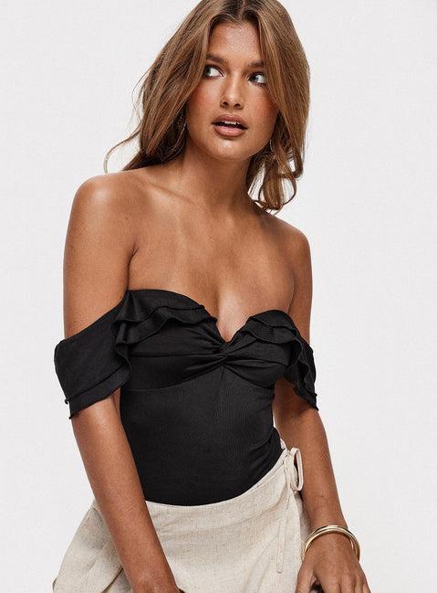 Off-the-shoulder bodysuit Ruffle detail, twist detail at bust, inner silicone strip, high cut leg, cheeky style bottom, press clip fastening Good stretch, fully lined Princess Polly Lower Impact 90% reclaimed polyester 10% elastane Cold gentle machine wash