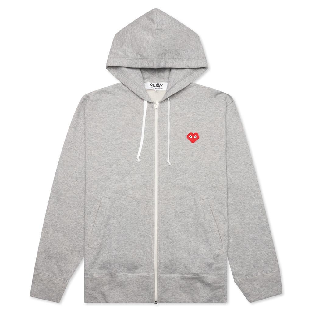 Taking on a complete cotton construction, the Comme des Garçons PLAY x the Artist Invader Hooded Sweatshirt makes a statement in any collection. A drawstring hood is placed, while the hand pockets paired with the ribbed detailing offer added dimension. An embroidered pixelated bug-eyed red heart motif finishes the look. 100% cotton Full-zip closure Drawstring hood Embroidered motif Hand pockets Ribbed trims Style No: AZ-T326-051-1 AZ T326 051 1