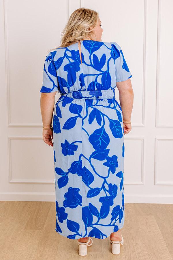 People are sure to be in complete awe when you arrive in this stunning sky blue midi dress featuring lightweight material patterned with a royal blue floral print, a rounded neckline, short sleeves, a flattering fitted waistline, and a relaxed skirt silhouette that falls into straight ankle-length hemlines with an accent side slit! - Partially lined bust are, fully unlined skirt.