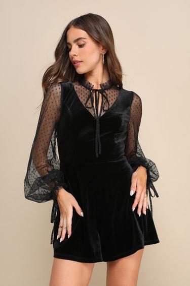 Everyone will be under your spell when you're wearing a chic and adorable 'fit like the Lulus Completely Charismatic Black Velvet Mesh Swiss Dot Romper! Sheer mesh, with a Swiss dot texture throughout, shapes long balloon sleeves with elastic, ruffles, and decorative ties at the cuffs. Mesh continues across the sheer décolletage, shaping a ruffled mock neckline with a functional tie at the center. Stretchy velvet creates a layered effect as it shapes wide straps and a princess-seamed bodice with a V-neckline and V-back. Attached velvet shorts complete the look. Hidden zipper/clasp and loop button closure with keyhole at back.
