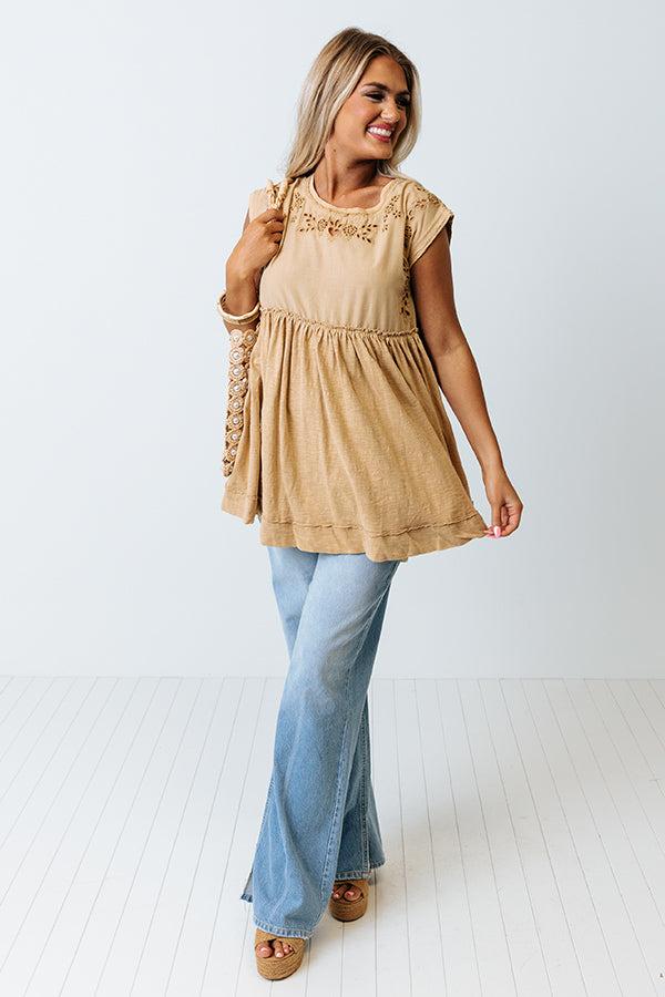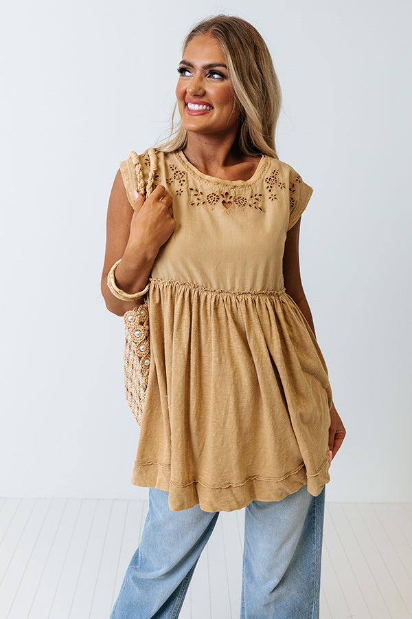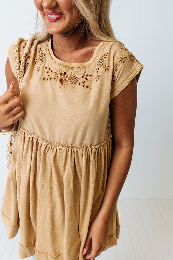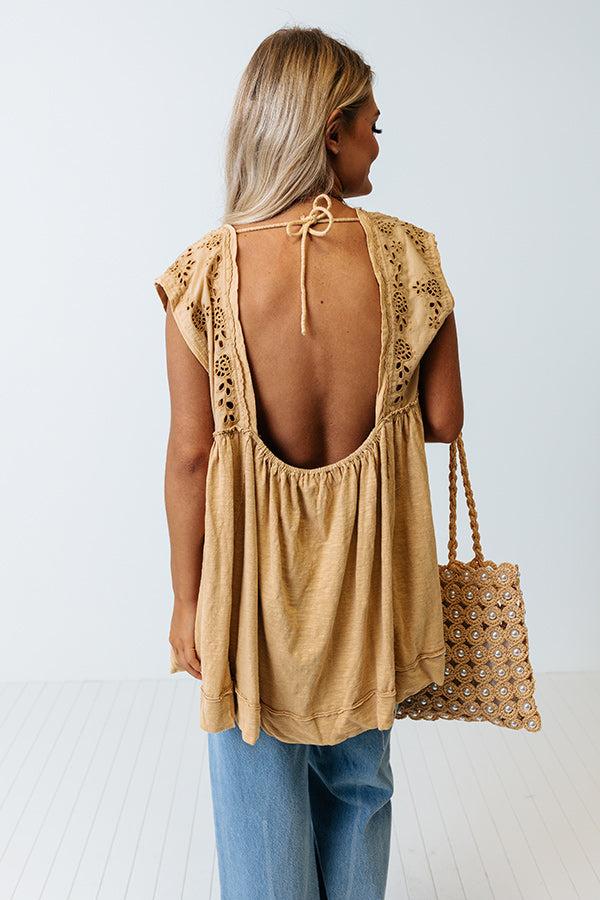 Slay all day in our pretty light mustard hued 'Concert Countdown Top' featuring lightweight material with delicate eyelet detailing, a rounded neckline, cap sleeves, a low open back with a tie closure across the shoulders, and a relaxed silhouette that falls into a straight hemline!