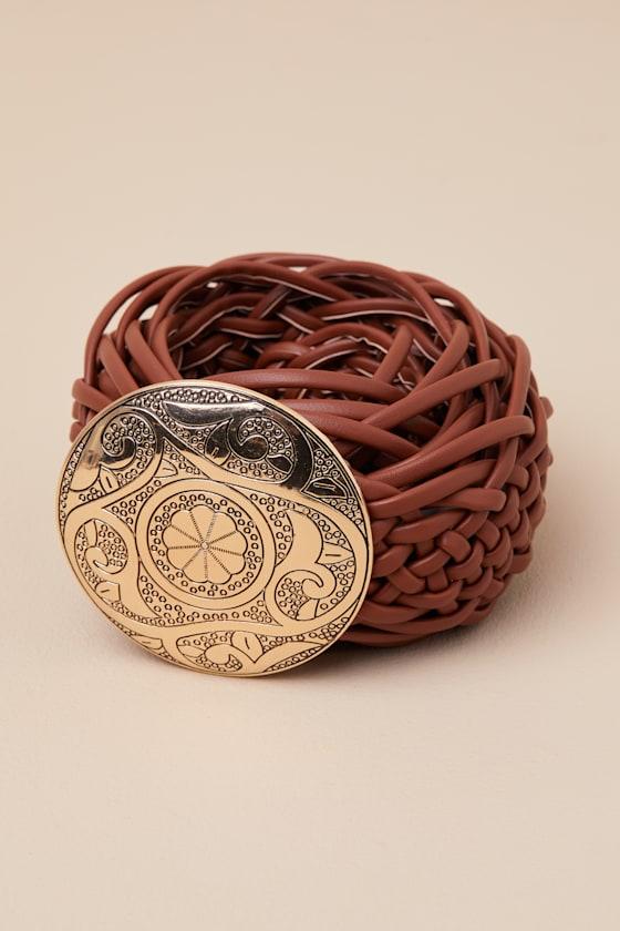 Complete any 'fit with the cutest Western charm thanks to this smooth, faux leather belt with a wide silhouette and a Boho-chic woven design. The round, gold-toned buckle at the front features a vintage-inspired patina and floral-like embossing for an authentic finish.