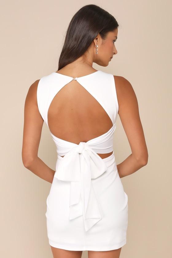 Strutting is highly encouragedThis sexy LWD features a figure-flaunting silhouette composed of stretchy crepe knit. The sleeveless bodice boasts princess seam details and an open-back design crossed by long tying sashes, all atop a flirty mini skirt. Button-loop closure and hidden zipper/clasp at back.