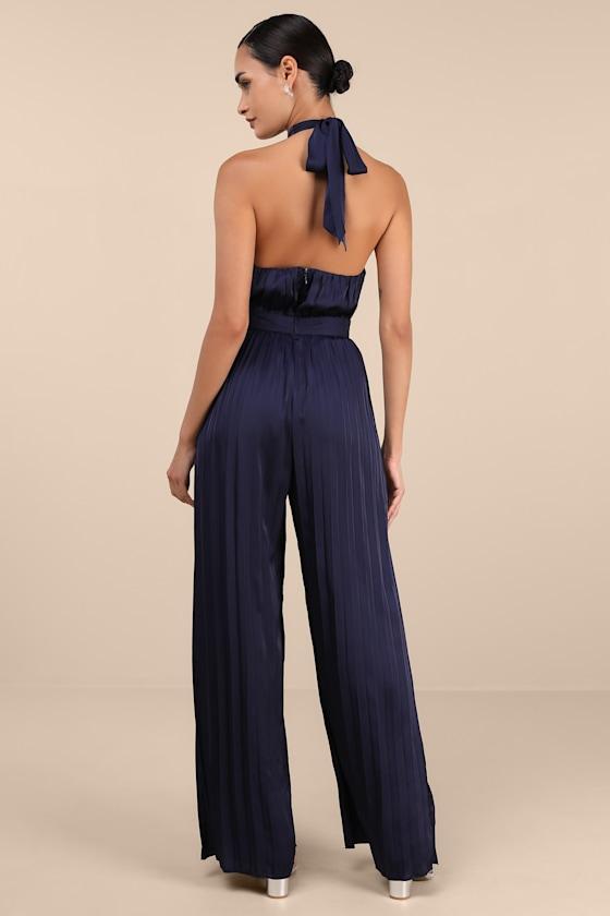 Leave everyone awestruck with the way you strut in the Lulus Confident Impression Navy Satin Pleated Halter Jumpsuit! Ultra-sleek, pleated satin shapes this impressive jumpsuit that features a tying halter neckline with a crisscrossing bodice that creates a flirty keyhole detail. Banded, fitted waist sits atop relaxed, wide pant legs that fall to ankle-length hems. Turn around to reveal a sexy open back design. Hidden back zipper/clasp.