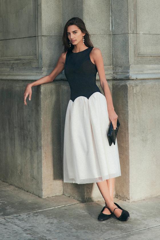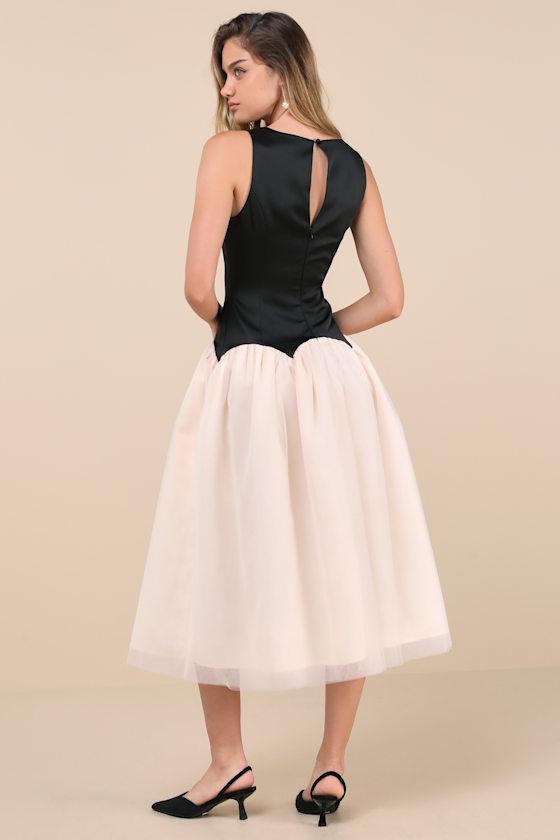 All your most stylish events were meant to be celebrated in the Lulus Contemporary Elegance Black and Cream Satin Tulle Midi Dress! Sleek woven satin shapes this minimalist bodice of this dress that has a chic boat neckline and a button-loop closure and keyhole at back. Princess-seamed silhouette continues down to a drop-style waist with an arcing, angled design. Skirt has a floaty, three-layered tulle fabrication with luxe gathering and a midi hem. Hidden zipper/clasp at back.