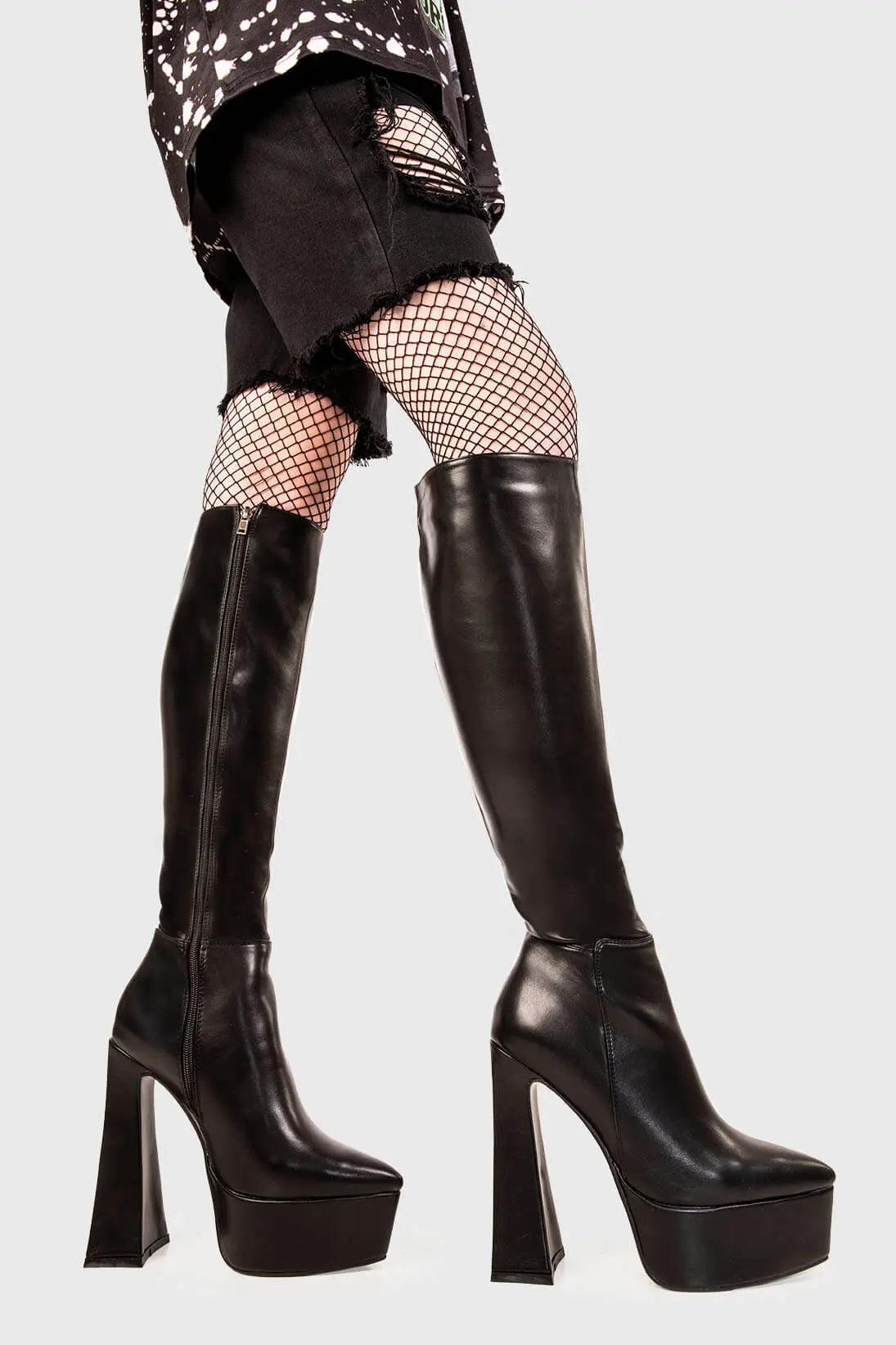 Height Hoppers Content Platform Ankle Boots in black faux leather. These black vegan Platform Boots feature on our chunky sole, hop to new heights and elevate your style. Made with eco-friendly materials and 100% cruelty-free, these platform boots are as ethical as they are HOT!- Platform Height: 1.6 inch- Heel height: 6 inch- Black zipper- Chunky platform sole- Pointed toe- 100% vegan SKU: LMF 1978 - BlackPU