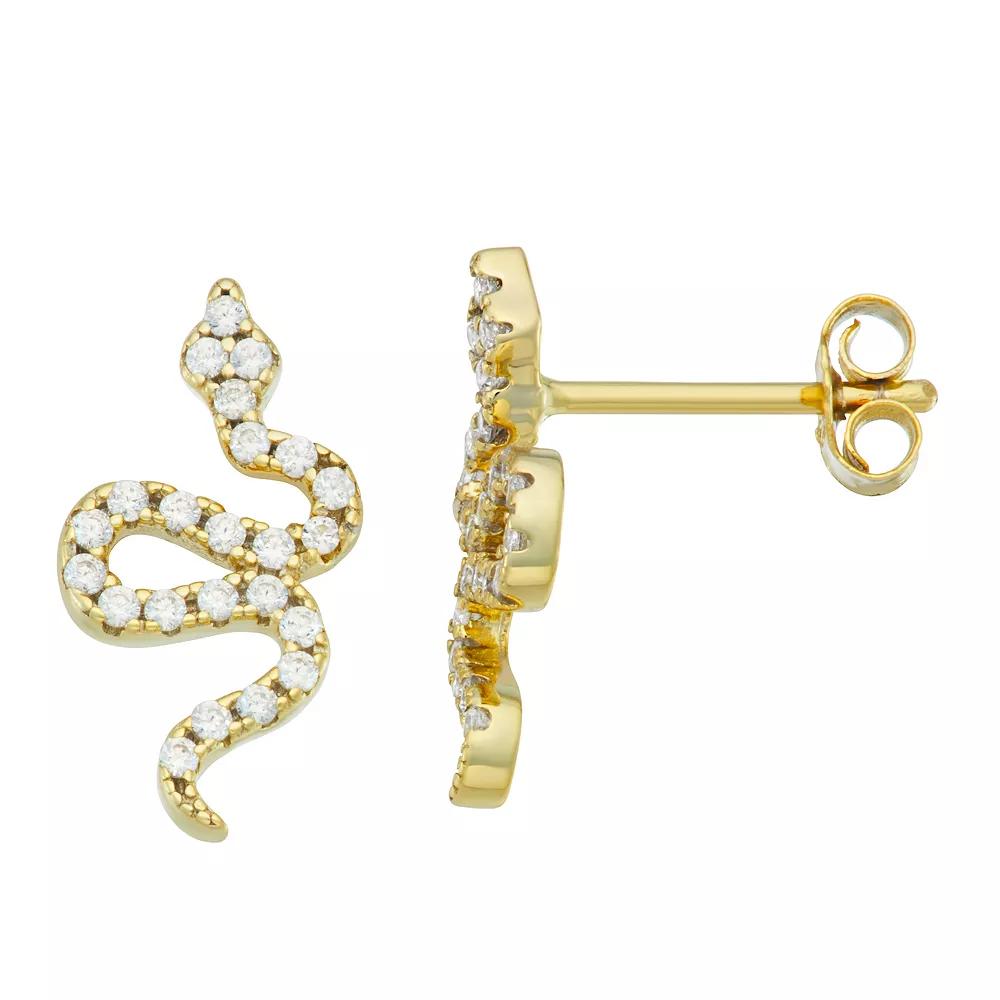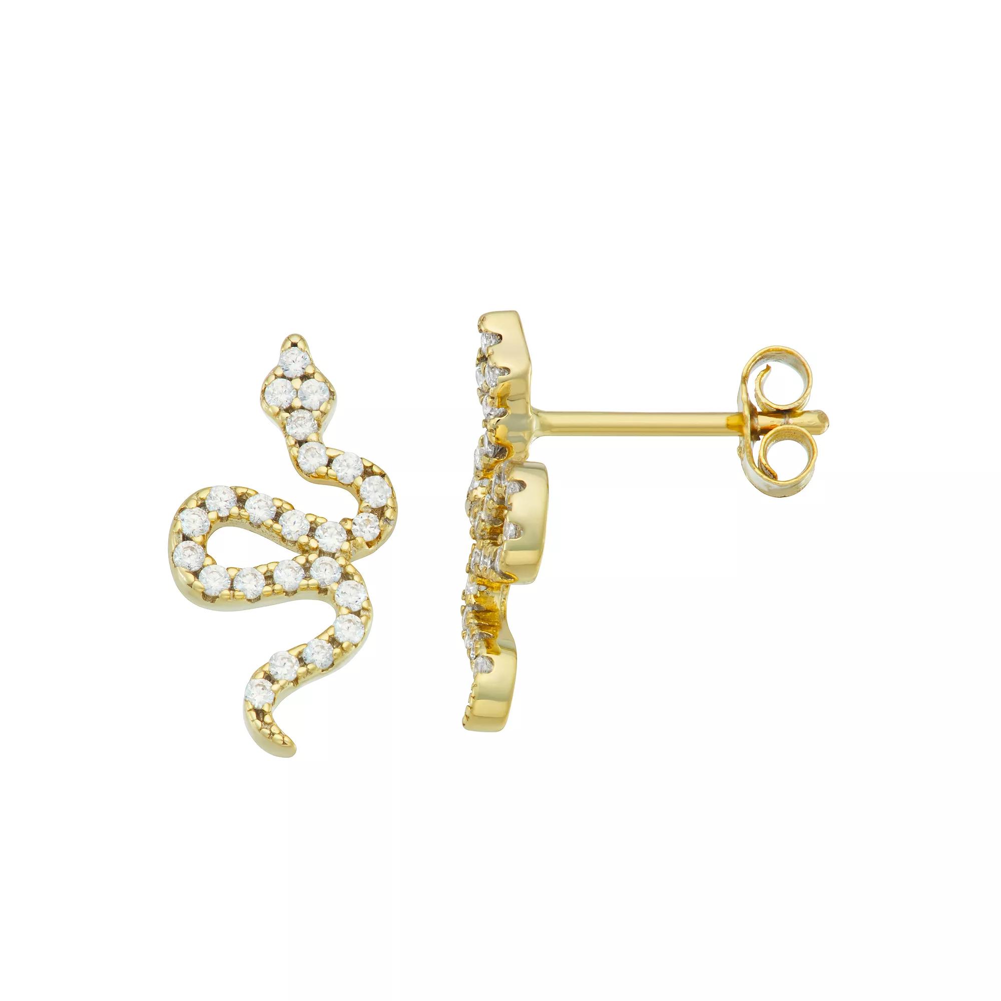 Add a serpentine twist to your look with these beautiful Contessa Di Capri 18k gold over silver snake earrings studded with sparkling cubic zirconia stones. Add a serpentine twist to your look with these beautiful Contessa Di Capri 18k gold over silver snake earrings studded with sparkling cubic zirconia stones. EARRING DETAILS Length: 11 mm Backings: post Metal: sterling silver Plating: 18k gold flash plated Finish: polished Packaging: boxed Nickel freeSTONE DETAILS Stone type: cubic zirconia Total weight: 3/8 ct. Shape: round Setting: pave Gemstones may have been treated to enhance their appearance. Special care may be required. Please visit our Gemstone Treatment & Special Care Guide for more information. Size: One Size. Color: White. Gender: female. Age Group: adult.