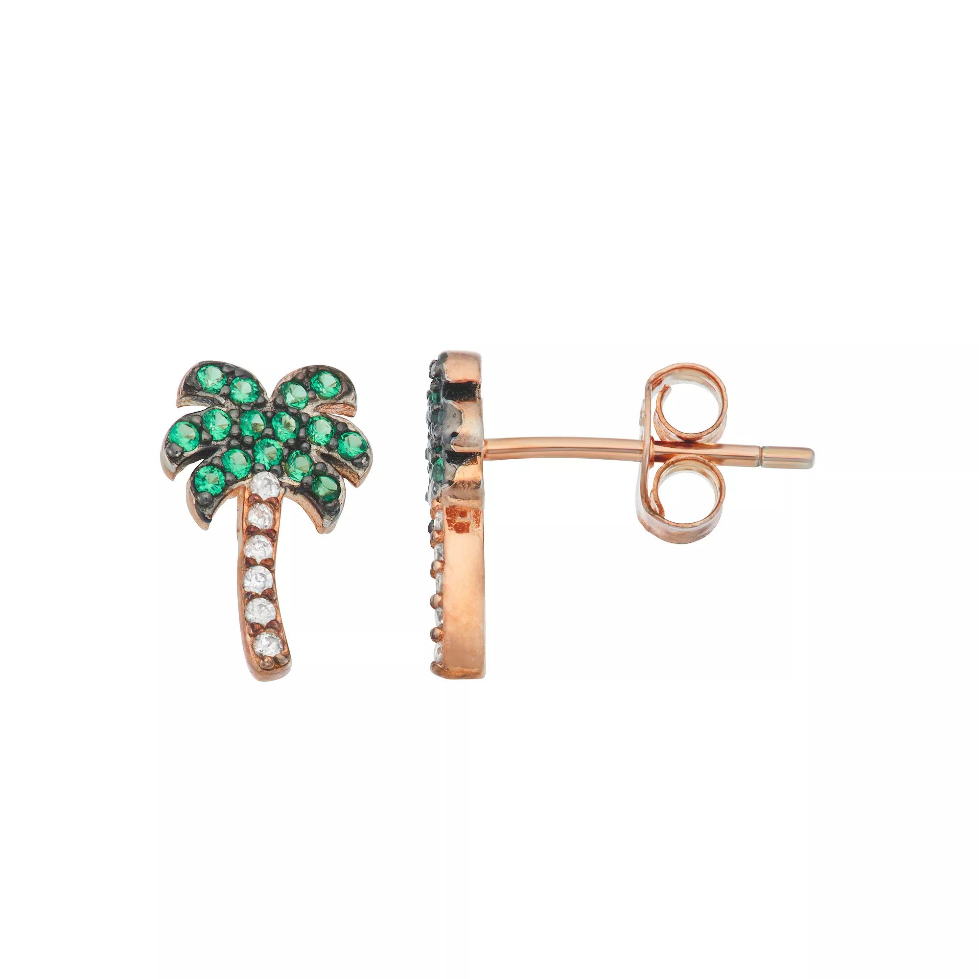 Accent your look with these adorable 18k rose gold over silver palm tree stud earrings from Contessa Di Capri, adorned with sparkling cubic zirconia and lab-created spinel stones. Accent your look with these adorable 18k rose gold over silver palm tree stud earrings from Contessa Di Capri, adorned with sparkling cubic zirconia and lab-created spinel stones. EARRING DETAILS Length: 10 mm Backings: post Metal: sterling silver Plating: 18k rose gold flash plated Finish: polished Packaging: boxed Nickel freeSTONE DETAILS Stone type: cubic zirconia, lab-created spinel Total weight: 1/3 ct. Shape: round Setting: pave Gemstones may have been treated to enhance their appearance. Special care may be required. Please visit our Gemstone Treatment & Special Care Guide for more information. Size: One Size. Color: Green. Gender: female. Age Group: adult.