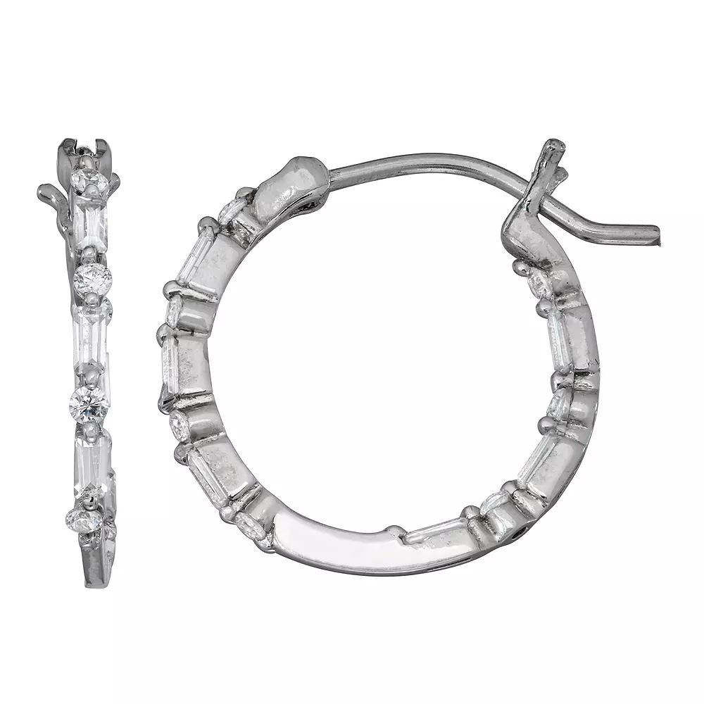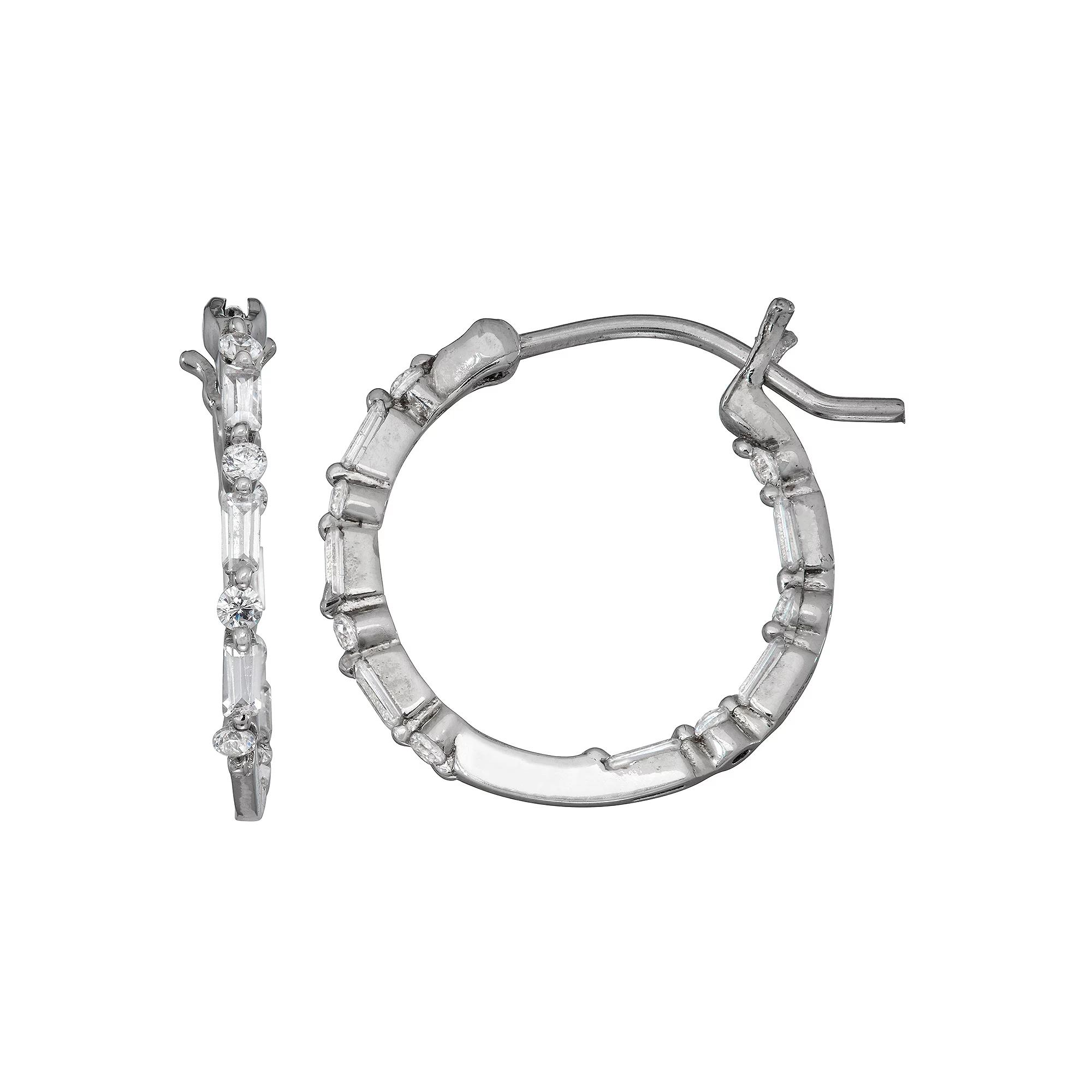These gorgeous Contessa Di Capri Cubic Zirconia Baguette Round Hoop Earrings are a must add to your fine jewelry collection. These gorgeous Contessa Di Capri Cubic Zirconia Baguette Round Hoop Earrings are a must add to your fine jewelry collection. Total weight: 2.2 grams Packaging: boxed Metal: sterling silver Plating: rhodium Finish: polished Nickel free EARRING DETAILS Earring length: 20 mm Backings: click-it STONE DETAILS Total carat weight: 1 1/4 ct. Setting: prong Stone shape: baguette cut, round Stone type: cubic zirconia Stone color: clear Size: One Size. Color: White. Gender: female. Age Group: adult.