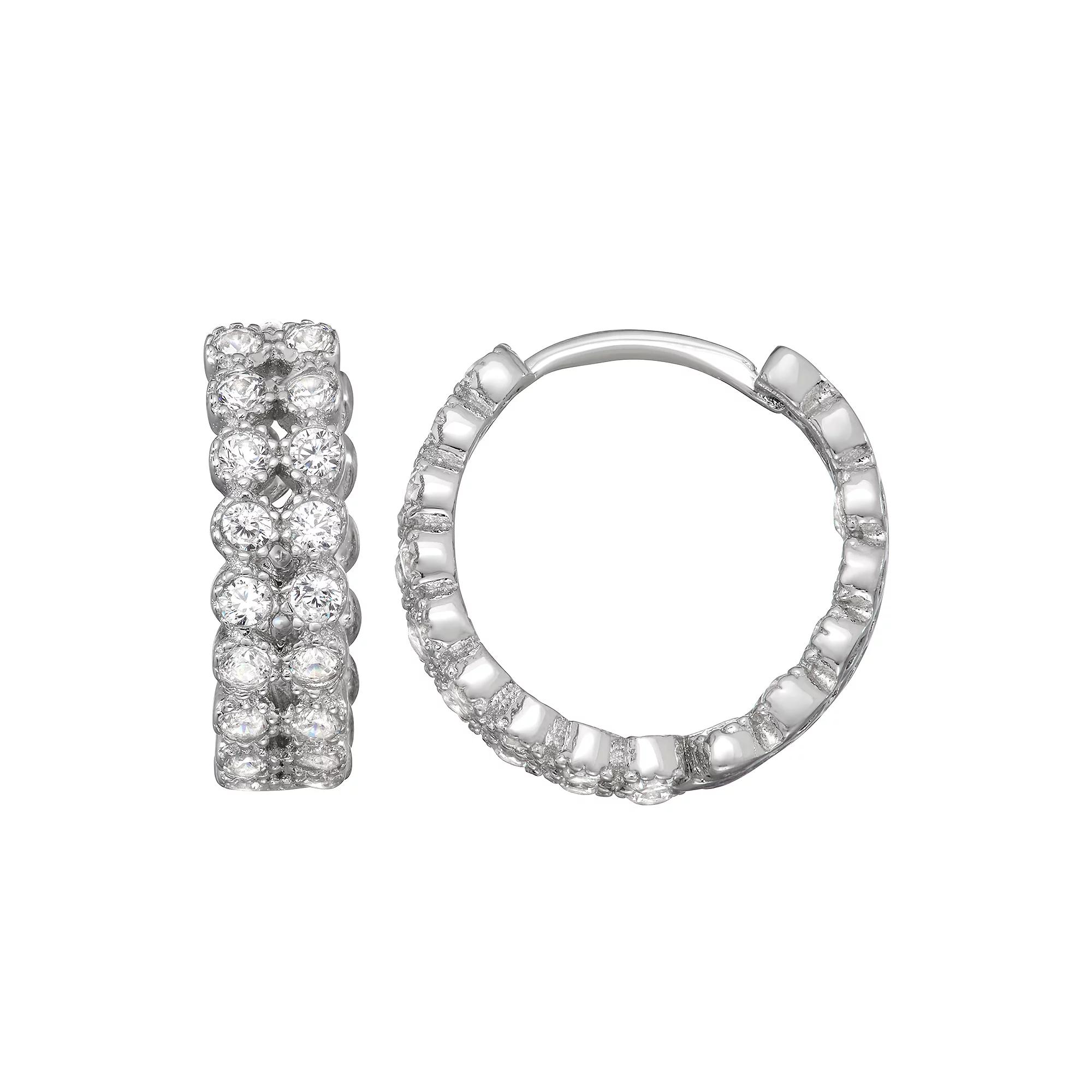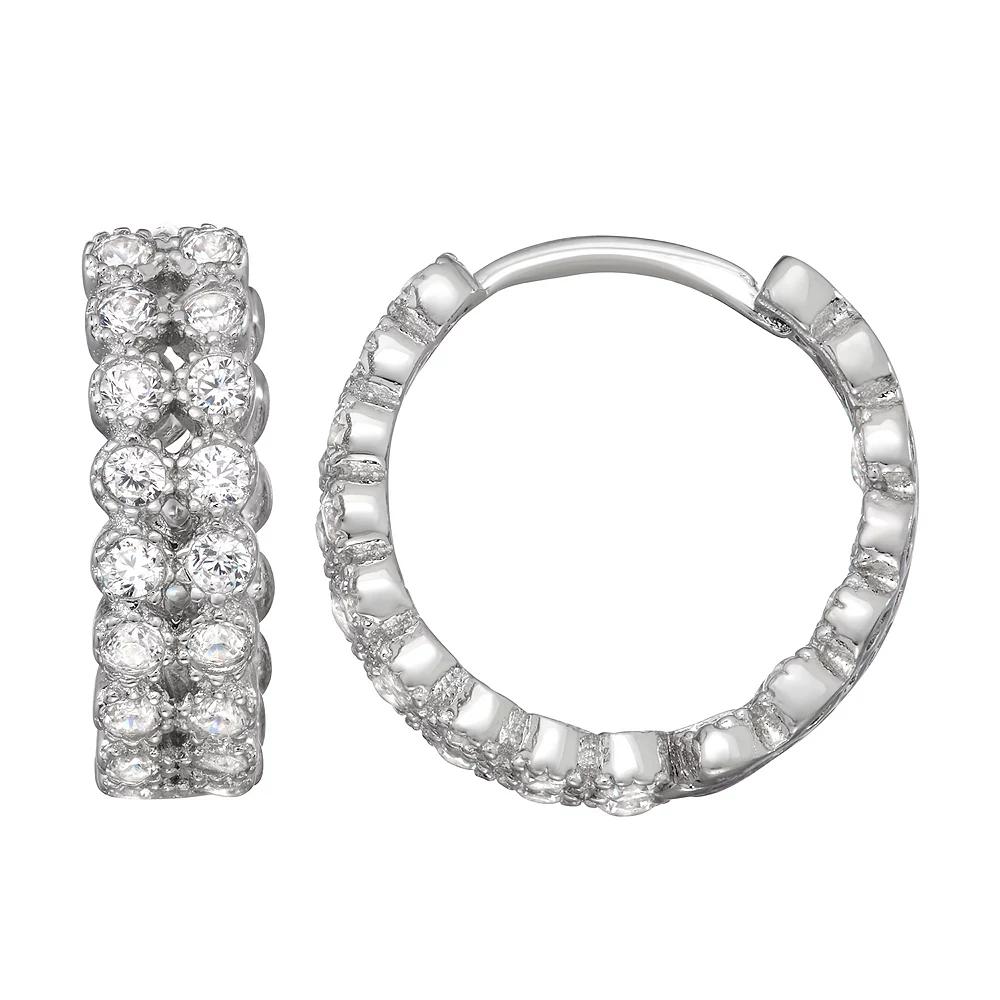 These gorgeous Contessa Di Capri Inside Out Hoop Earrings are must add to your fine jewelry collection. These gorgeous Contessa Di Capri Inside Out Hoop Earrings are must add to your fine jewelry collection. Total weight: 2.9 grams Packaging: boxed Metal: sterling silver Plating: rhodium Finish: polished Nickel free EARRING DETAILS Backings: click-it Earring length: 15 mm STONE DETAILS Total carat weight: 1 ct. Setting: bezel Stone shape: round Stone type: cubic zirconia Stone color: clear Size: One Size. Color: White. Gender: female. Age Group: adult.