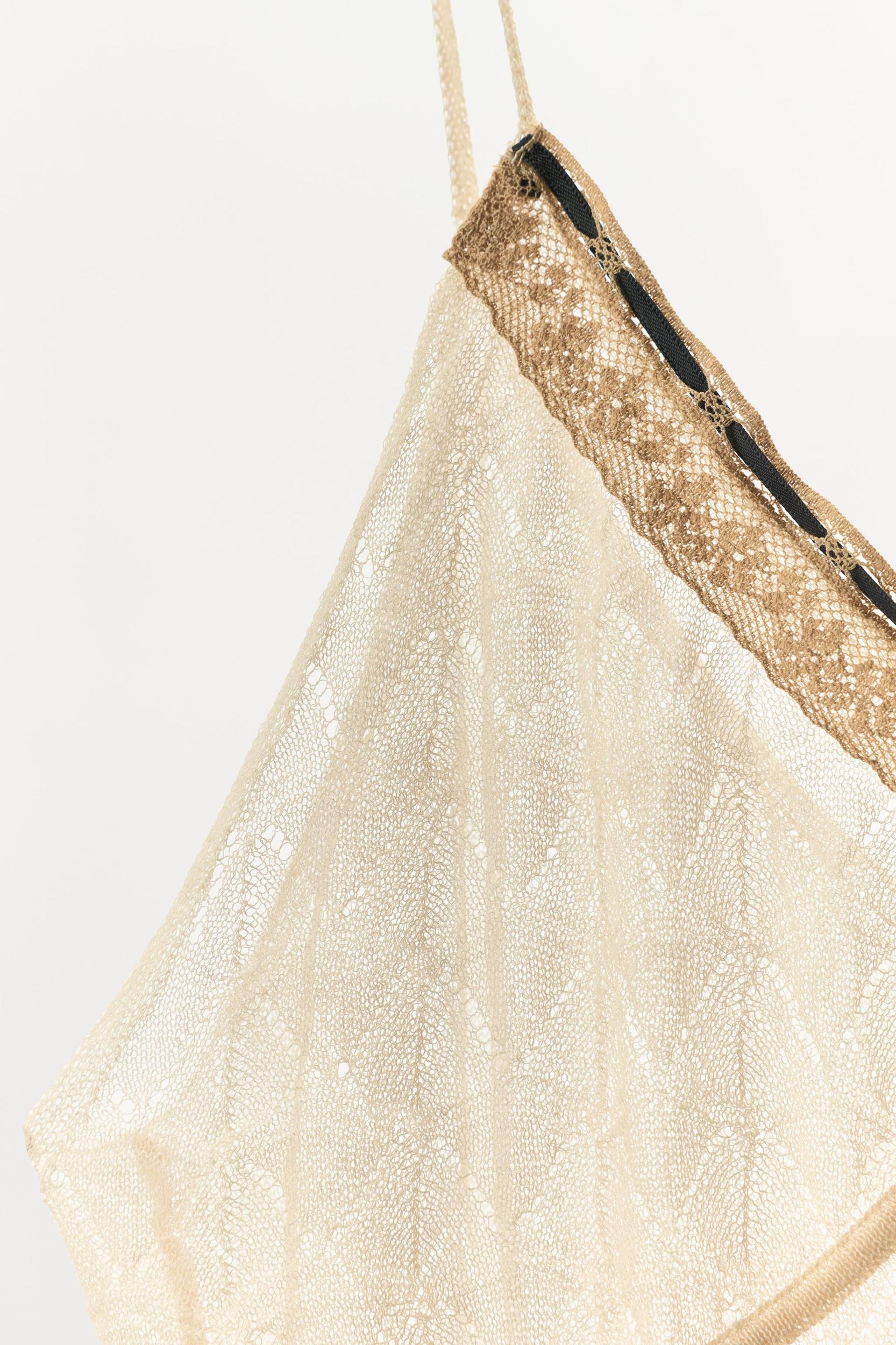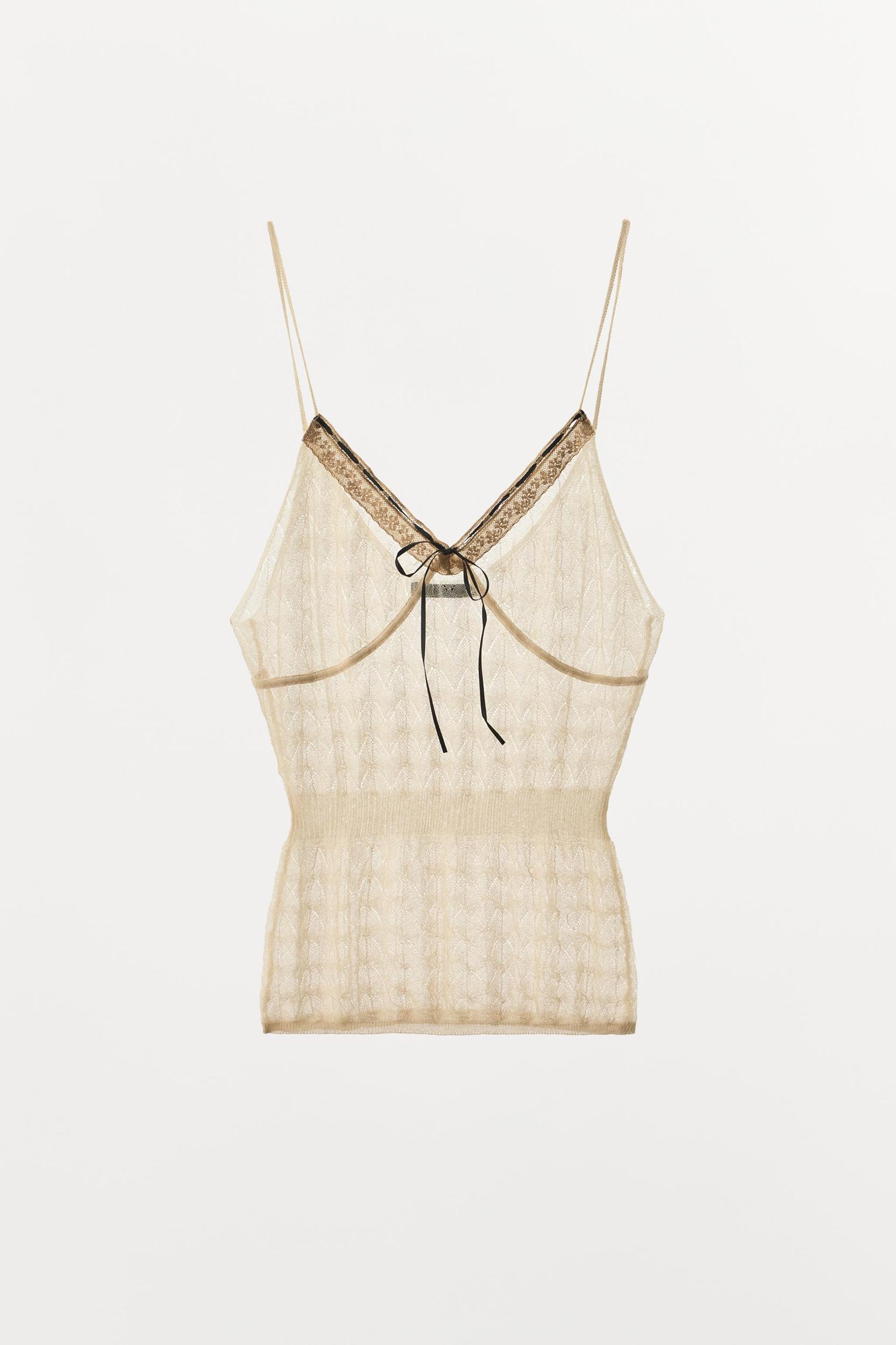 Semi-sheer top made of fine knit fabric. Round neckline and thin straps. Marked seam detail on the chest. Contrasting satin bow appliqué.