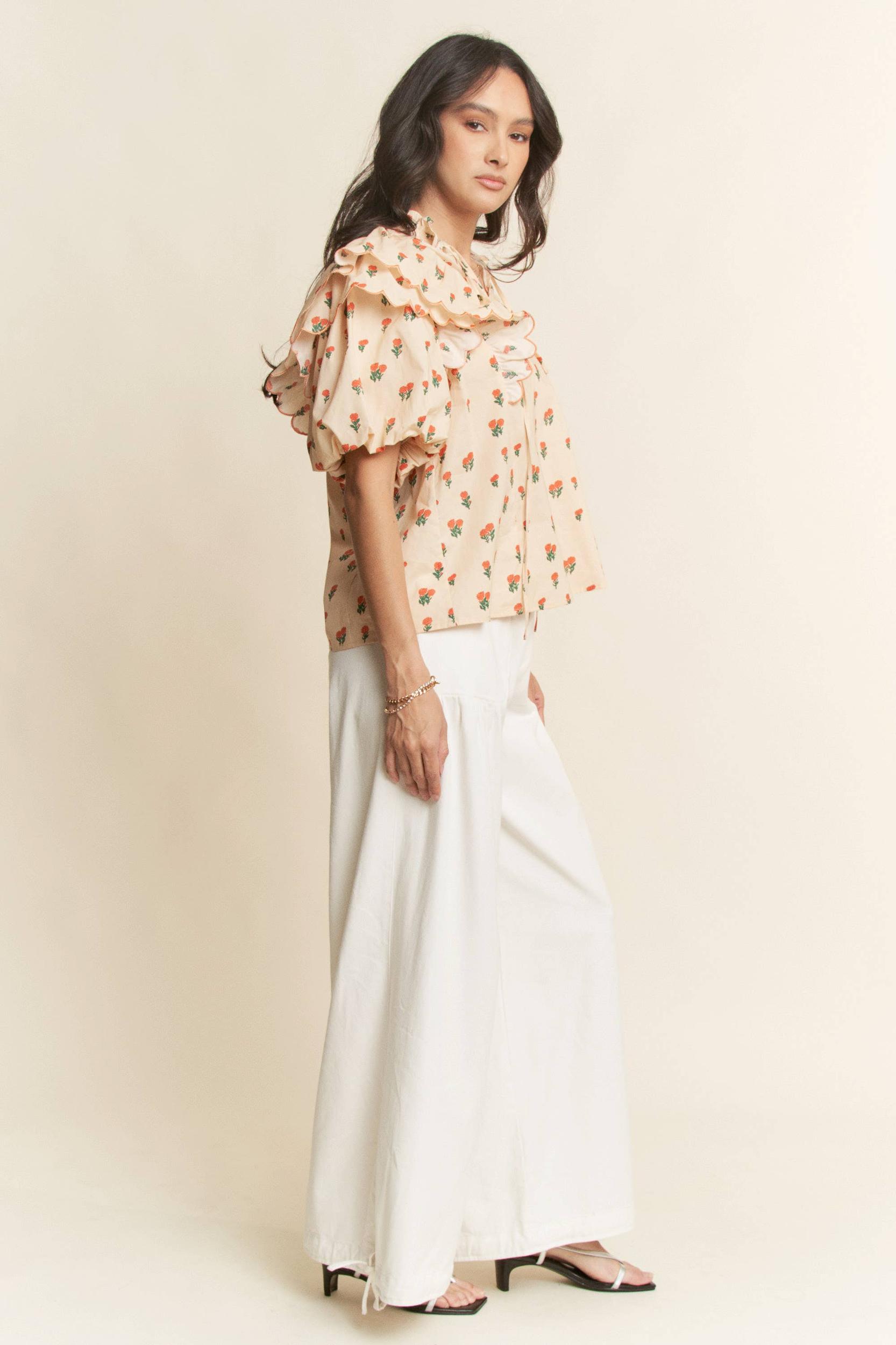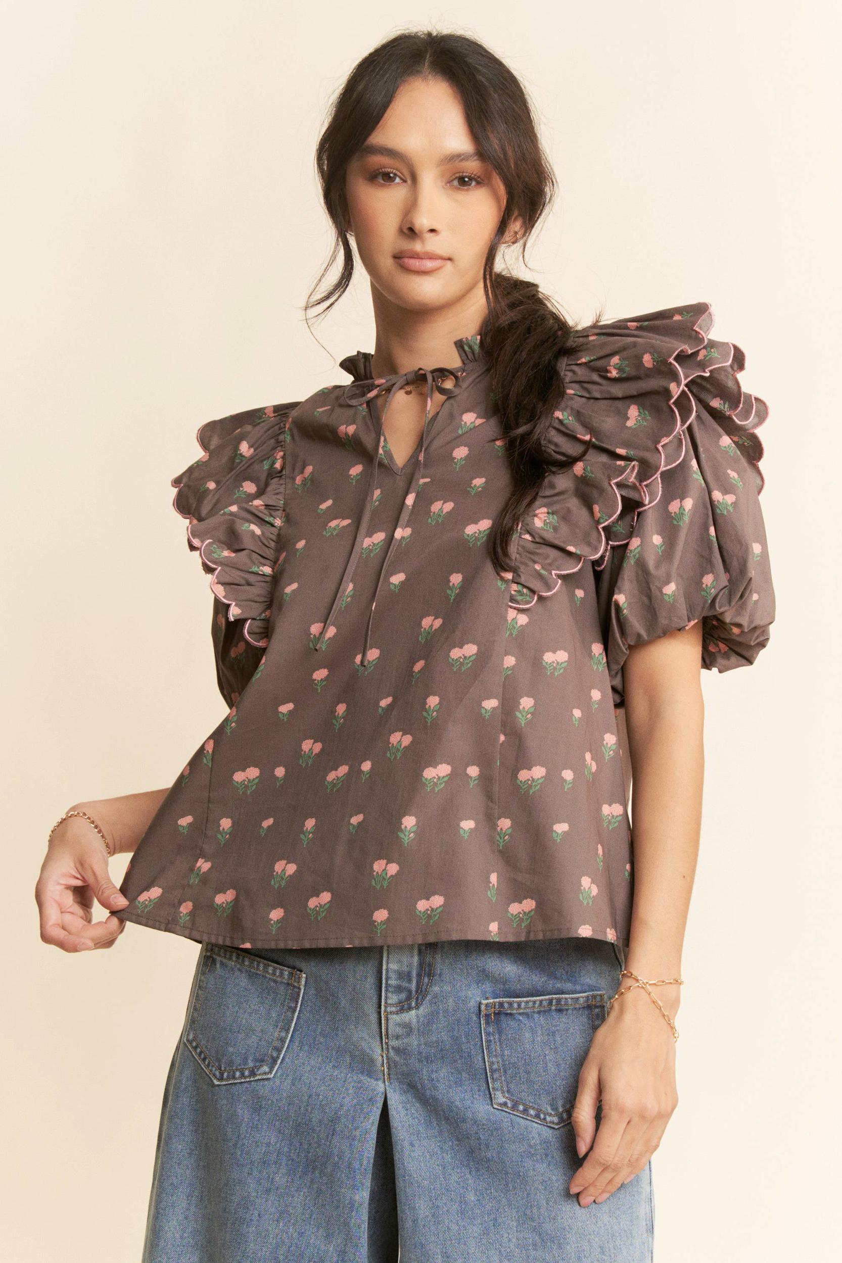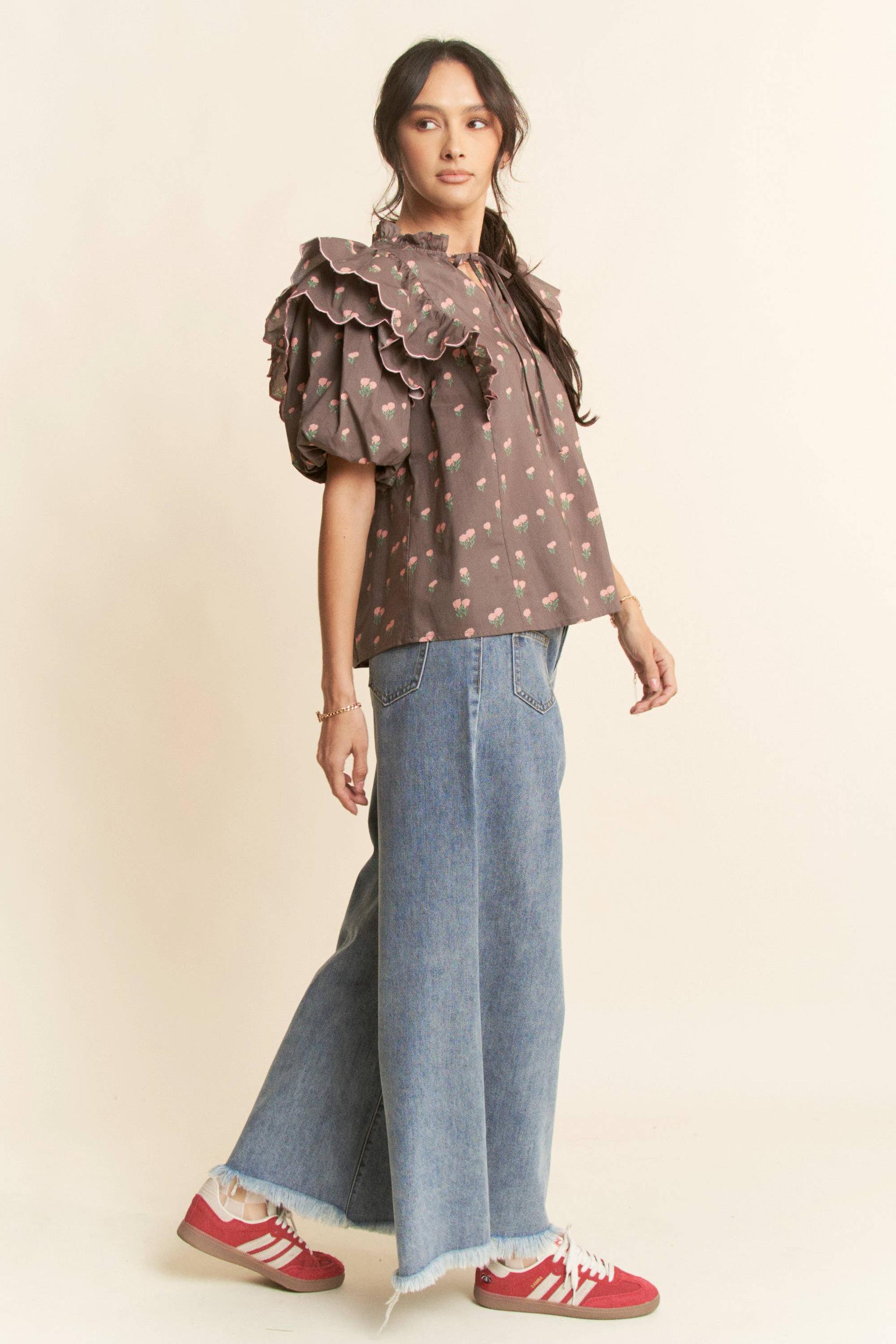 CONTRAST EDGE RUFFLE PUFF SLEEVE BLOUSE TOP: MOCHA BROWN