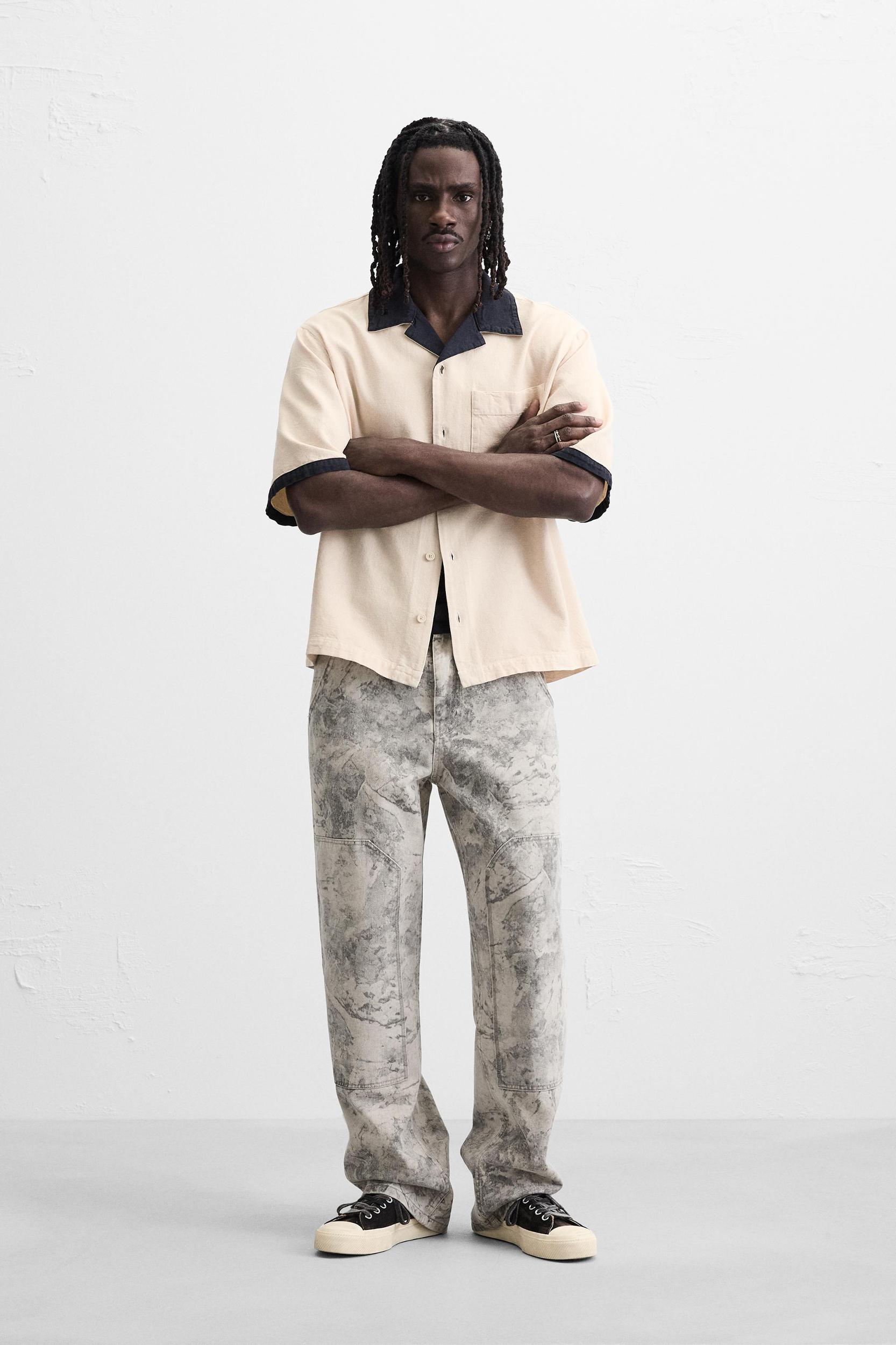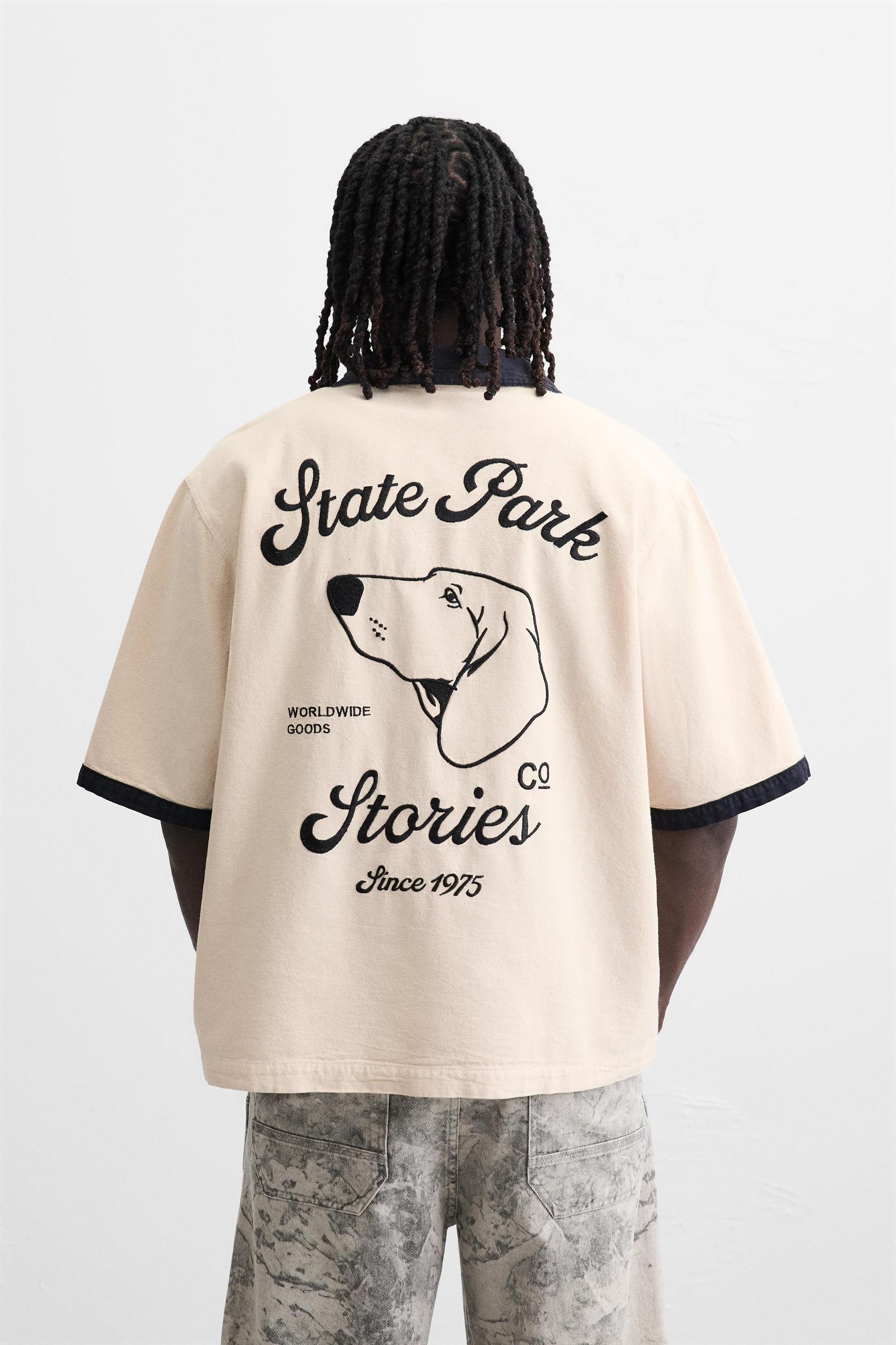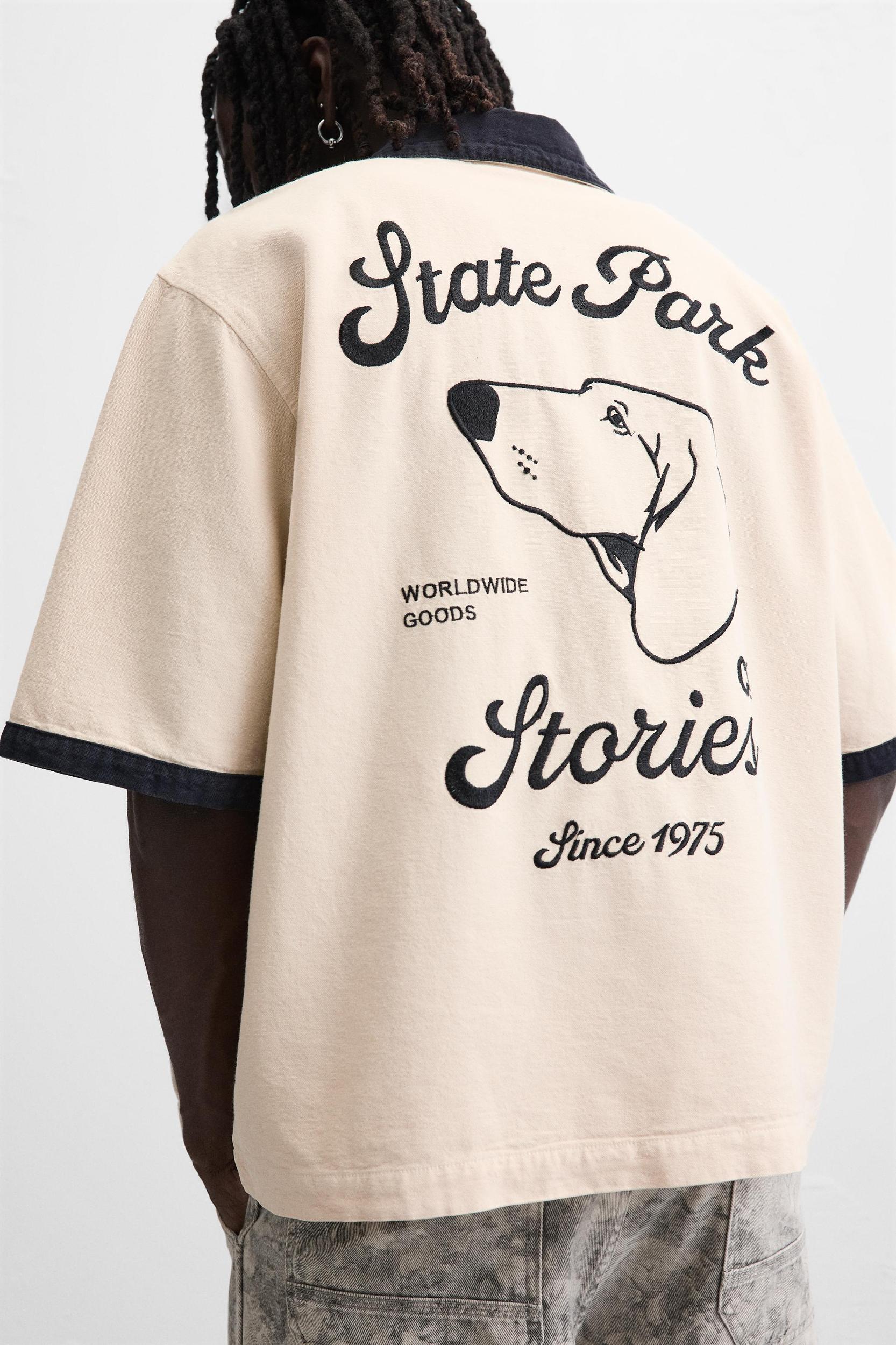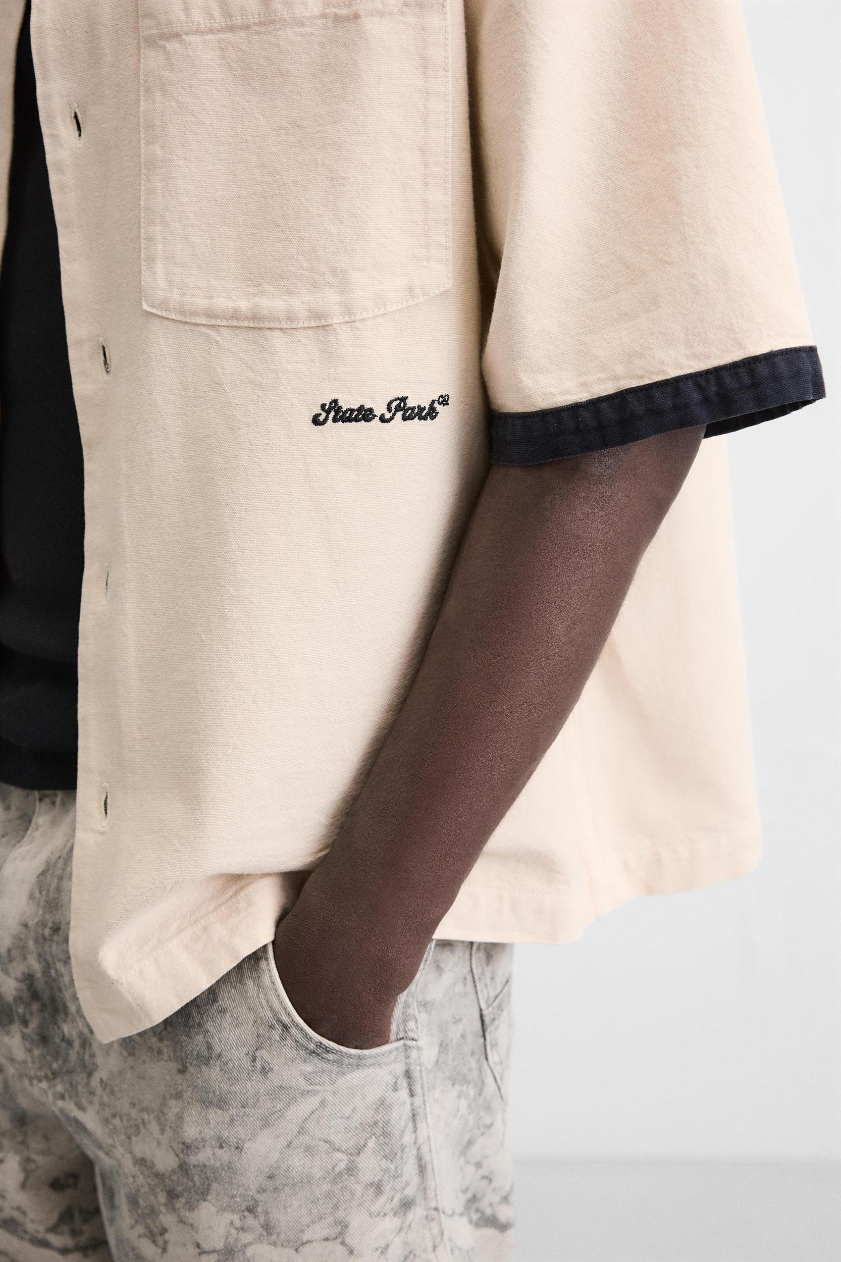 Relaxed fit shirt made of cotton fabric. Contrasting spread collar and short sleeves. Patch pocket at chest. Contrasting embroidery on front and back. Front button closure.