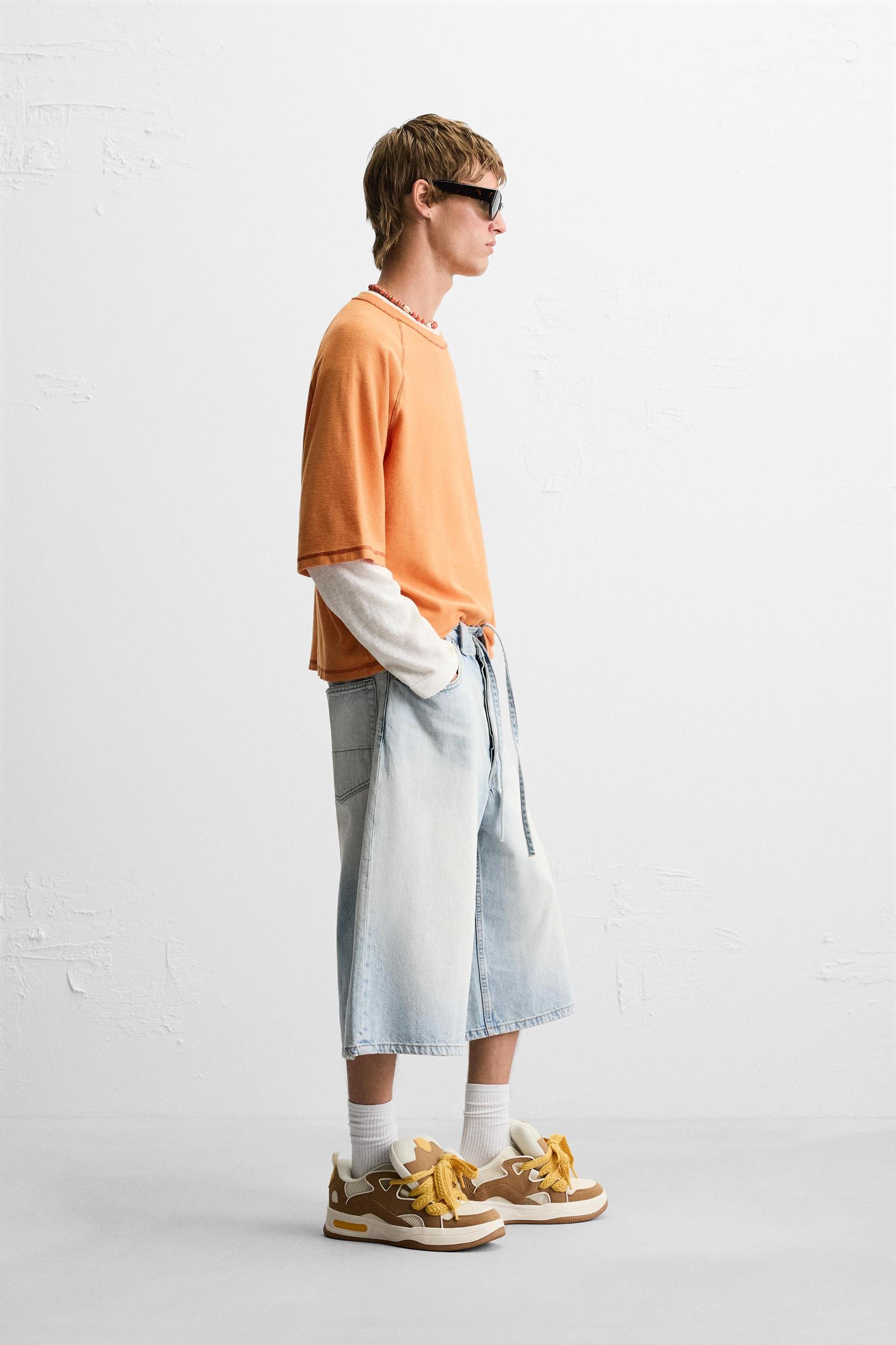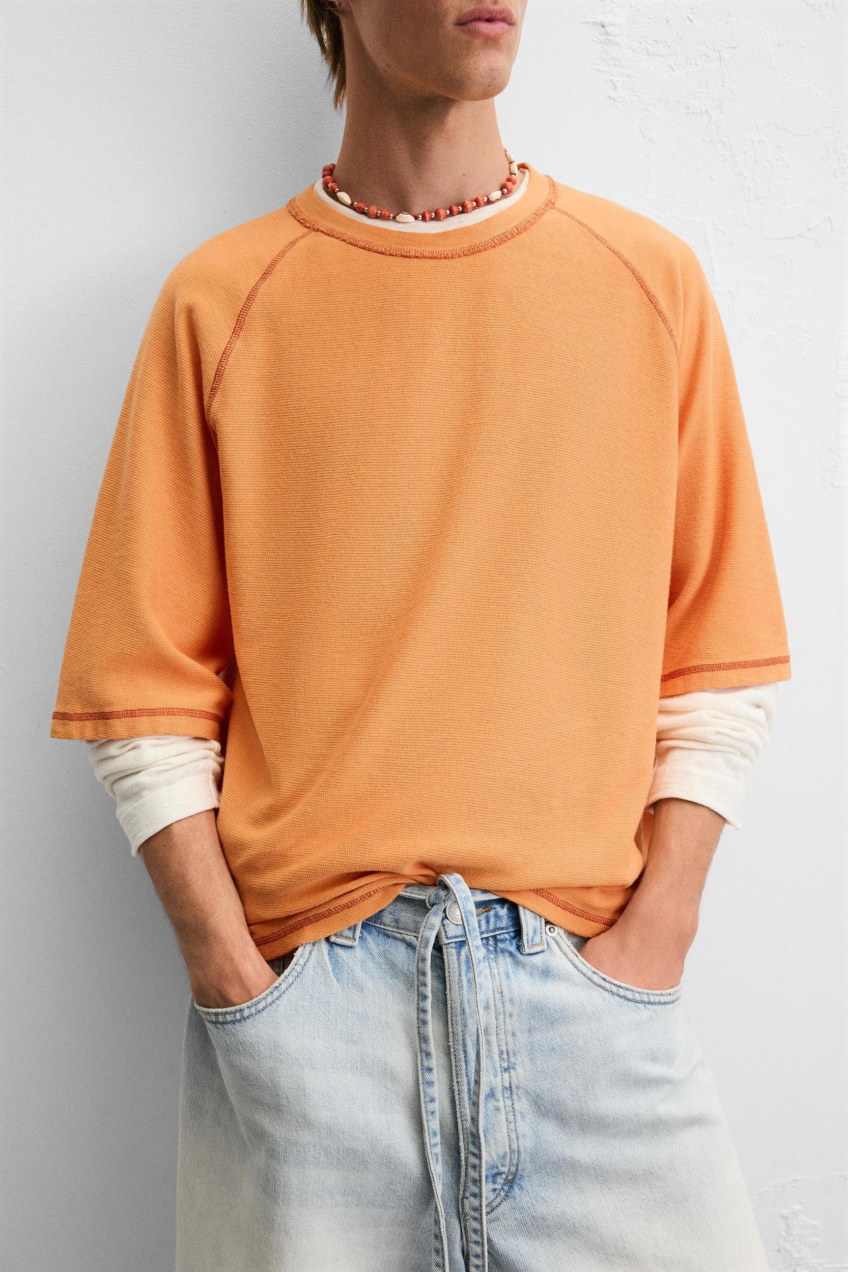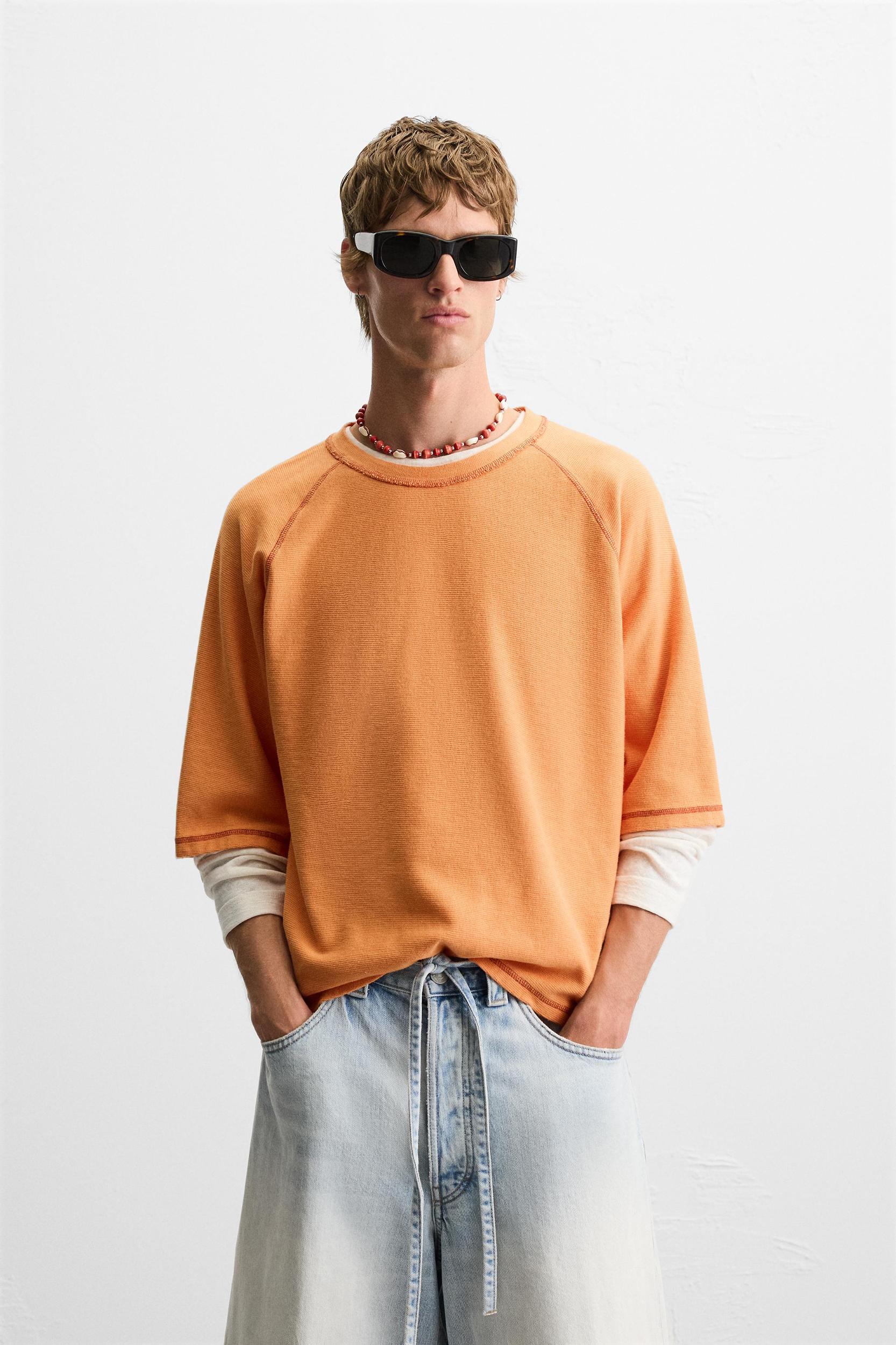 Boxy fit knit T-shirt made of cotton yarn. Round neck and short sleeves. Contrasting combined seam detail.