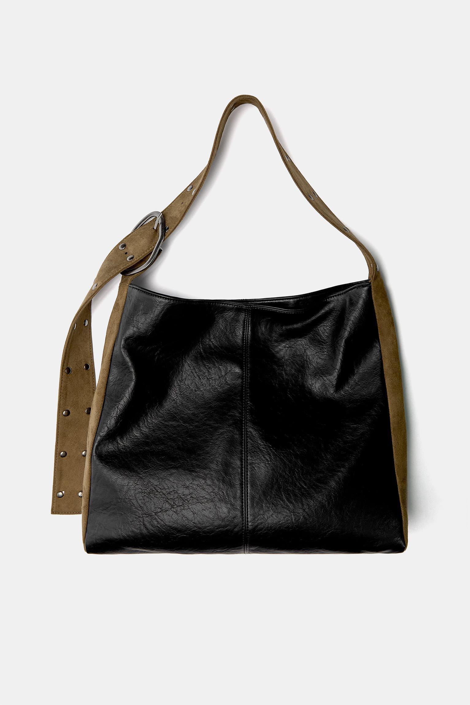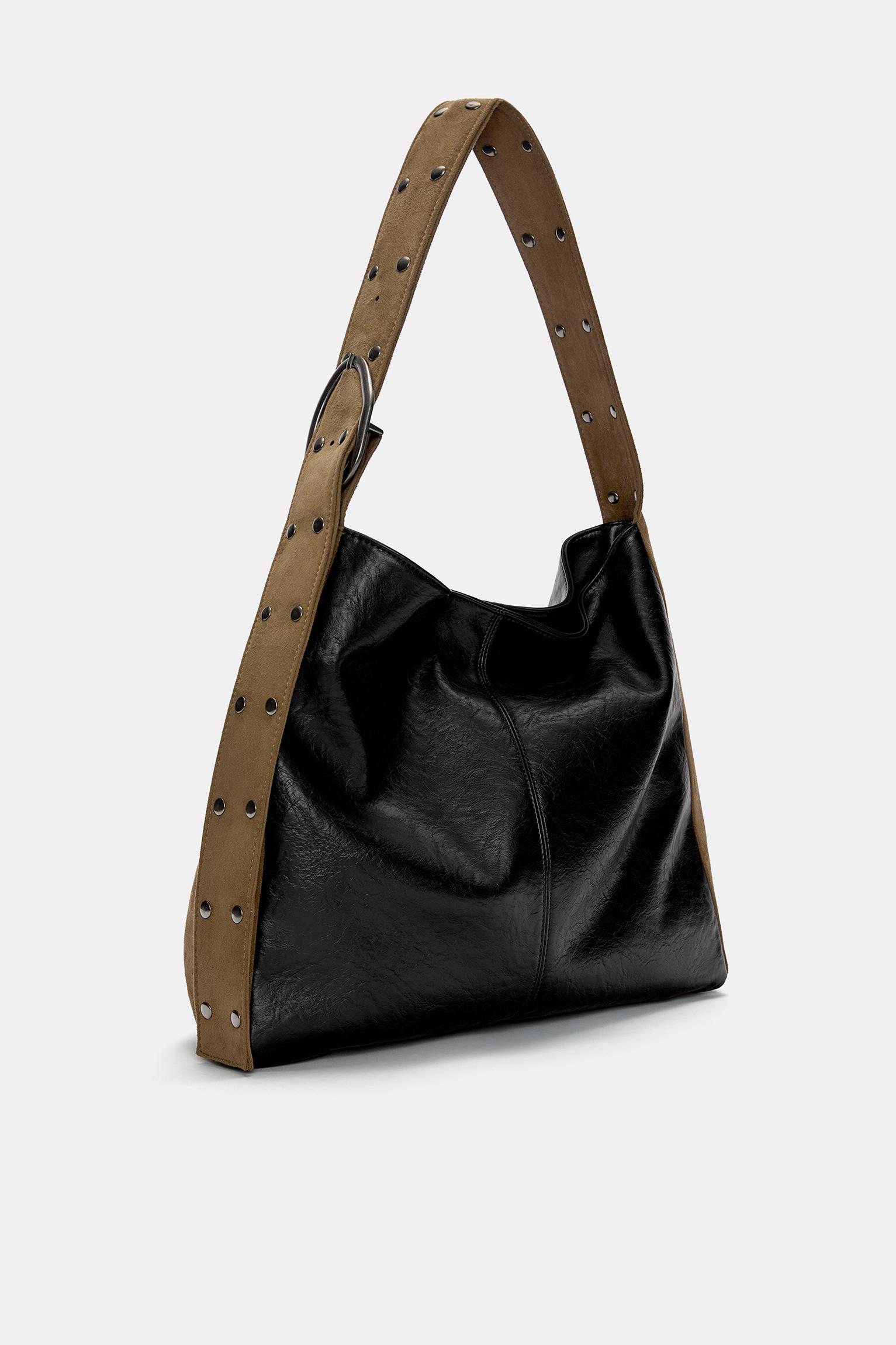 Faux leather fabric shopper bag. Available in black. Stud details. Wide adjustable contrast brown strap. Magnetic clasp closure. Height x Length x Width: 37 x 33.7 x 13.7 cm.