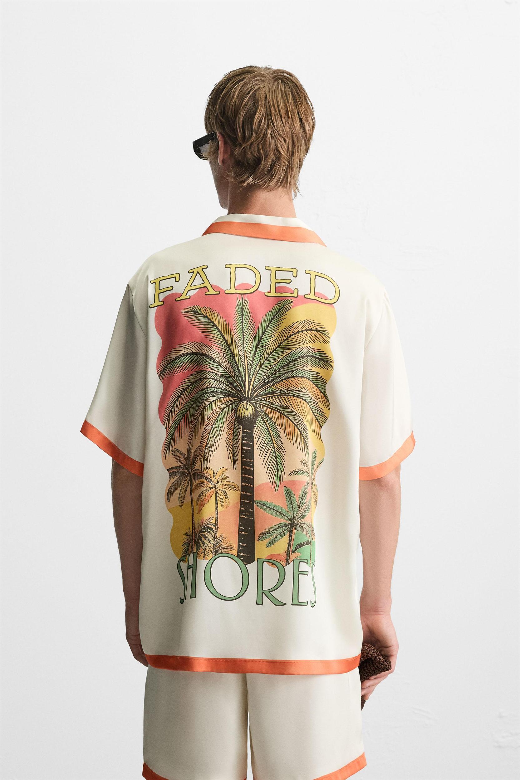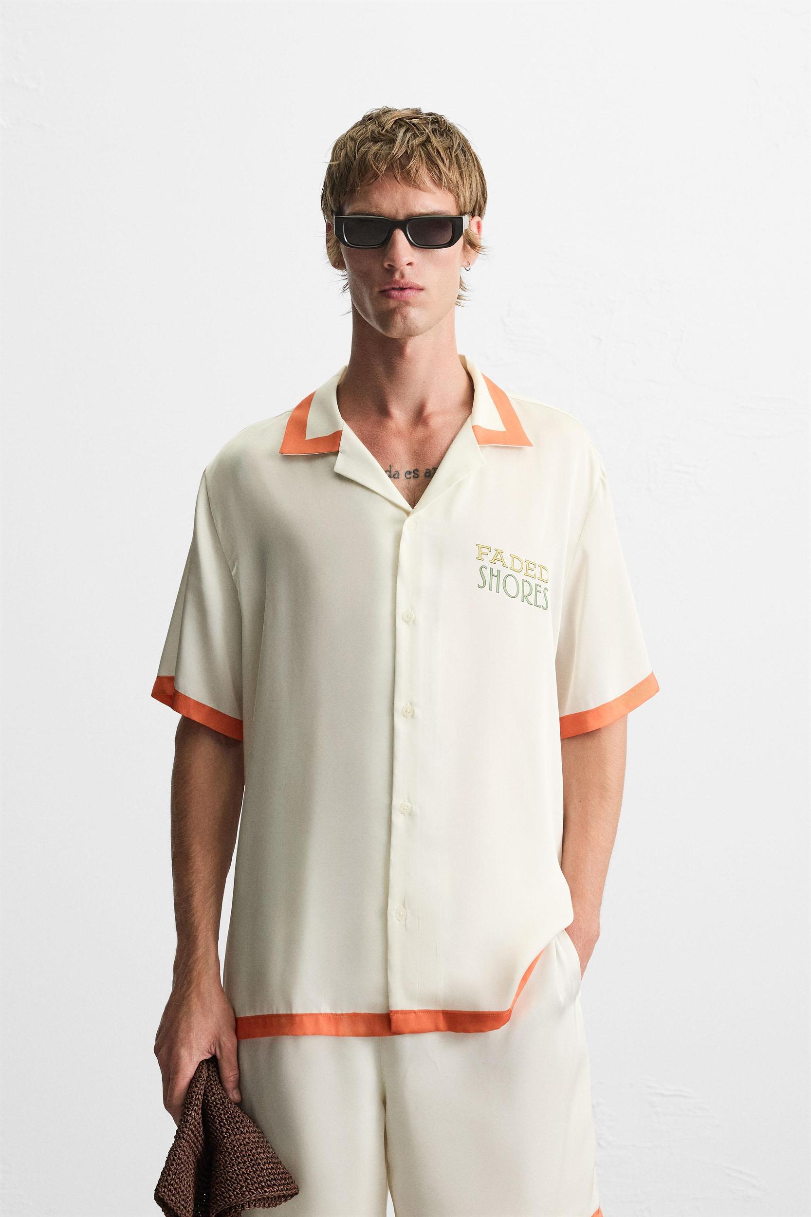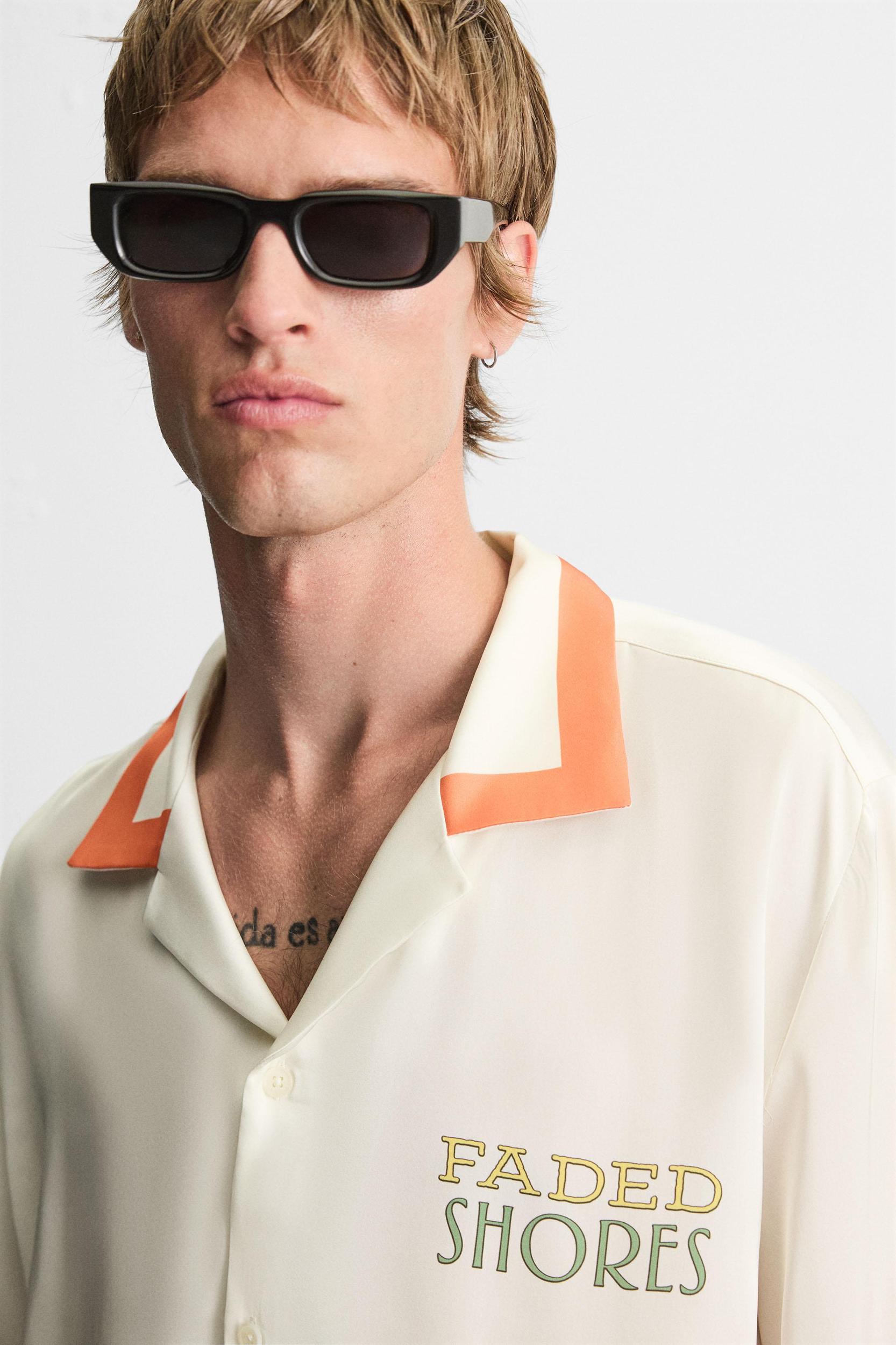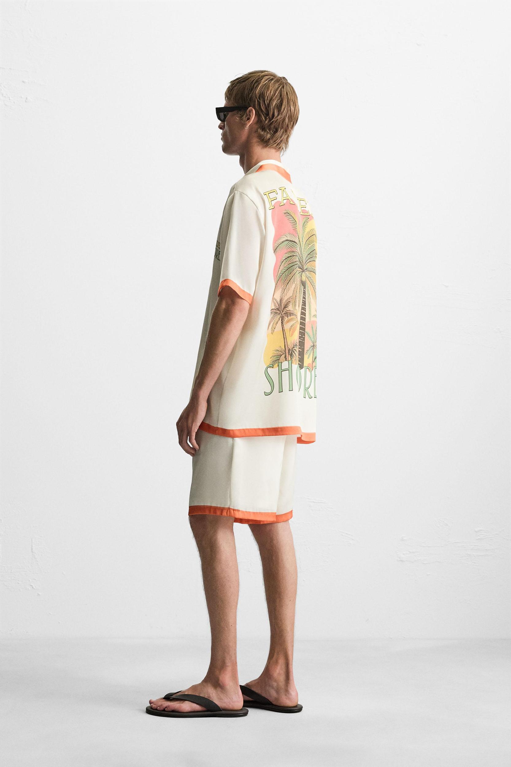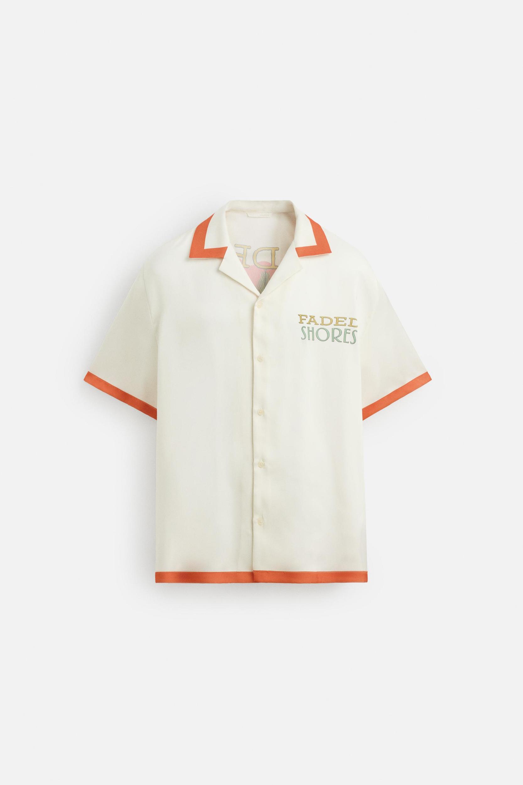 Relaxed fit shirt made of lightweight satin fabric. Spread collar and short sleeves. Contrasting front and back print. Finished with contrasting printed stripes. Front button closure.