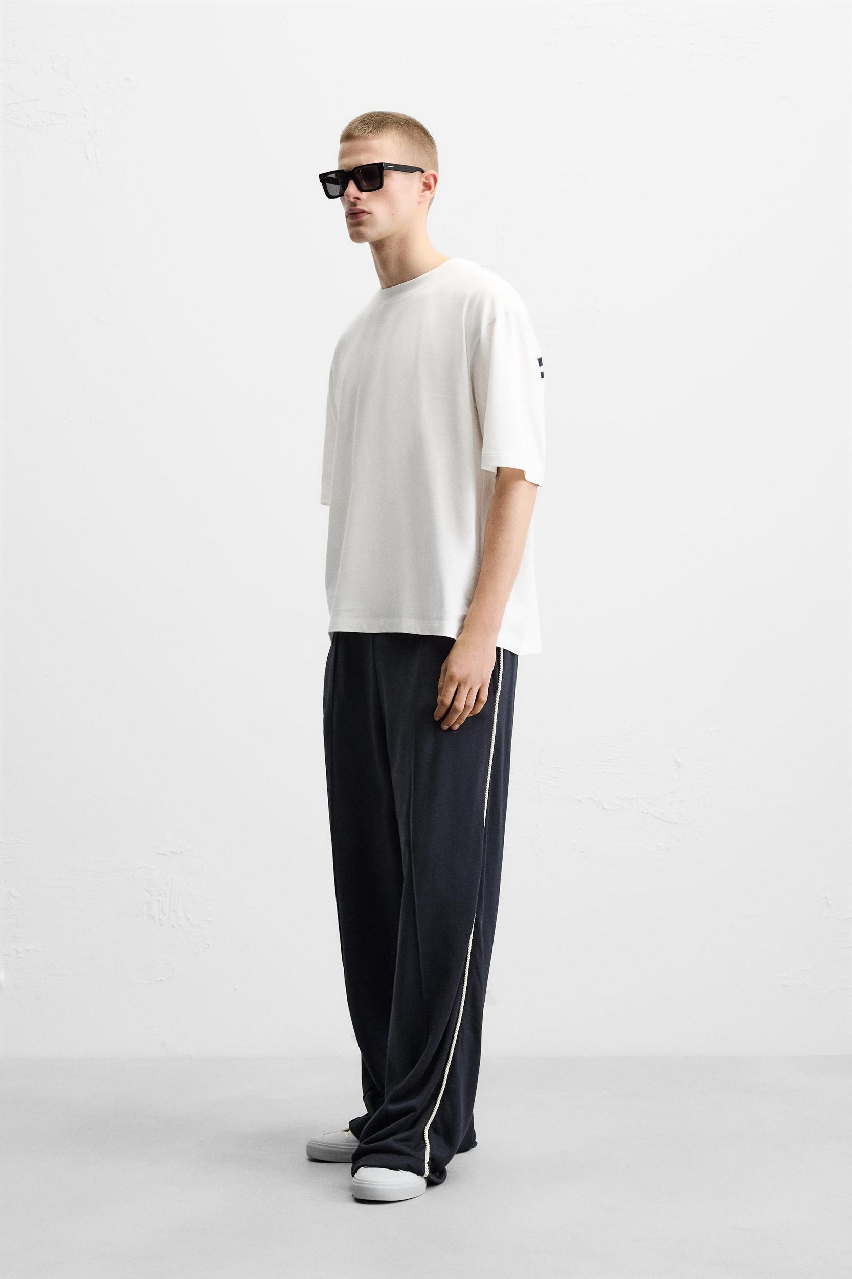 Relaxed fit T-shirt. Round neck and short sleeves. Horizontal stripe appliqué on chest.