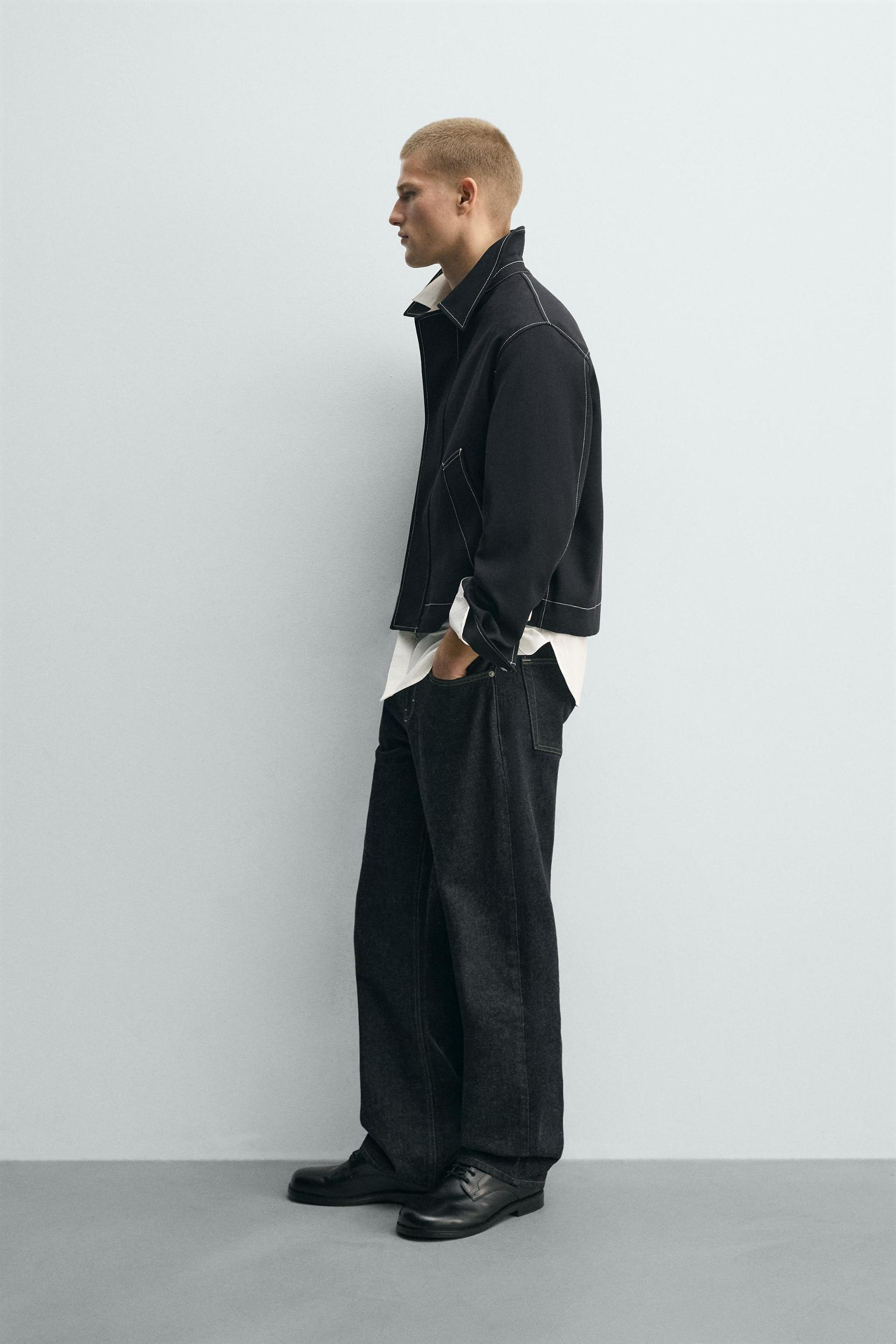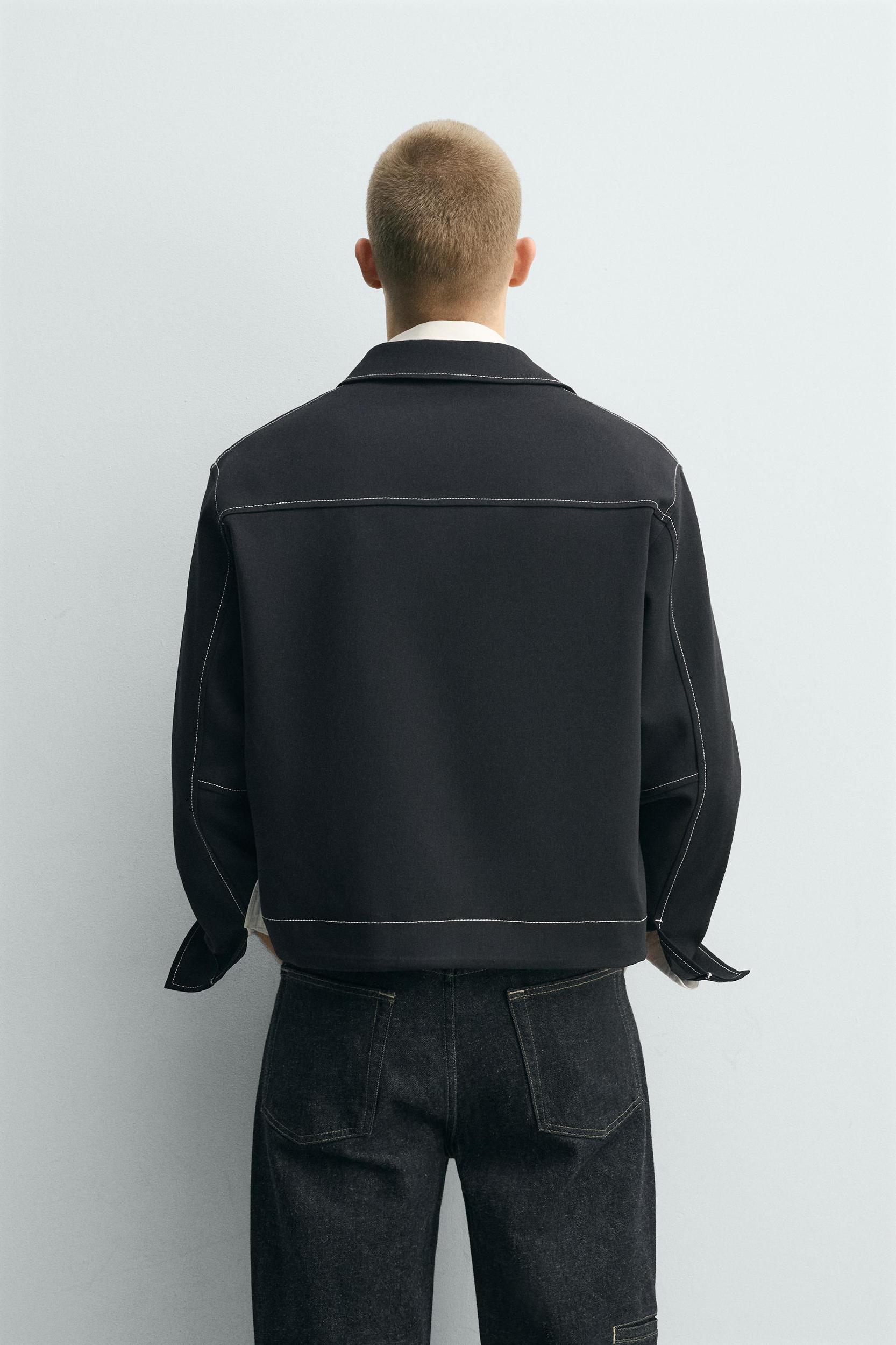 Regular fit overshirt made from viscose fabric. Lapel collar and long sleeves with buttoned cuffs. Welt pockets at the hips and an interior pocket detail. Contrasting topstitching throughout the garment. Front zip closure concealed by a flap with buttons.